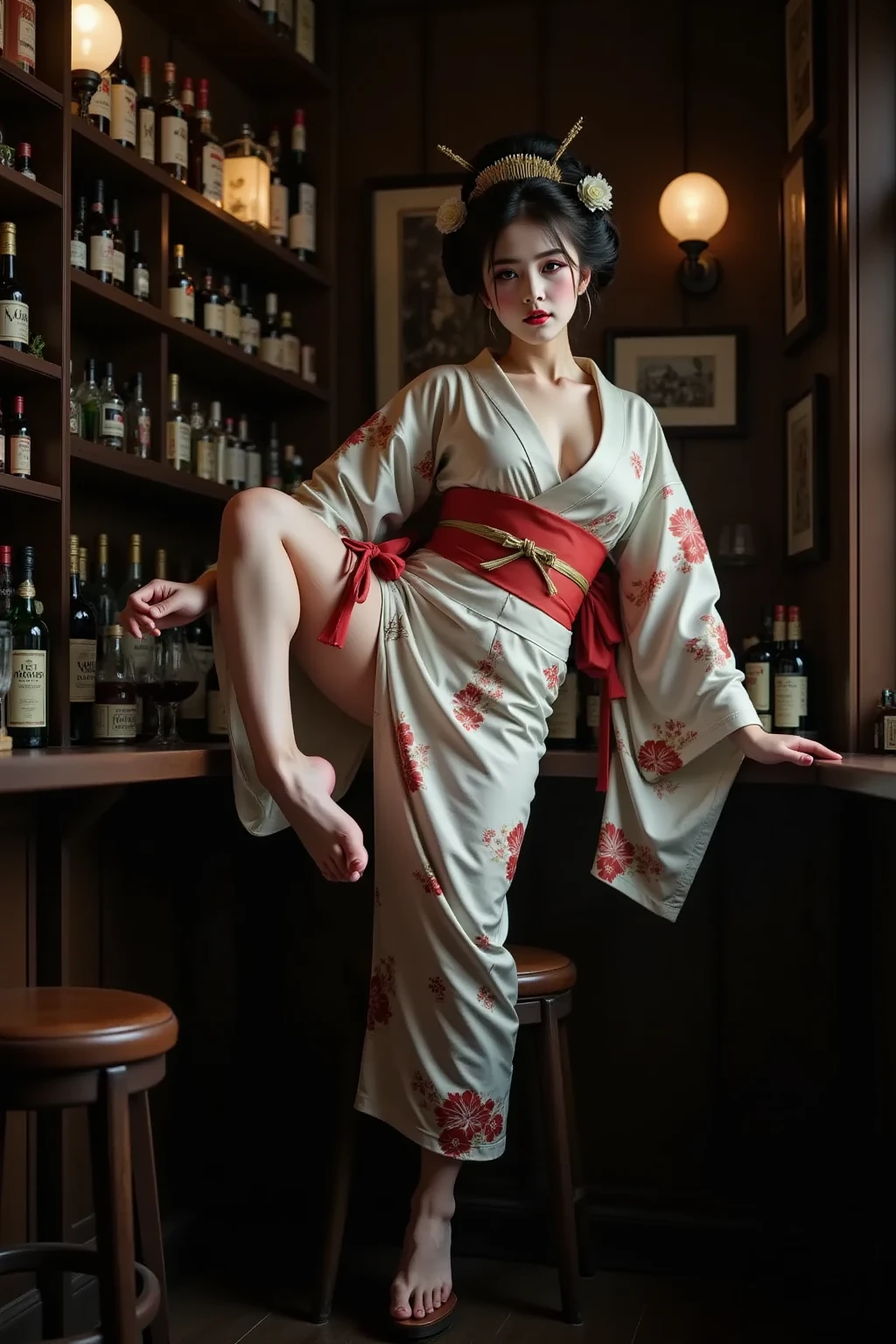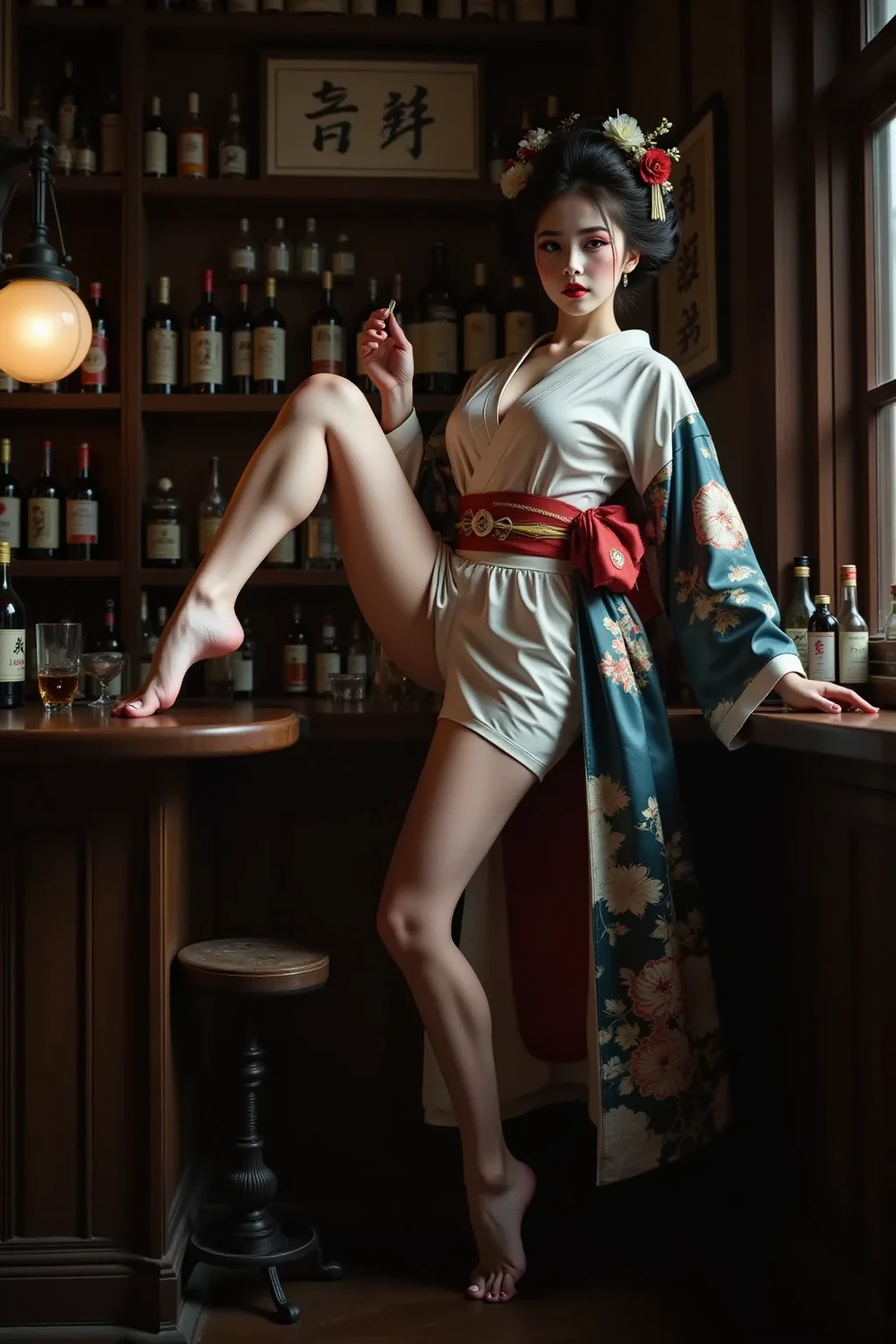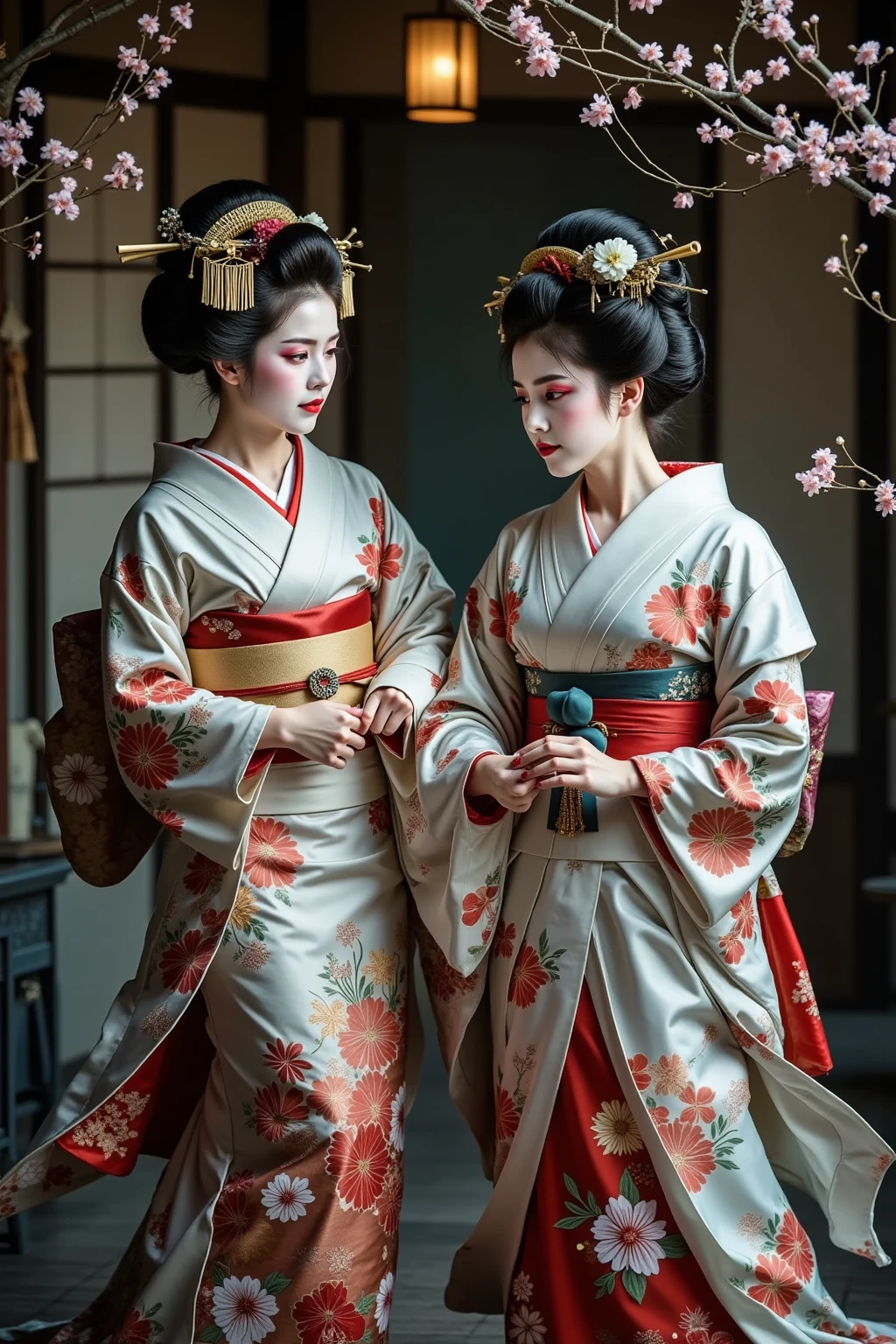 日本髪の女,a woman with a striking gaze is captured in a portrait. her hair is styled in a voluminous updo,adorned with delicate white flowers. she wears a light blue kimono with intricate floral patterns and a red sash. her makeup is bold and dramatic,with dark eyeliner and red lipstick. the setting appears to be a traditional japanese room with a blue wall and a patterned curtain. the lighting is soft and diffused,highlighting the contours of her face and the intricate details of her clothing.