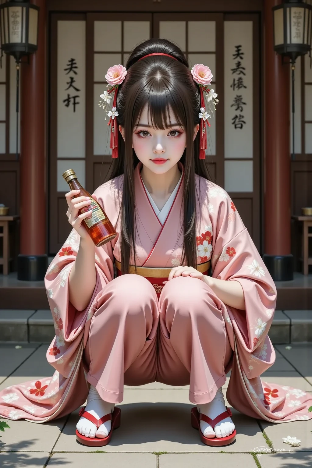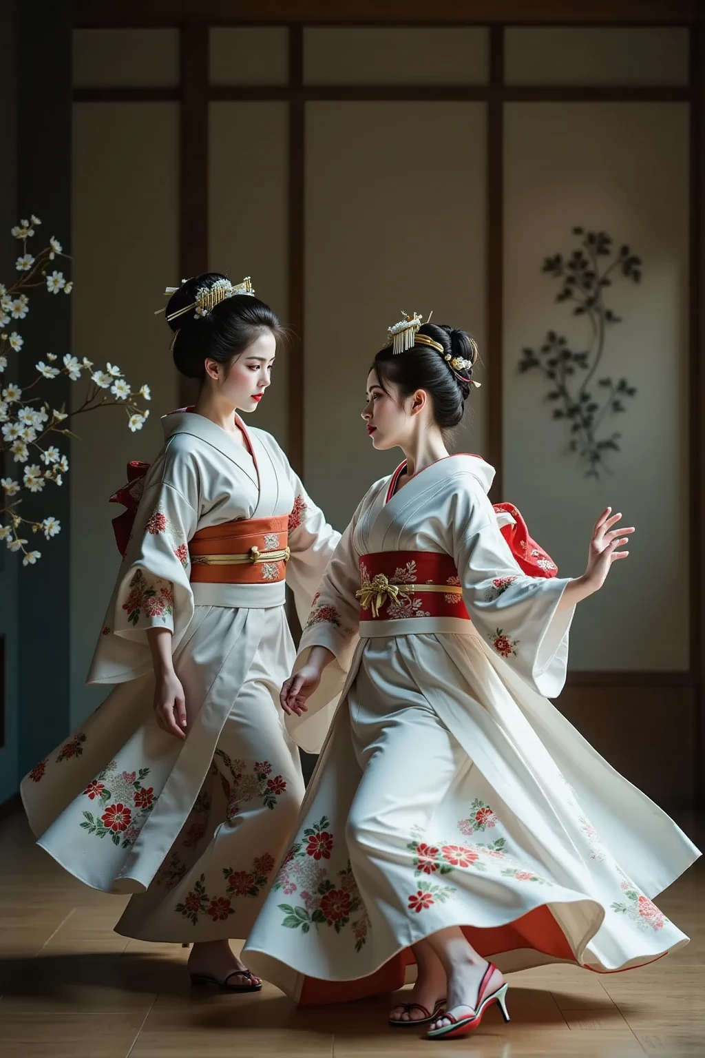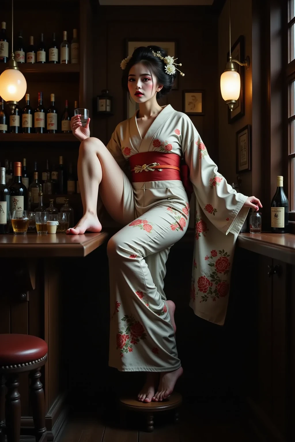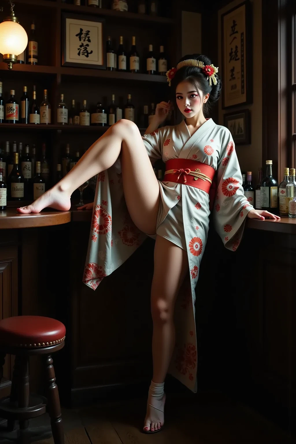 日本髪の女,a woman with a striking gaze is captured in a portrait. her hair is styled in a voluminous updo,adorned with delicate white flowers. she wears a light blue kimono with intricate floral patterns and a red sash. her makeup is bold and dramatic,with dark eyeliner and red lipstick. the setting appears to be a traditional japanese room with a blue wall and a patterned curtain. the lighting is soft and diffused,highlighting the contours of her face and the intricate details of her clothing.