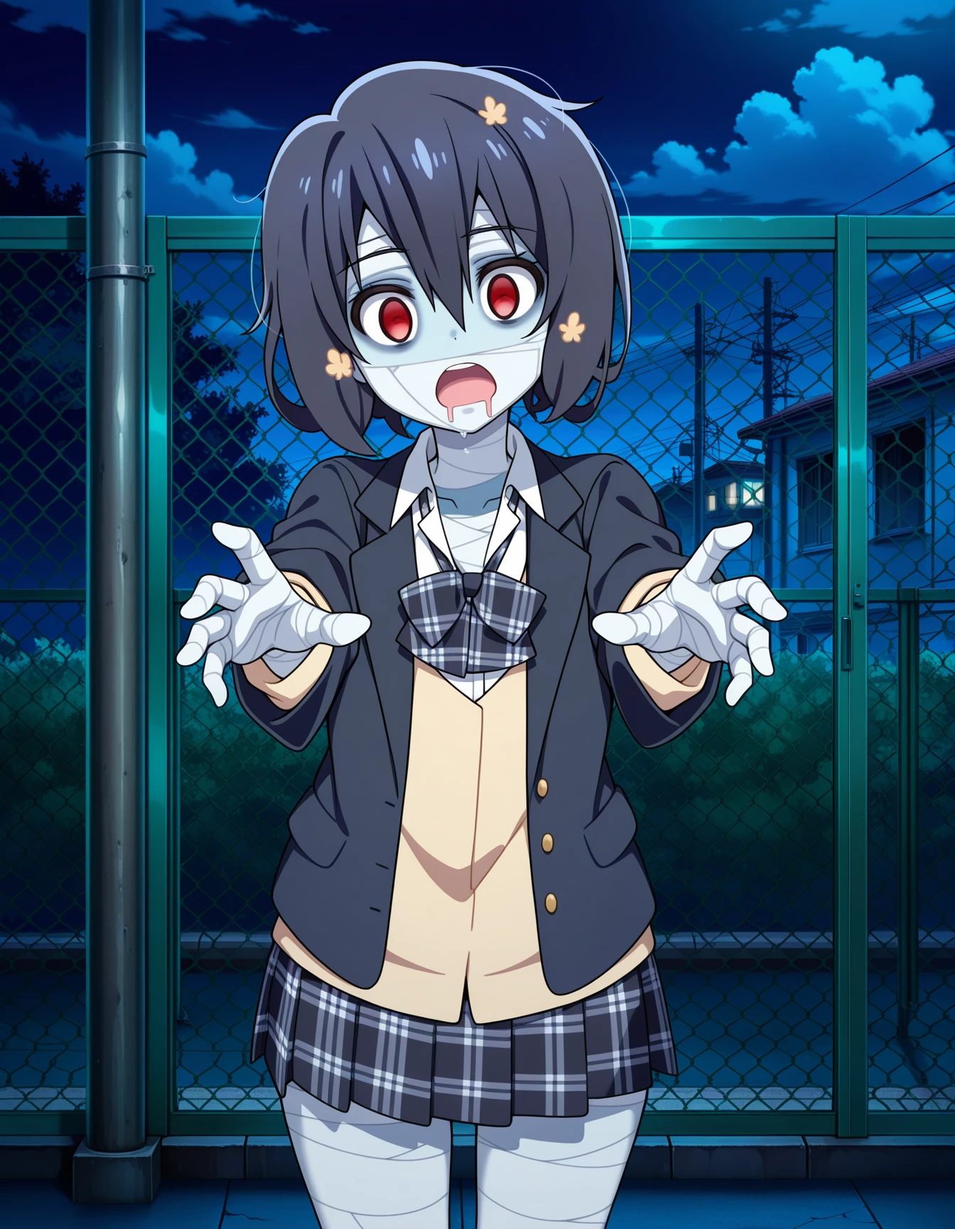 Appearance(Zombie): mizuno ai, zombie girl, blue skin, bandage on face, mini hair flower, short hair, hair between eyes, bags around eyes, small breasts, bandaged arm, bandaged legs,