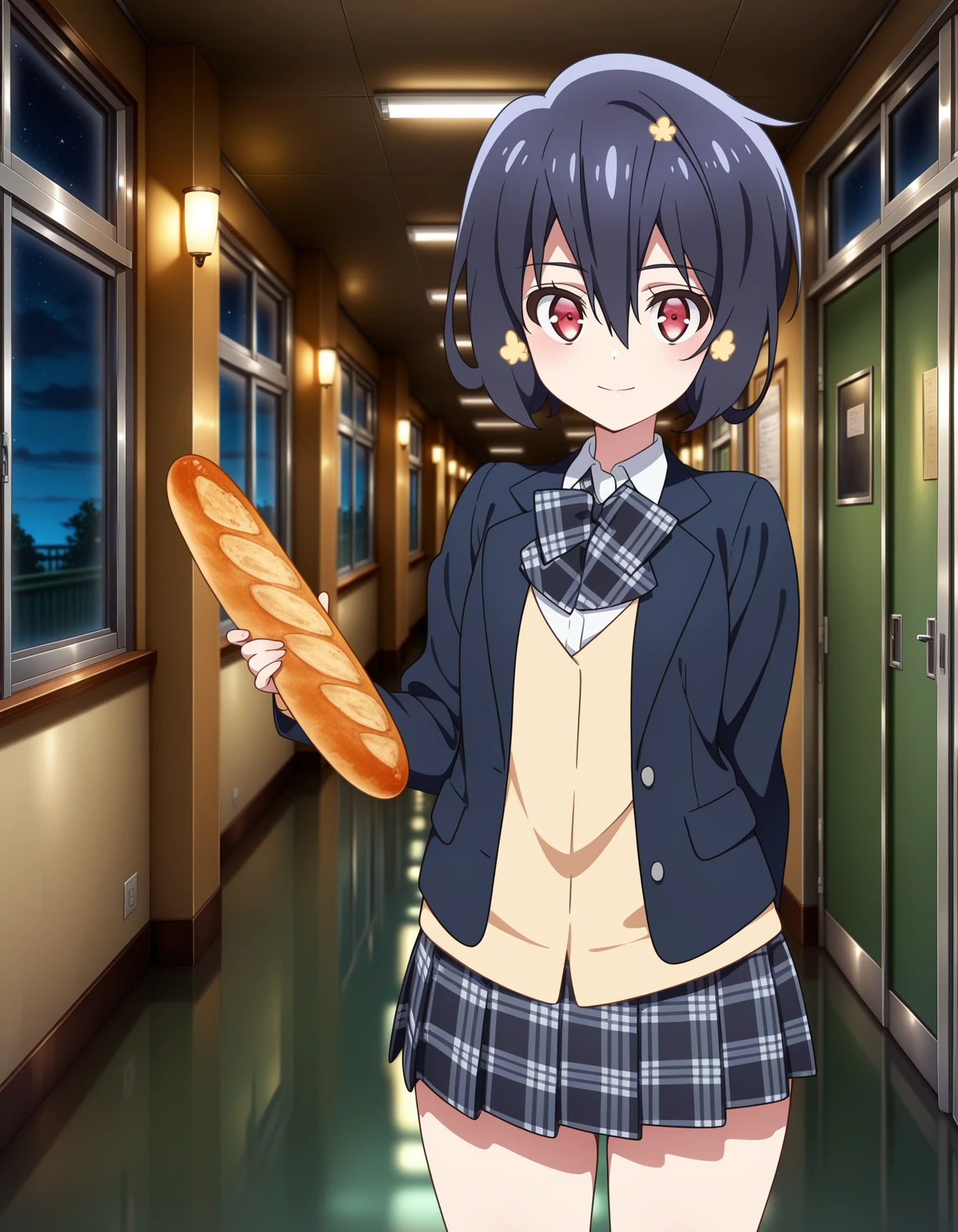 School Uniform: MA school uniform, blazer, black bowtie, plaid bowtie, white collared shirt, cardigan, plaid miniskirt, black socks, loafers,