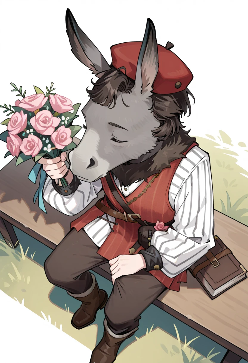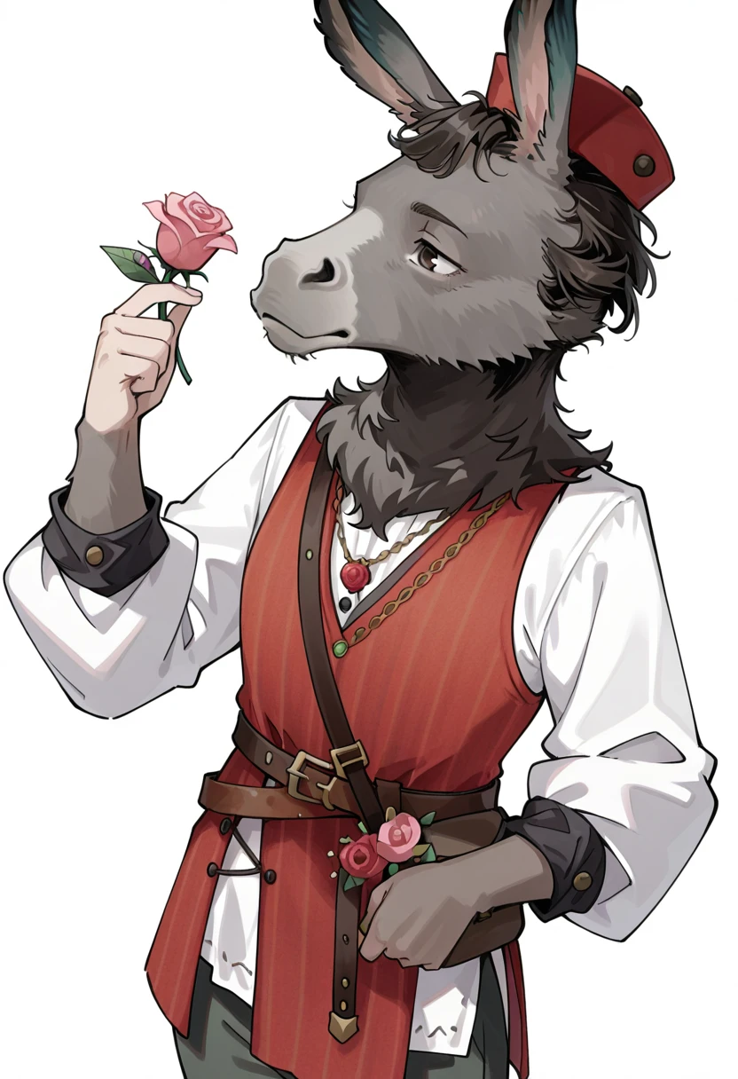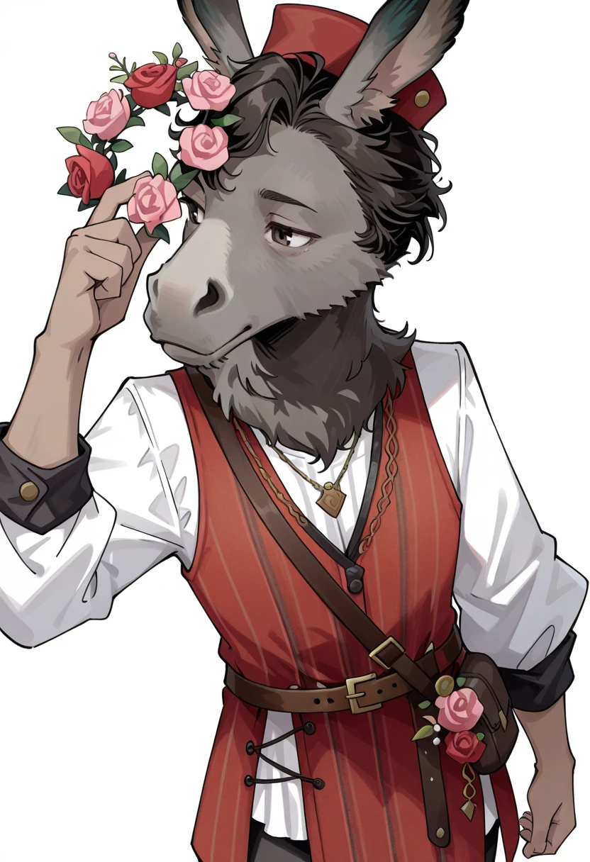 nick bottom \(reverse:1999\),donkey,donkey head,long sleeves,flower,red headwear,shirt,white shirt,hat,pants,red flower,belt,red vest,<lora:reverse_1999_nick_bottom-000009:0.8>,