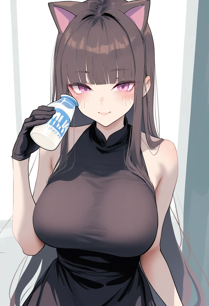 shama\(maimai\), black gloves, brown hair, blunt bangs, cat ears, long hair, large breasts, sleeveless dress, black dress, 1girl