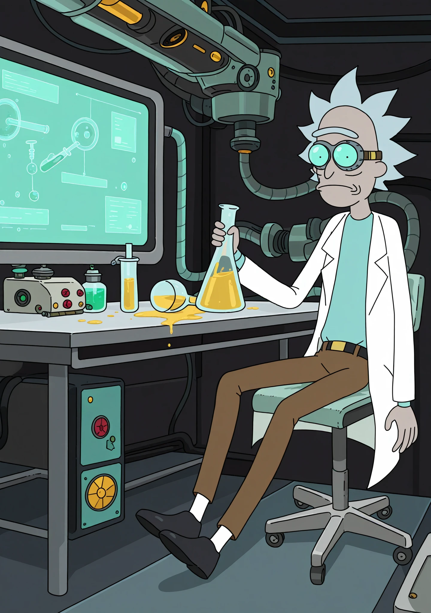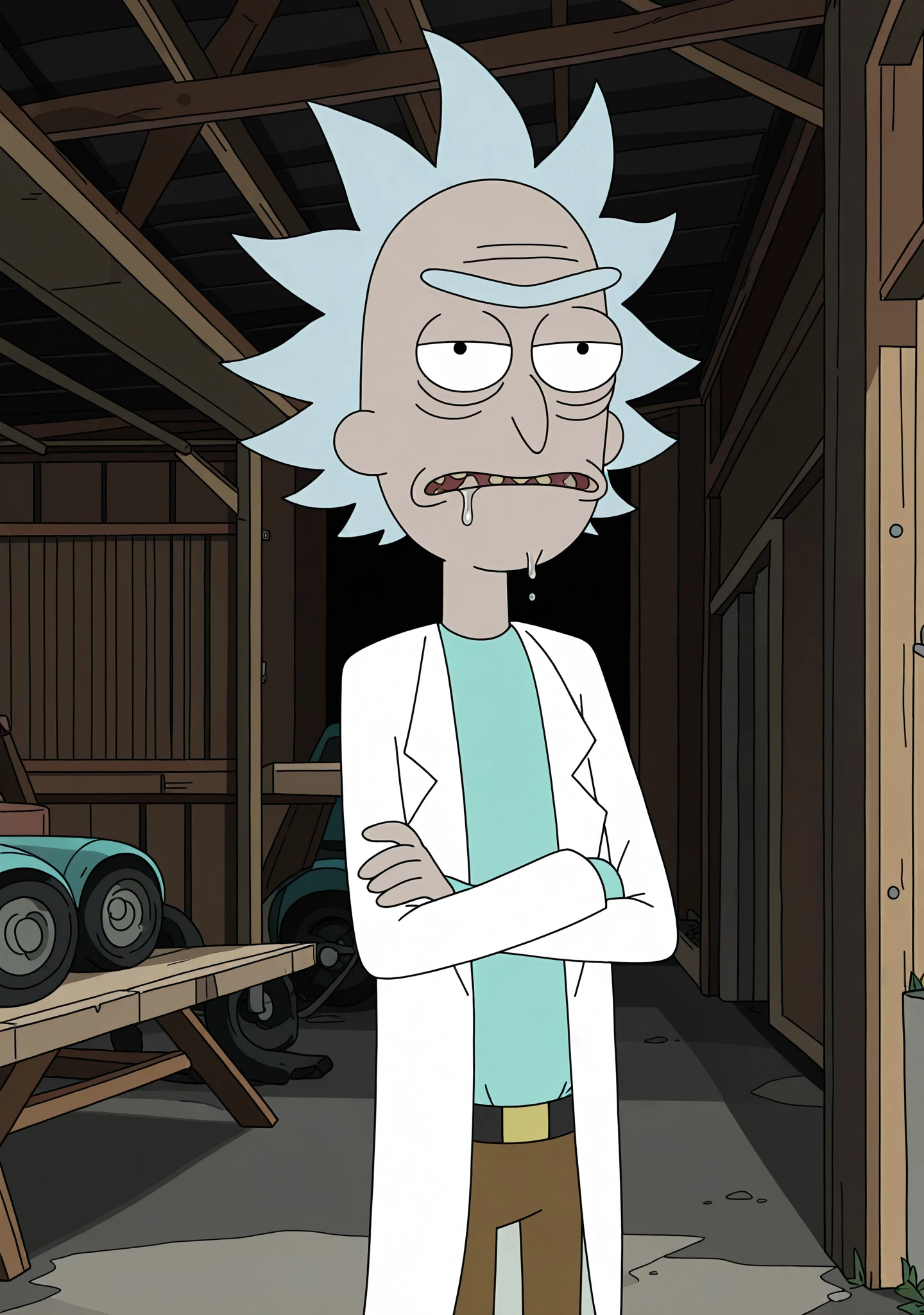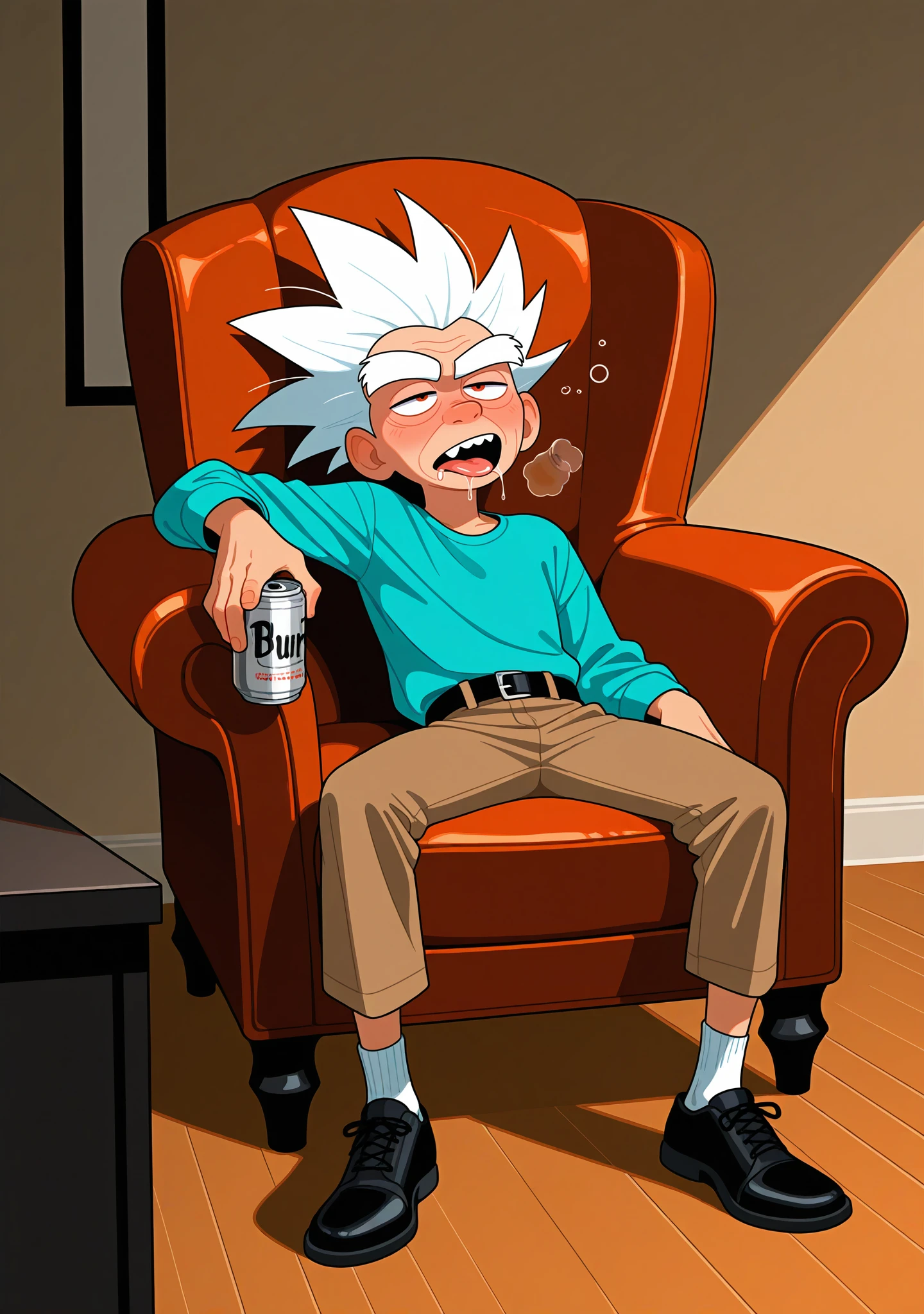 Trigger: rnm_ricksanchez, 1boy, old man, skinny, white hair, unibrow, white lab coat, aqua shirt, black belt, brown pants, white socks, black shoes