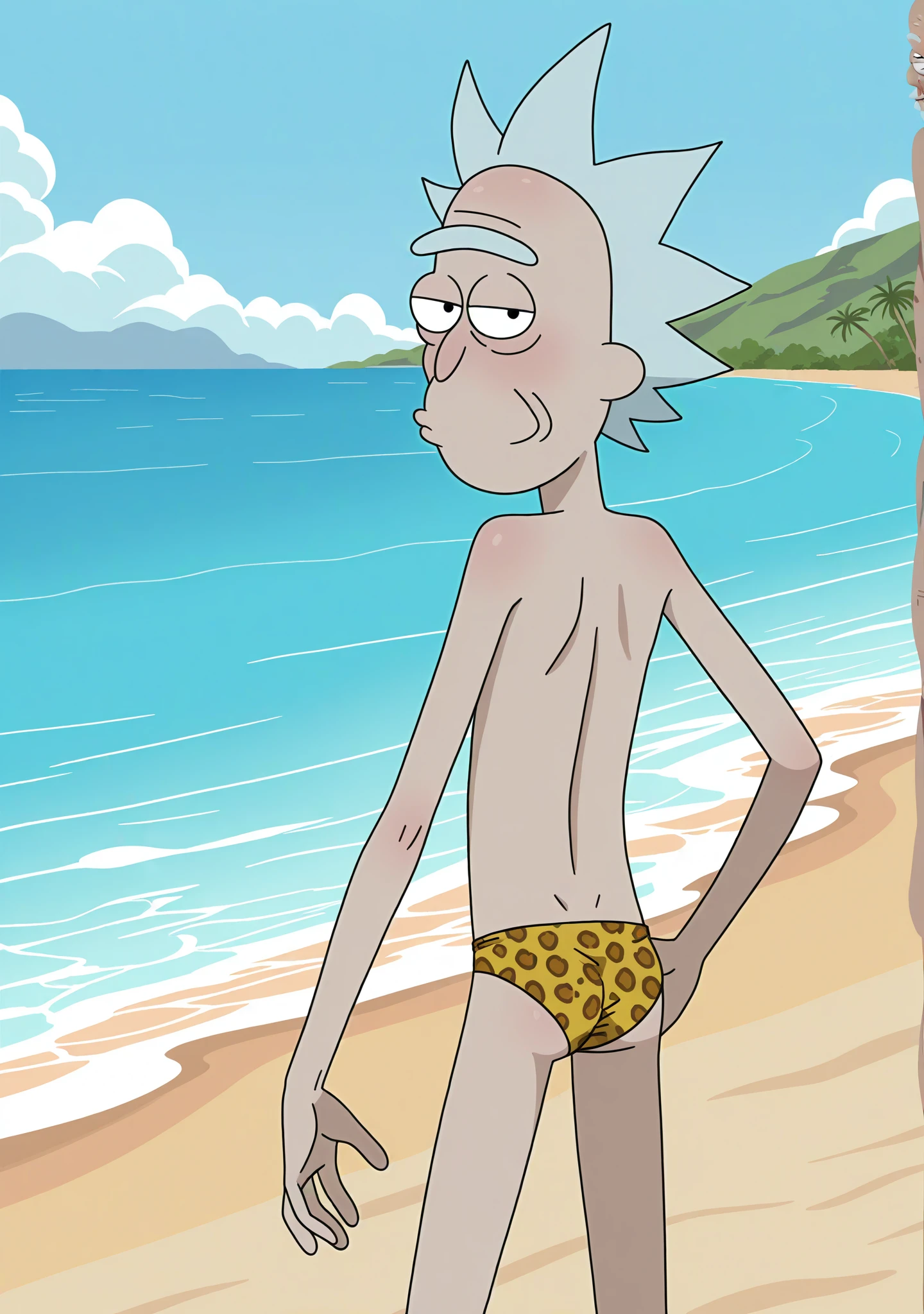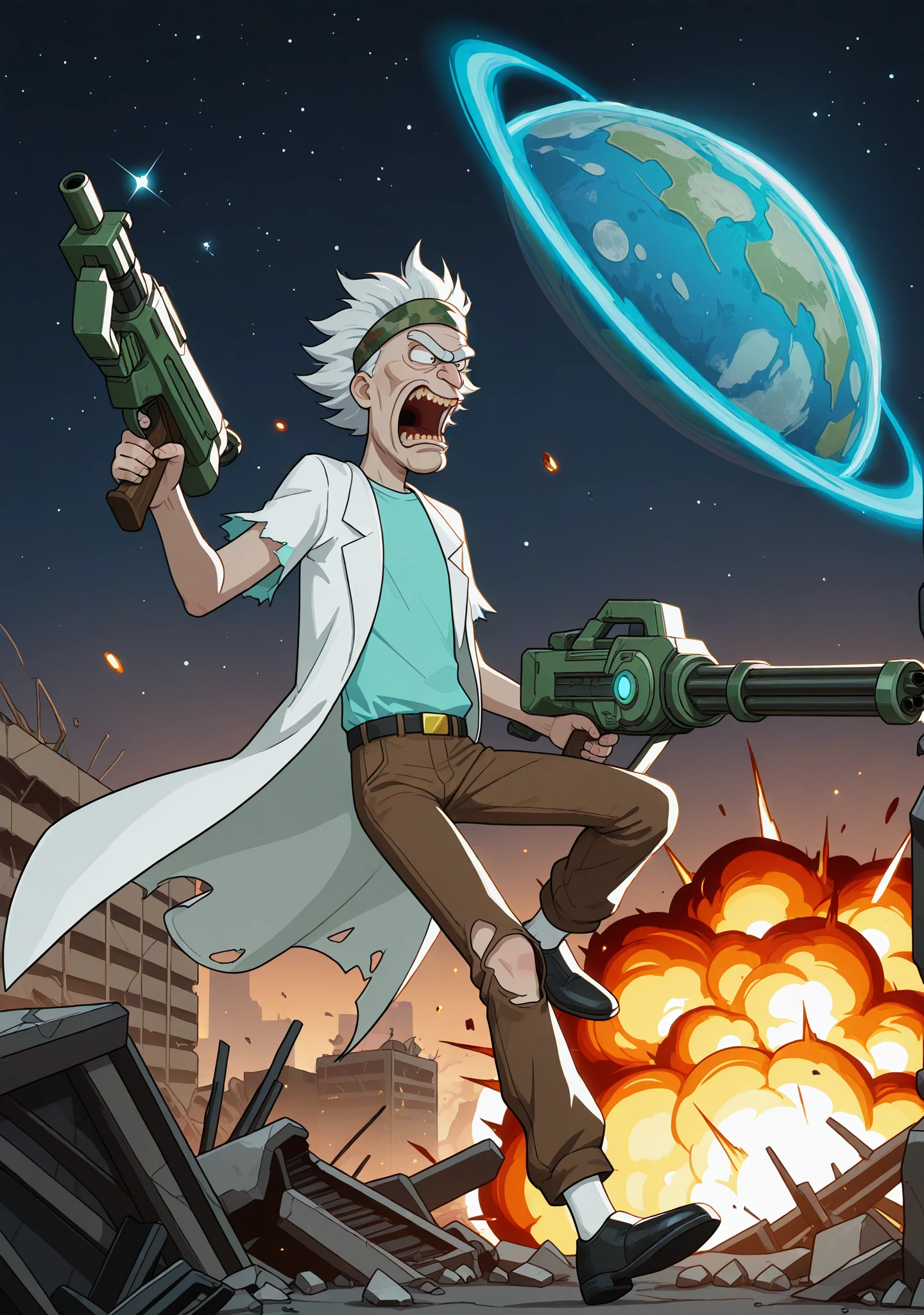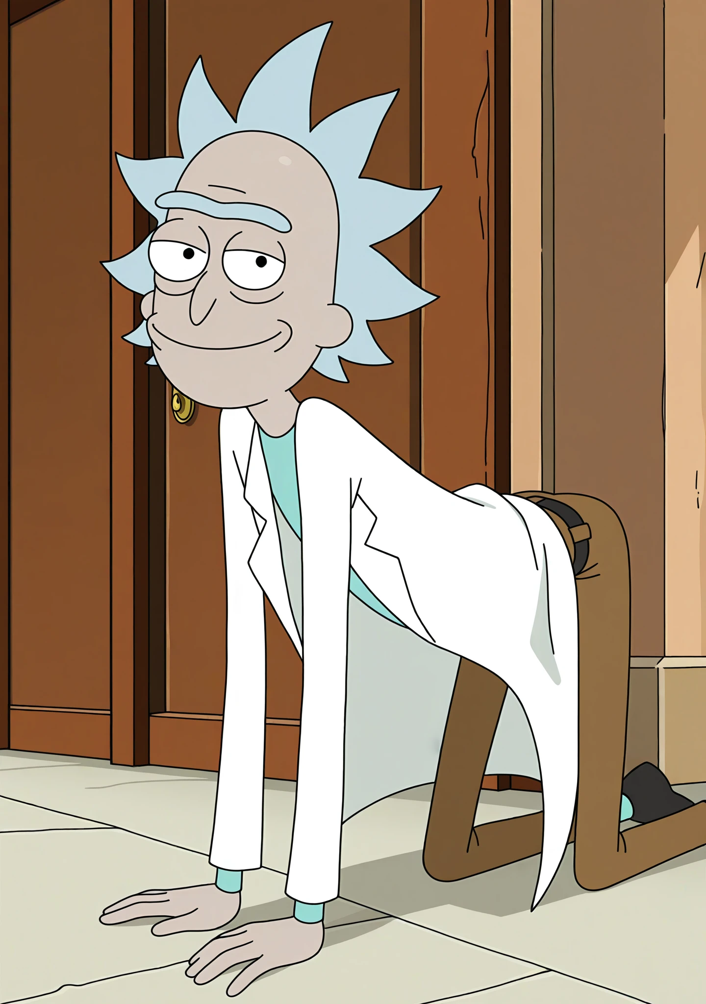 Trigger: rnm_ricksanchez, 1boy, old man, skinny, white hair, unibrow, white lab coat, aqua shirt, black belt, brown pants, white socks, black shoes