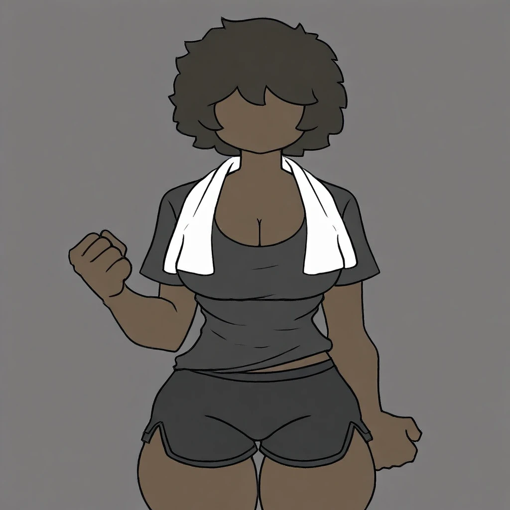 1girl, solo, dark skinned female, grey shirt, short hair, black hair, short sleeves, black eyes, large breasts, slim waist, hips, thighs, black shorts