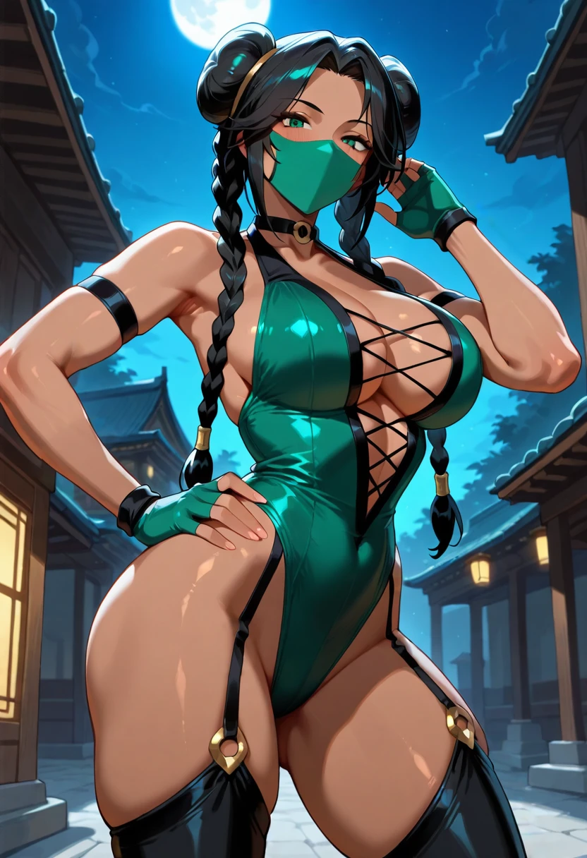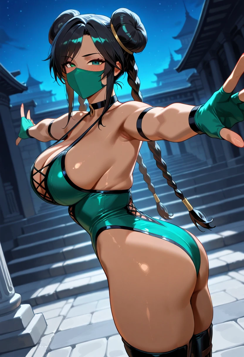JadeAltMKD, 1girl, green eyes, black hair, long hair, double bun, twin braids, dark skin, dark-skinned female, leotard, green leotard, mouth mask, black thigh boots, high heels, yellow kneepads, arm bands, fingerless gloves, green gloves, choker