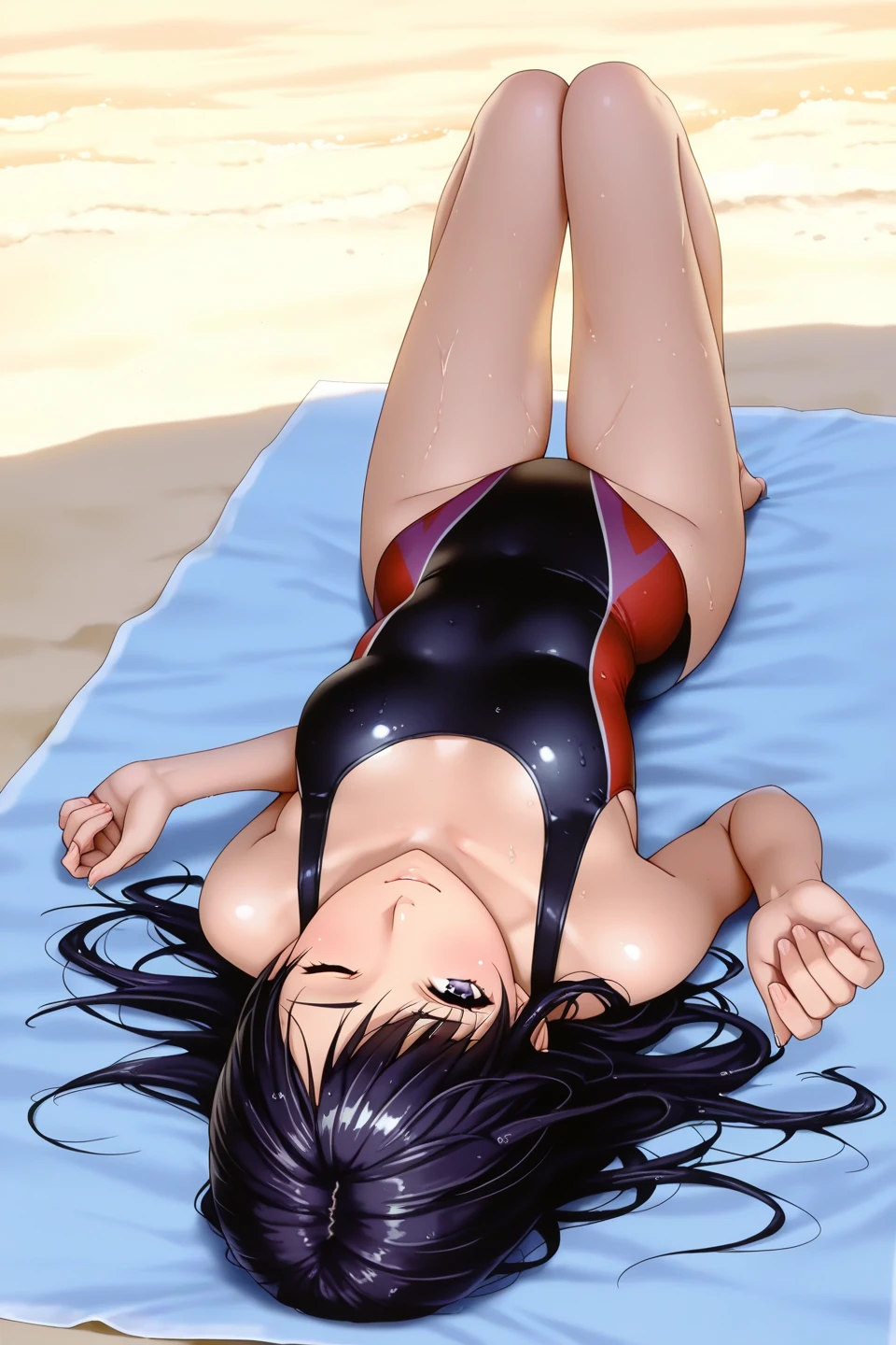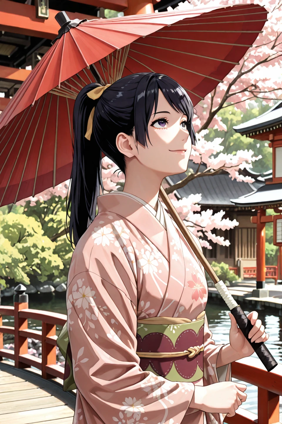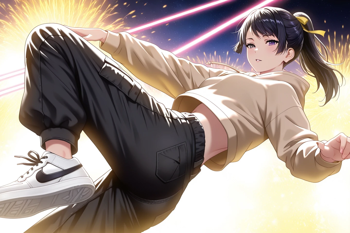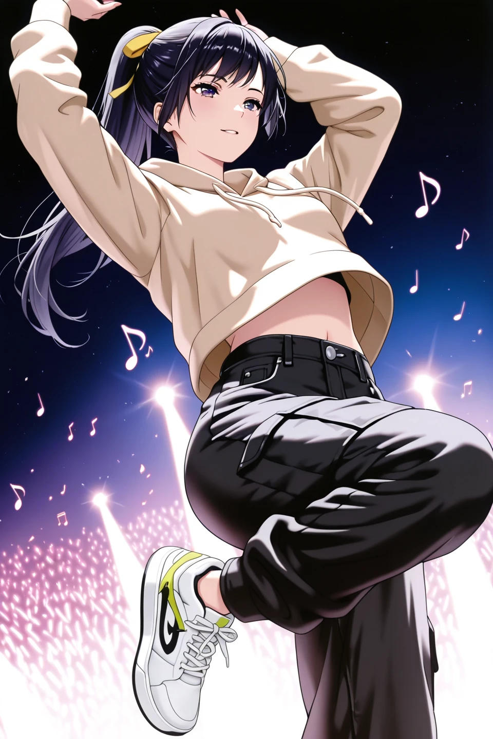 black hair, long hair, ponytail, dark purple eyesAccessoires: