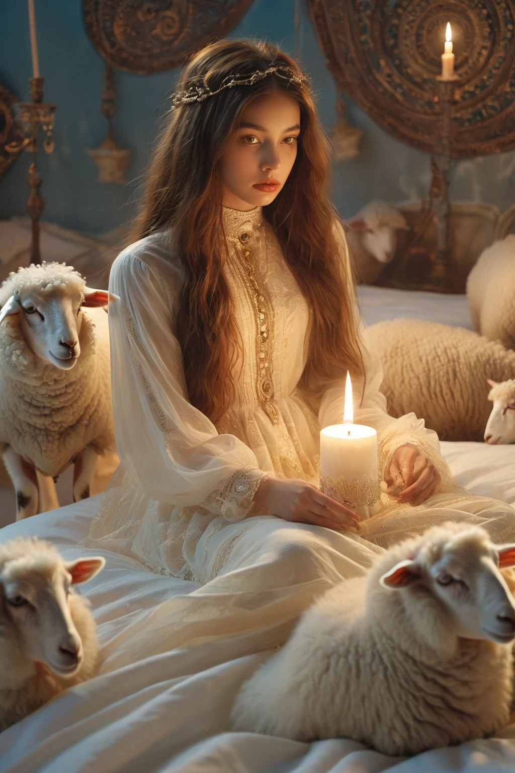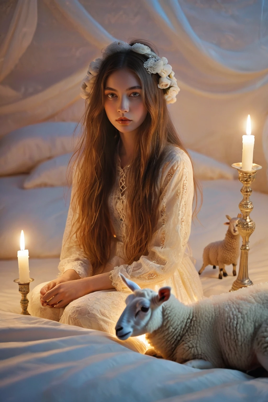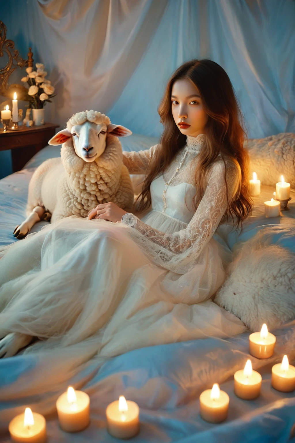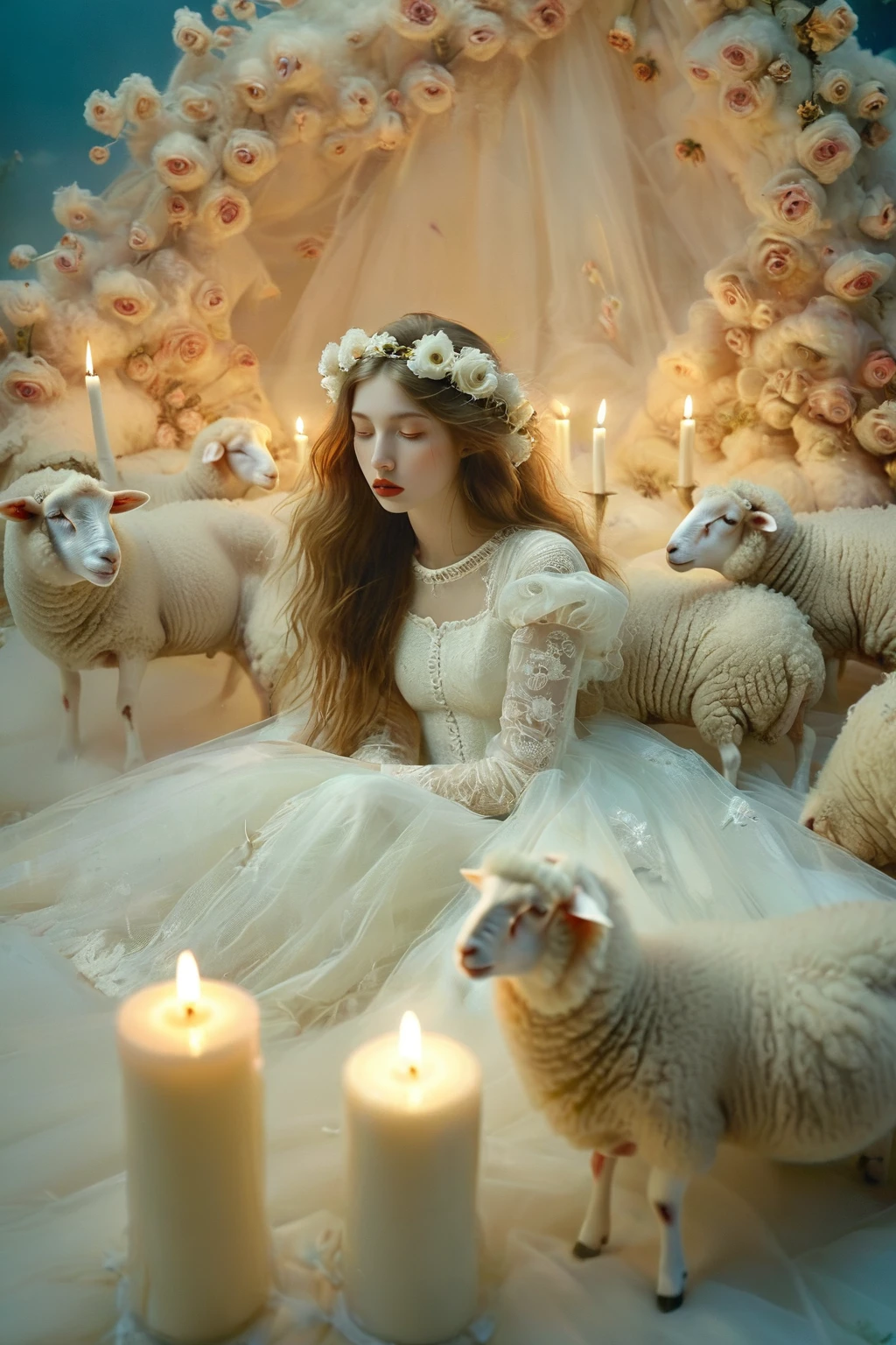 Recommended prompt : dress,candle, sheep, white dress, depth of field, lips, long sleeves, indoors, lace, blunt bangs, lace trim, lace-trimmed sleeves, candlestand,window, day,