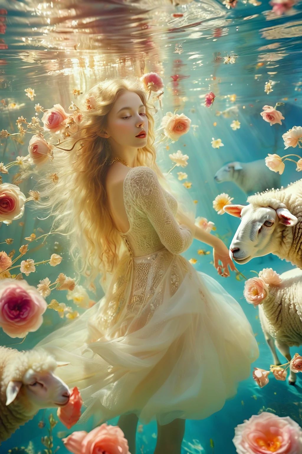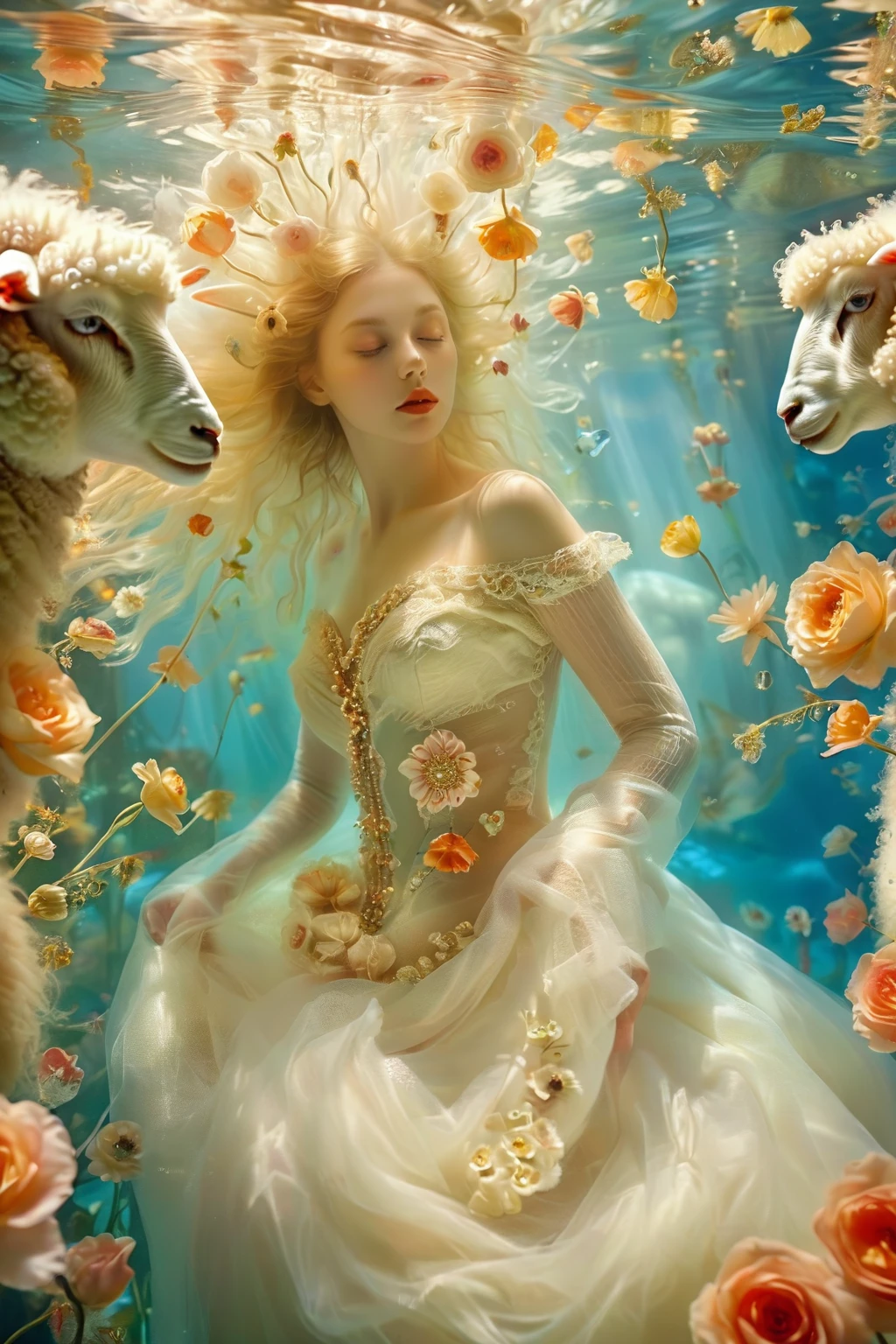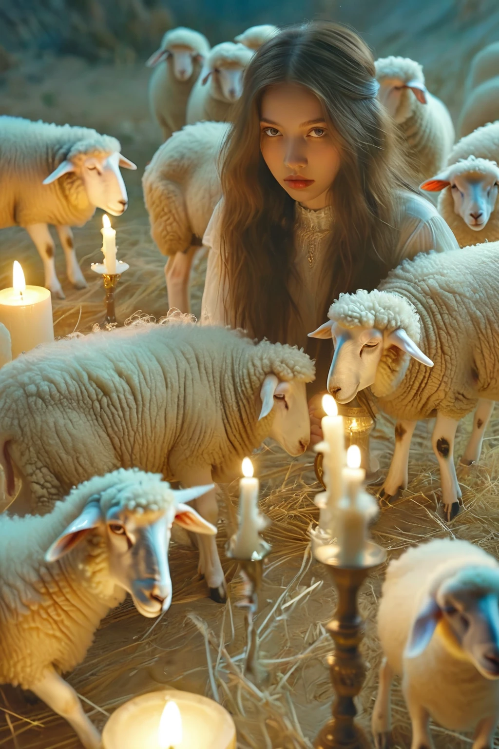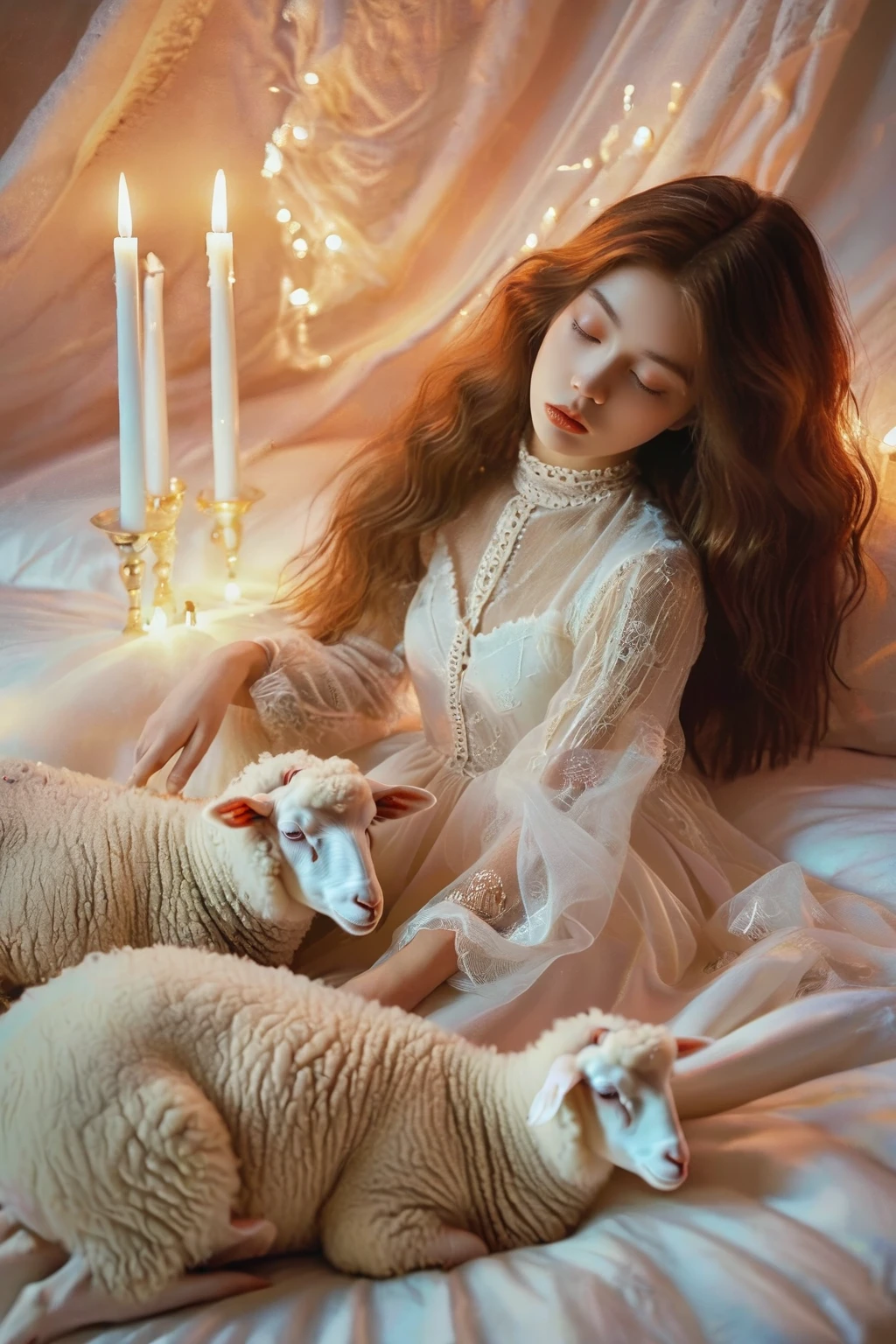 Recommended prompt : dress,candle, sheep, white dress, depth of field, lips, long sleeves, indoors, lace, blunt bangs, lace trim, lace-trimmed sleeves, candlestand,window, day,