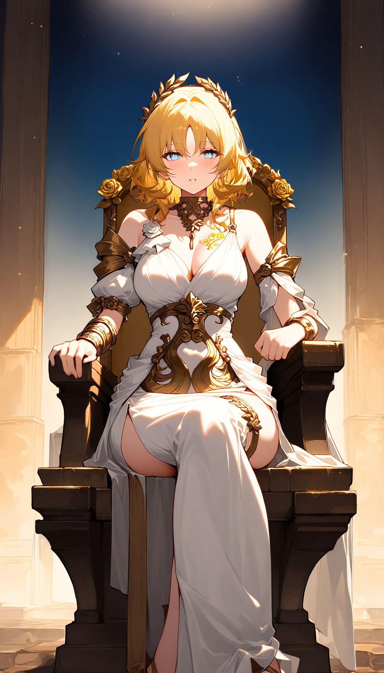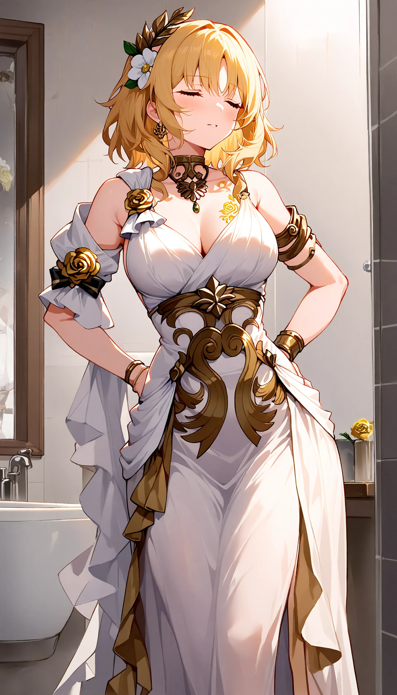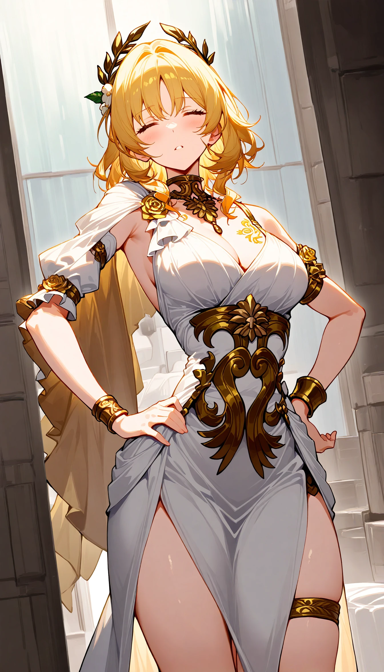 (best quality,8K, masterpiece :1.3),anime,Aglaea, none pupil, (green eyes:0.5), pure eyes, goddess, mature, white dress, white flower, golden flower ornament, straped dress, long skirt, white skirt, side slit, detached sleeves, gold trim, greek clothes, arm armor, brown armor, wristband, golden tattoo, medium breasts, (cleavage:0.6), necklace, bare shoulders, gold rose, pleated sleeves, short sleeves, single sleeve, (thigh strap:0.5)Notes: