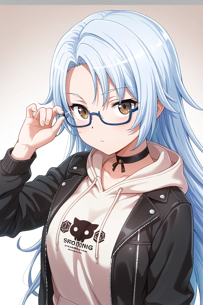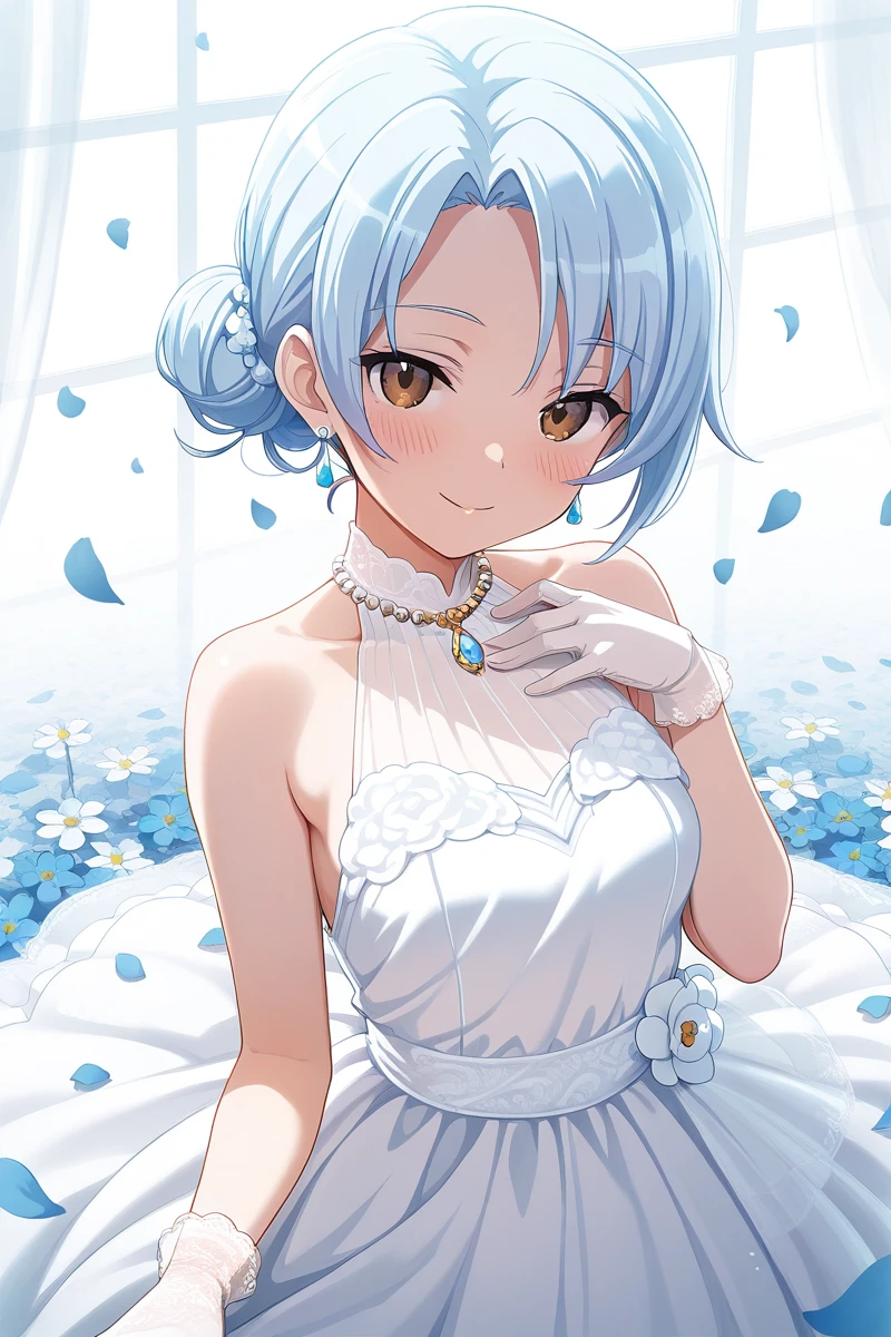 shiro, 1girl, solo, long hair, looking at viewer, gloves, fingerless gloves, smile, epaulettes, thigh strap, brown eyes, skirt, thigh holster, holster, stage outfitDescription