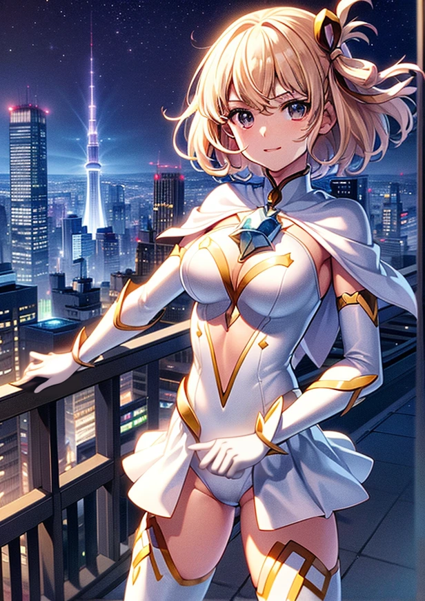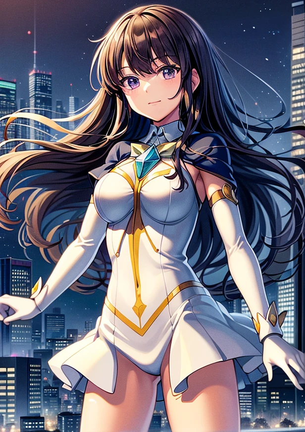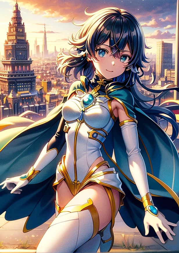 magical girl, white and yellow geometric pattern, tight leotard, skin tight, blue gem on chest, fighting stance