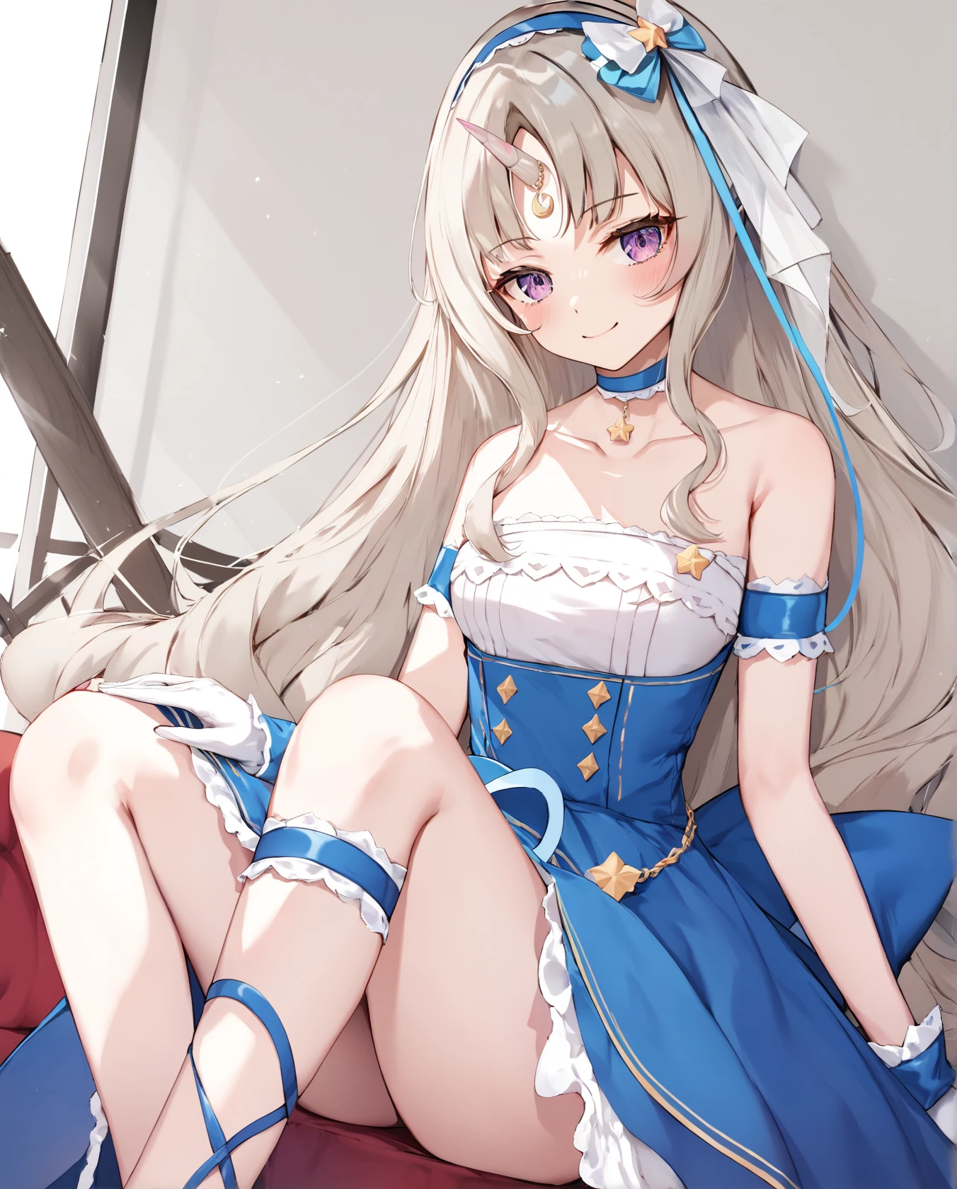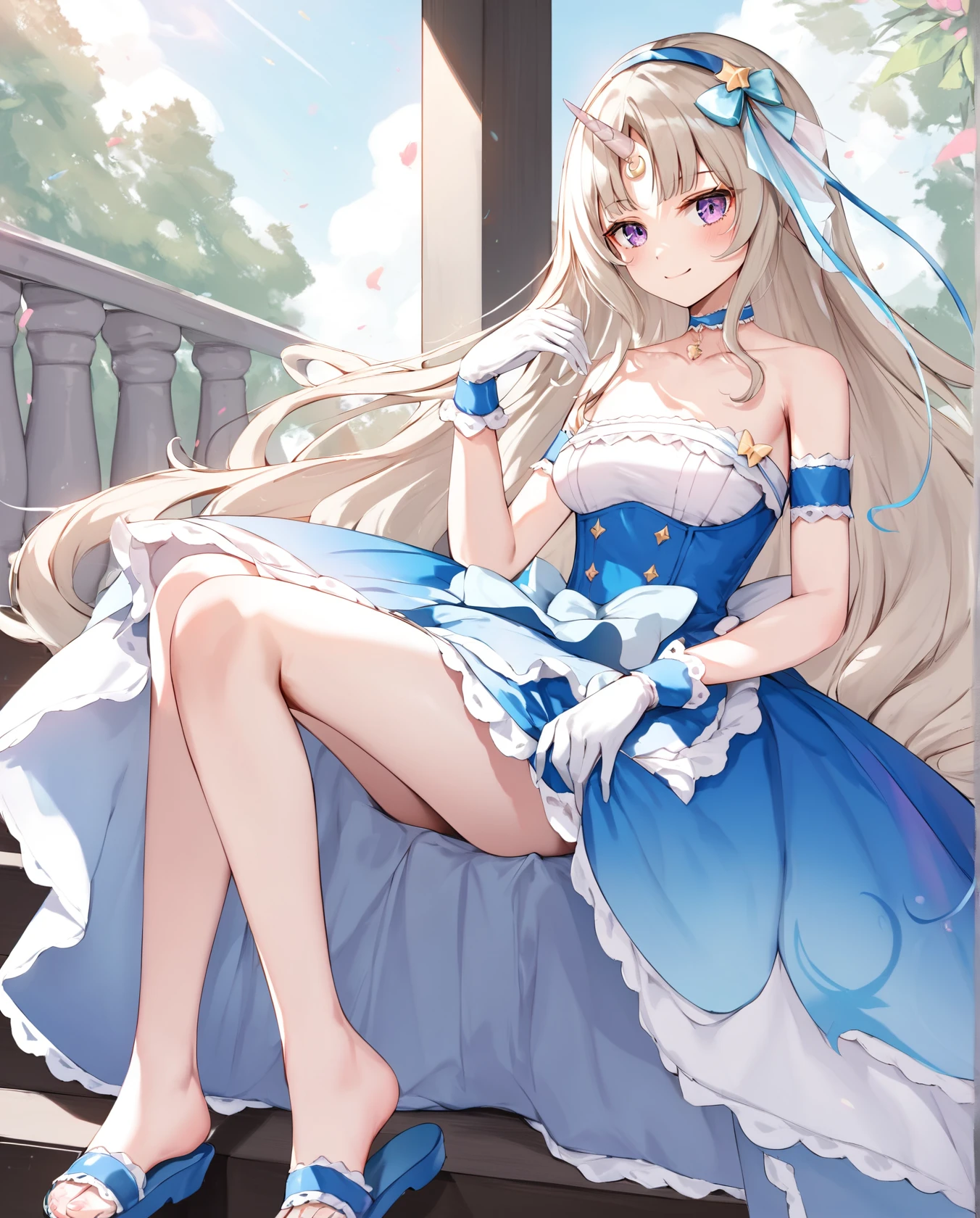 Civia, gloves, single horn, virtual youtuber, horns, long hair, dress, purple eyes, white gloves, bridal garter, sandals, bare shoulders, bow, hairband, frills, bangs, collarbone, choker, blue hairband, parted bangs, jewelry,