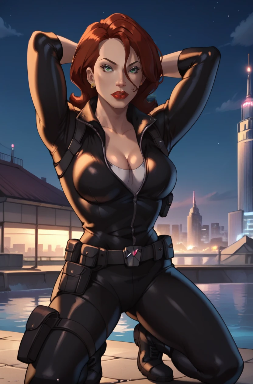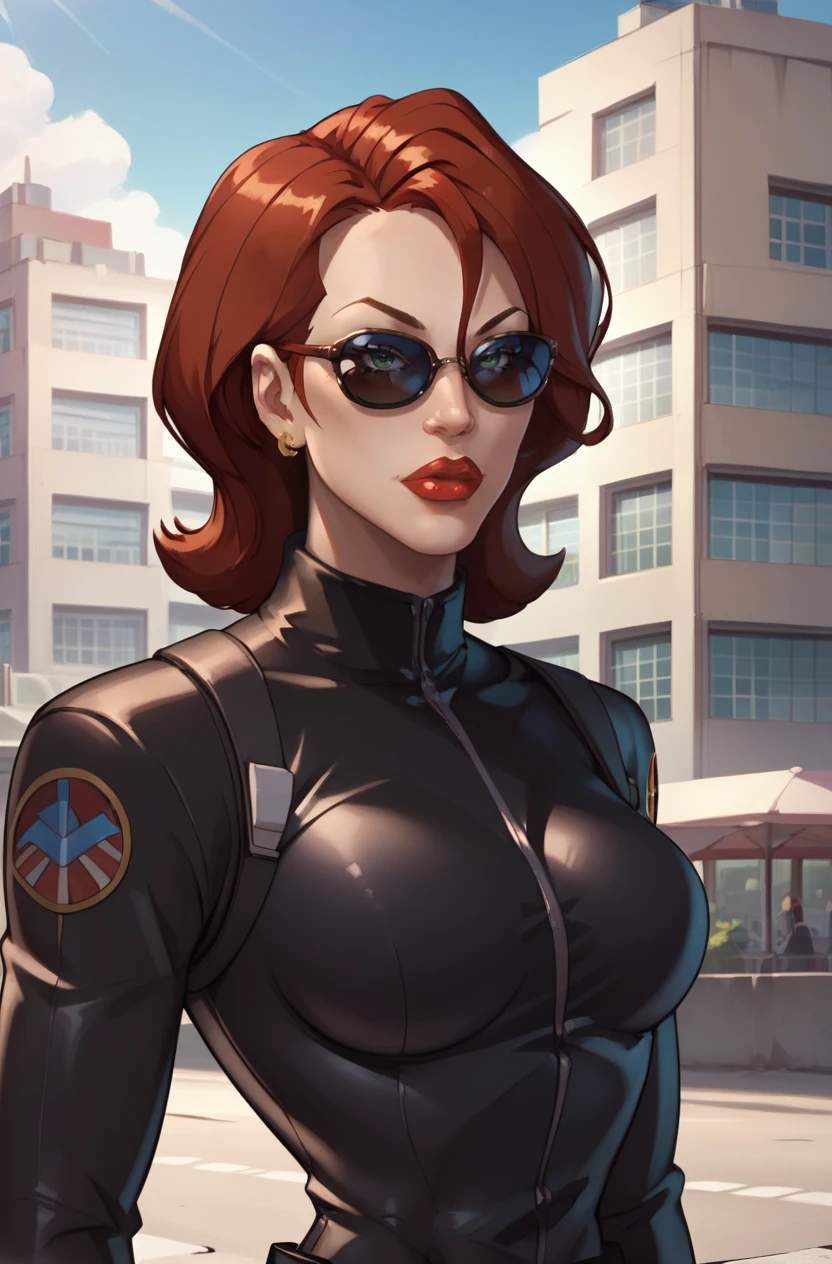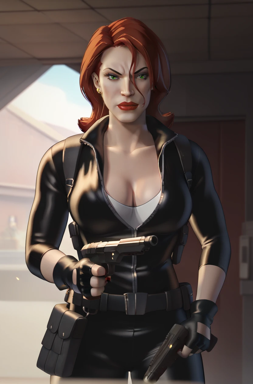 BWidow, 1girl, red hair, short hair, green eyes, earrings, red lips, lipstick,
