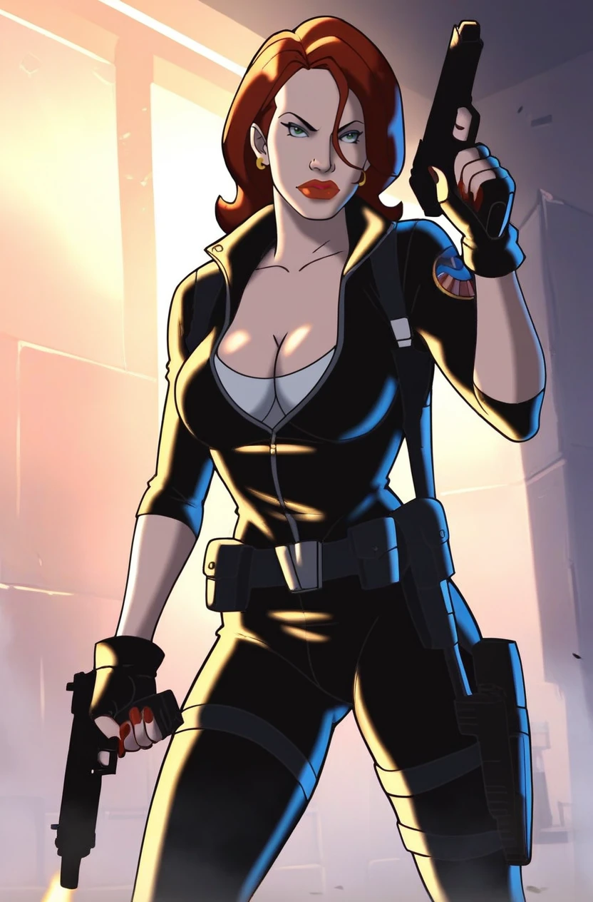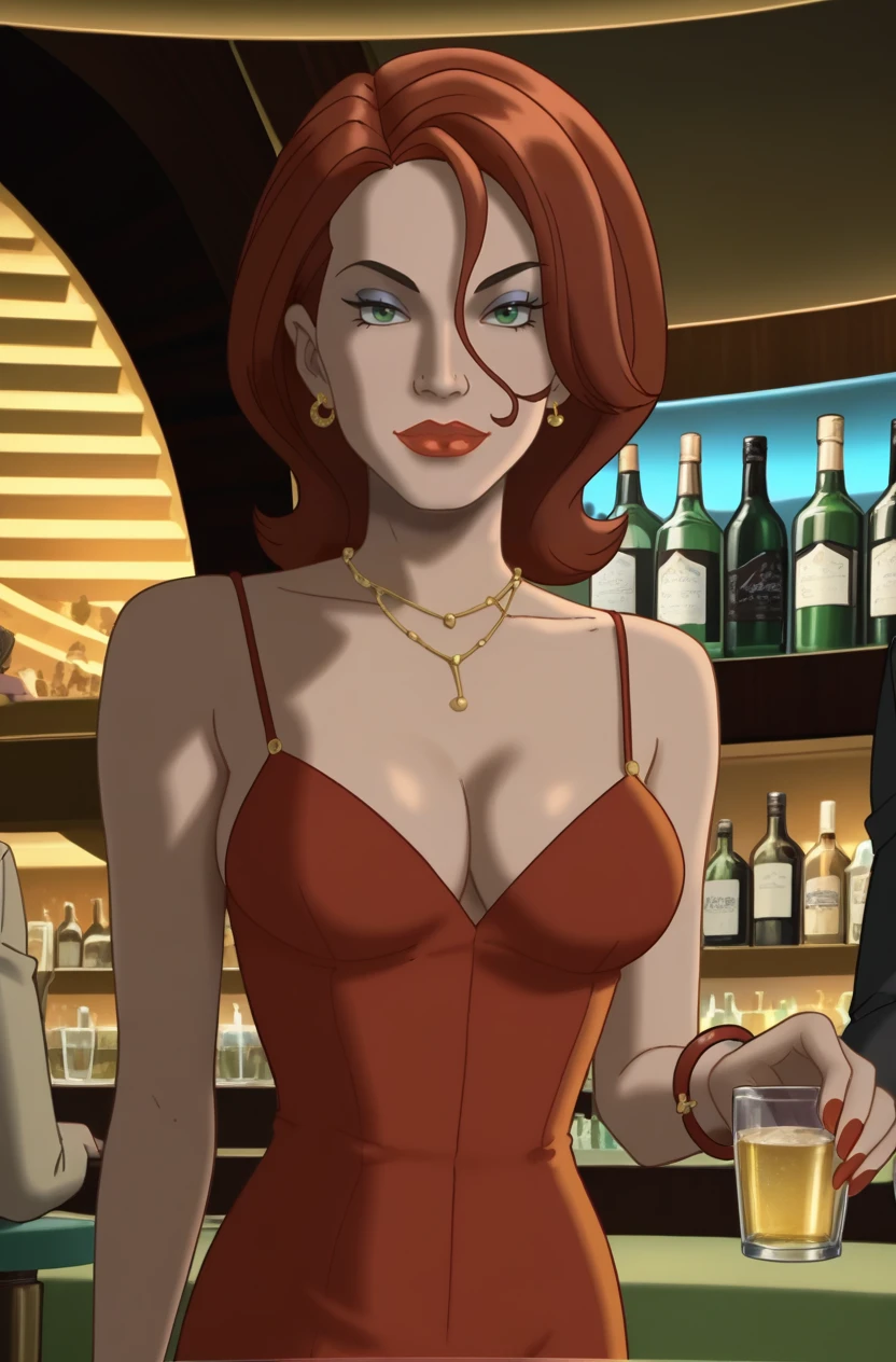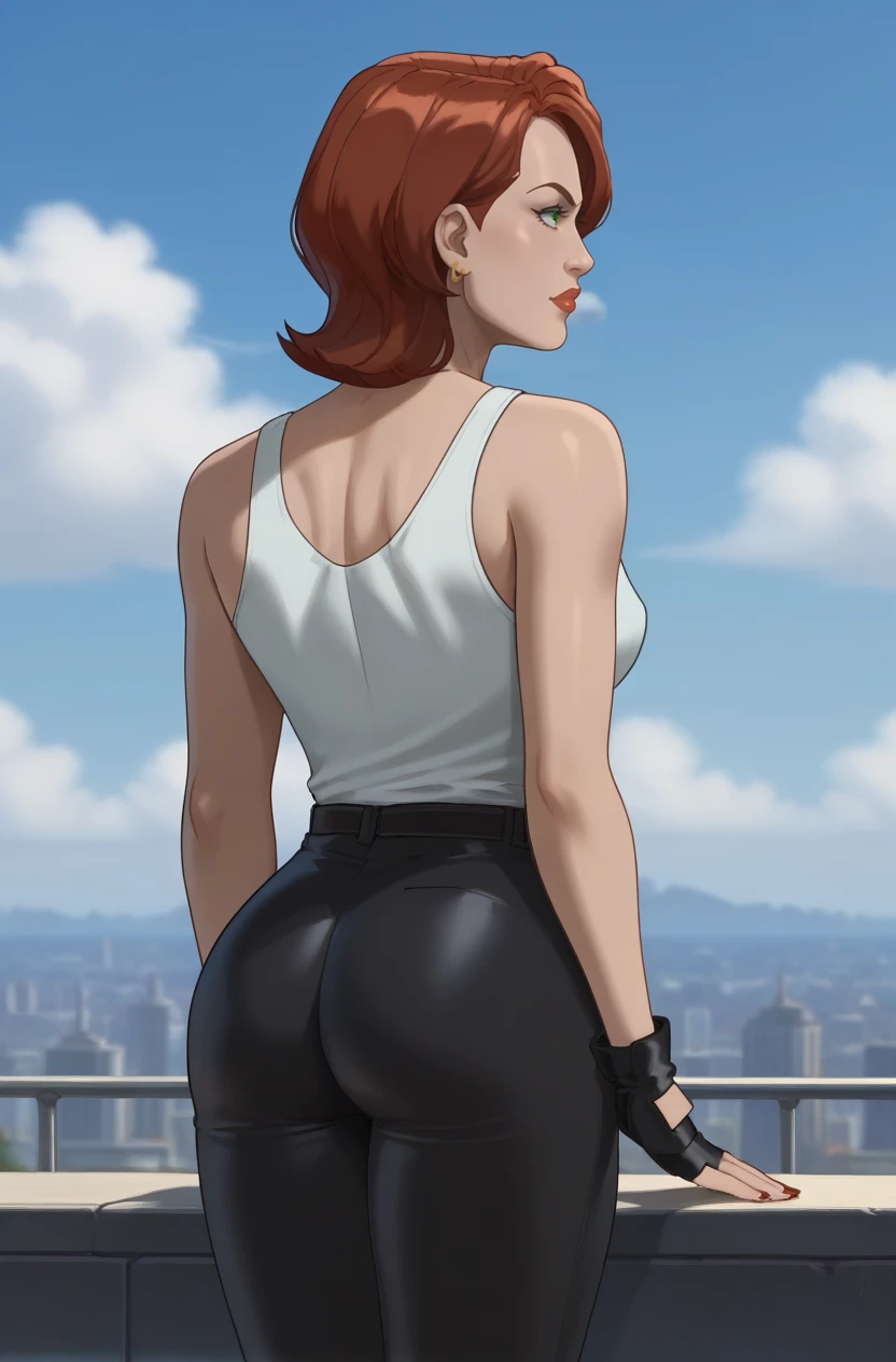BWidow, 1girl, red hair, short hair, green eyes, earrings, red lips, lipstick,