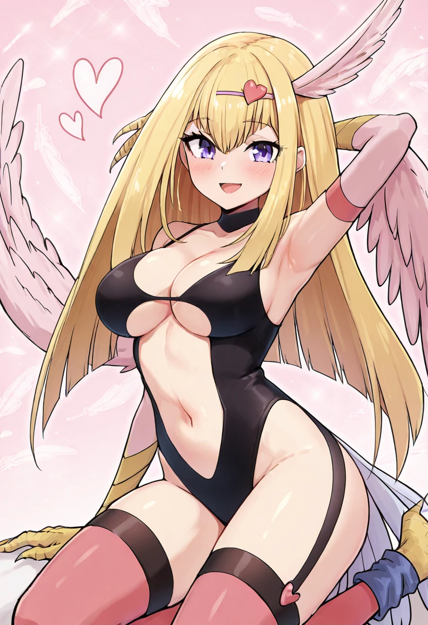 zzHarpyGirl, large breasts, thighhighs, navel, cleavage, bare shoulders, pantyhose, clothing cutout, garter straps, claws, heart hair ornament, single leg pantyhose,