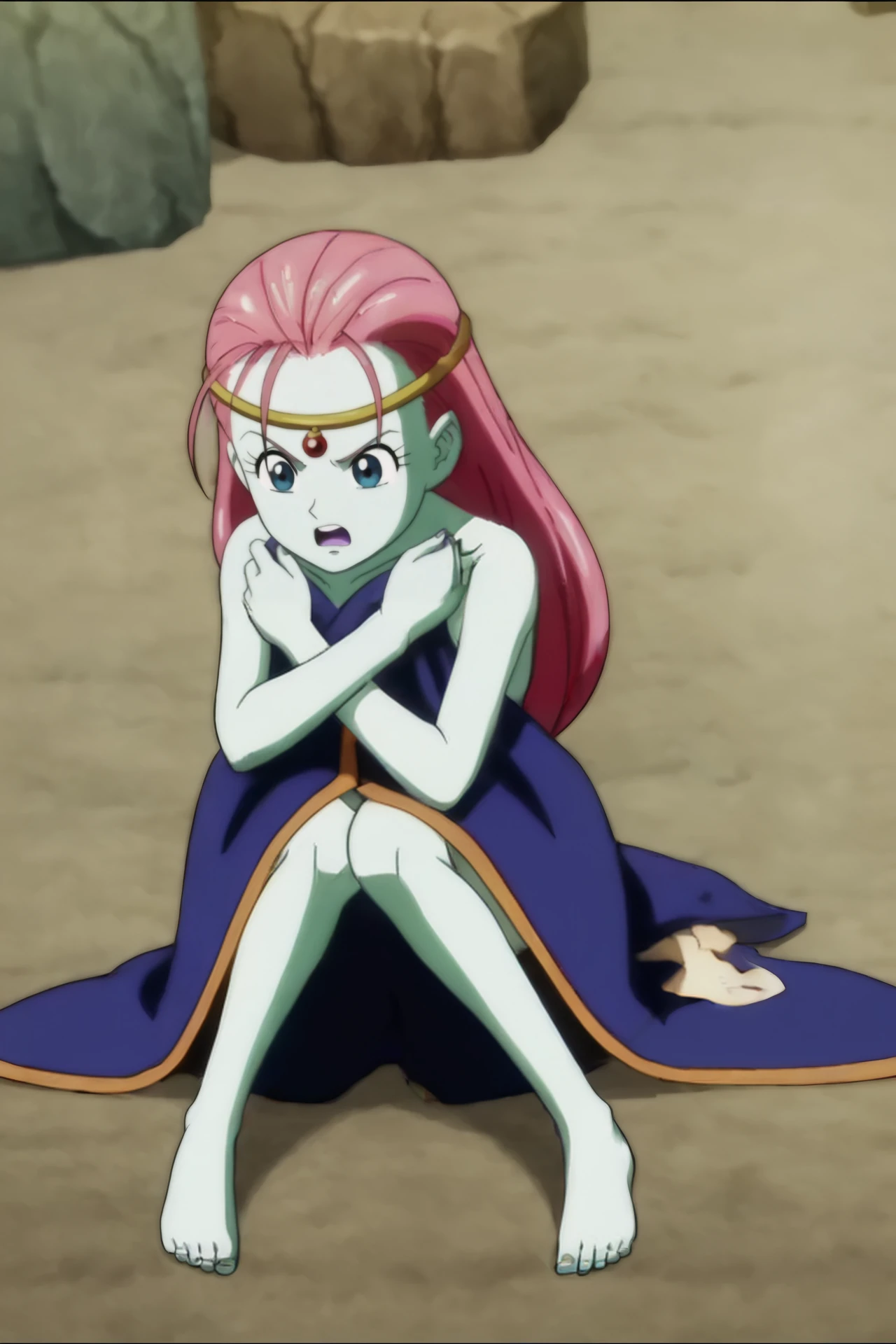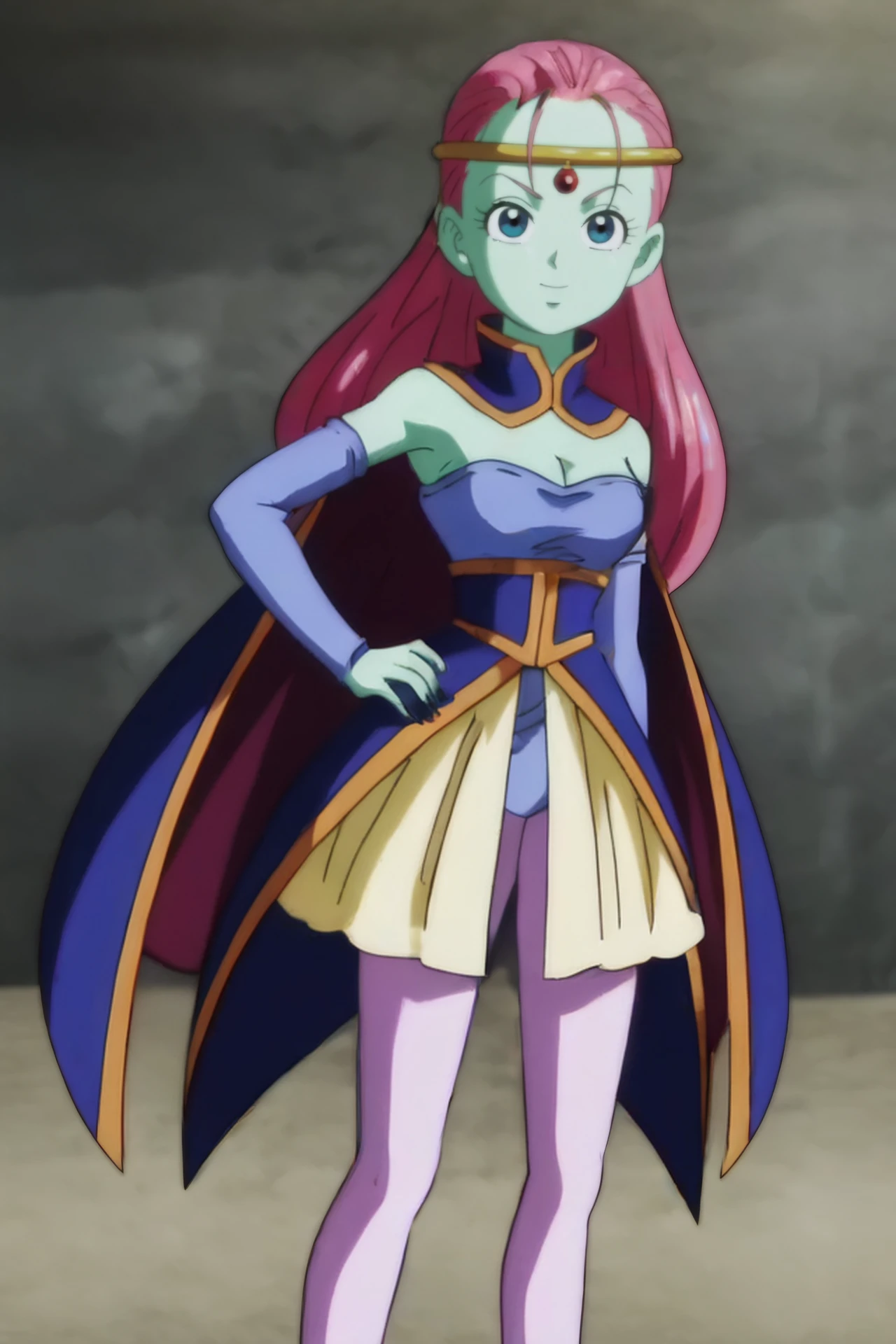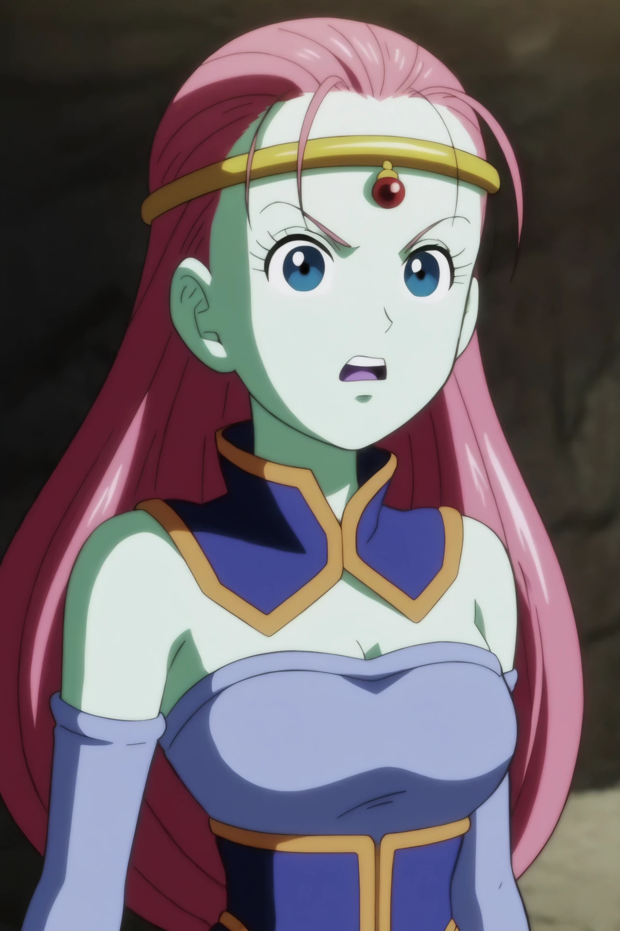 caway, low-tied long hair, pink hair, blue eyes, green skin,