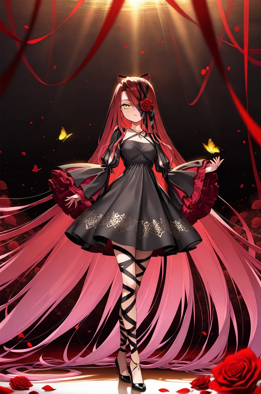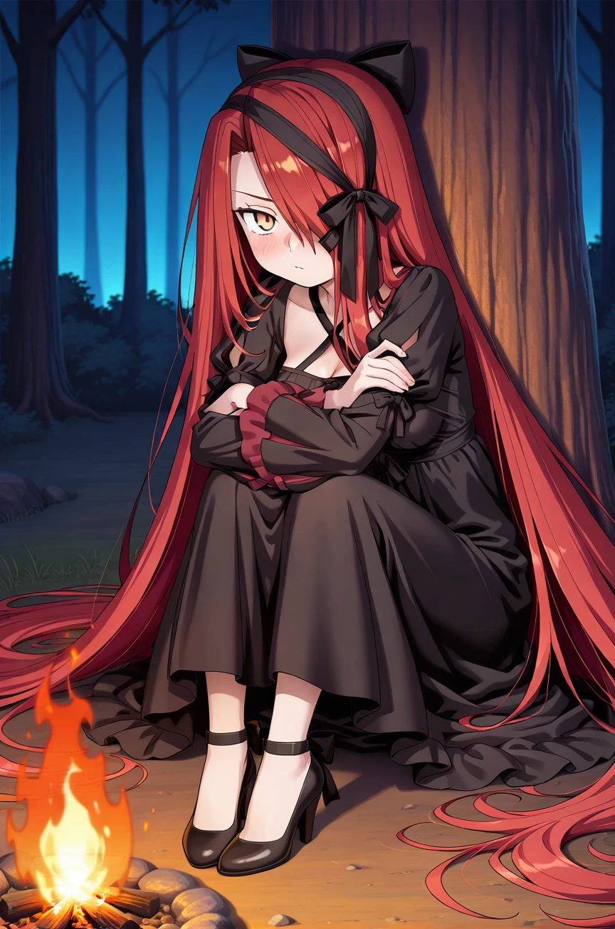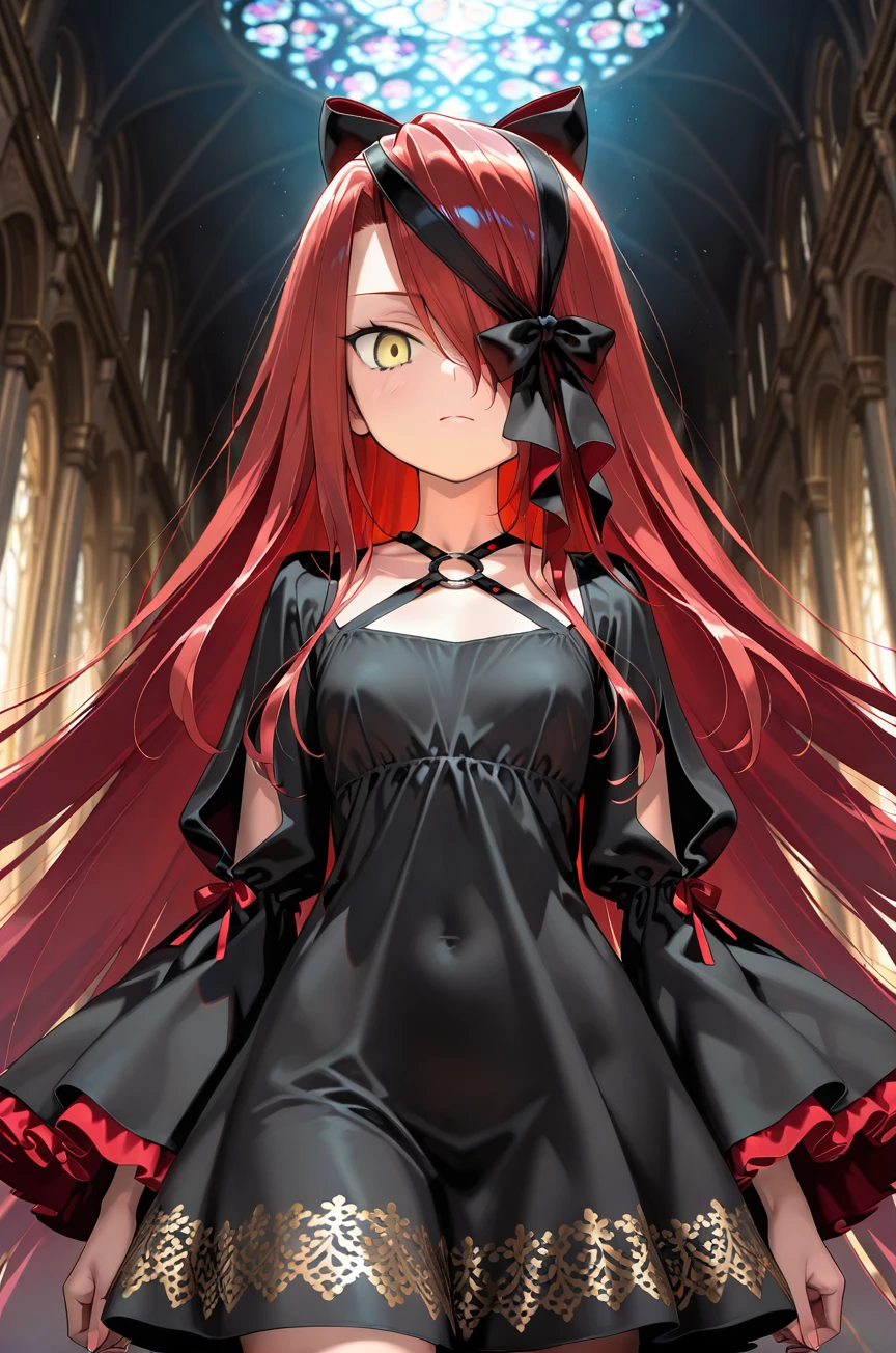 Typhon\(fate\),1girl,red hair,solo,yellow eyes,long hair,dress,black dress,closed mouth,looking at viewer,