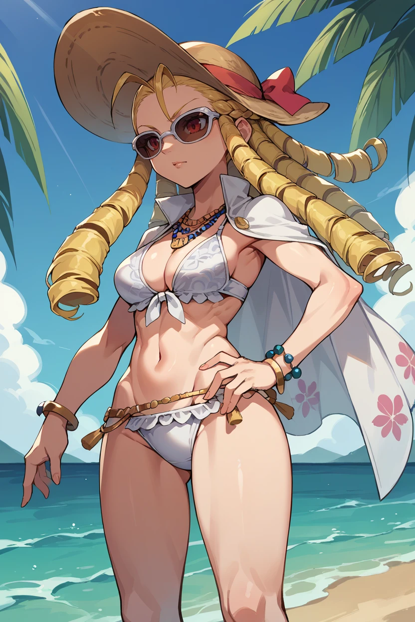 • Add "sun hat, white cape, necklace, white bikini, beads around waist, bracelet" for her SFV swimsuit.