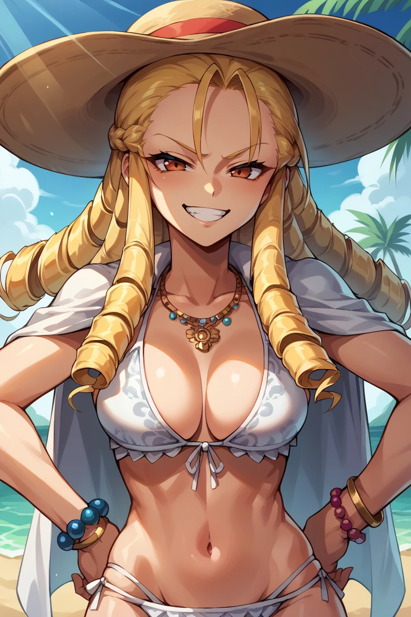 sun hat, white cape, necklace, white bikini, beads around waist, bracelet