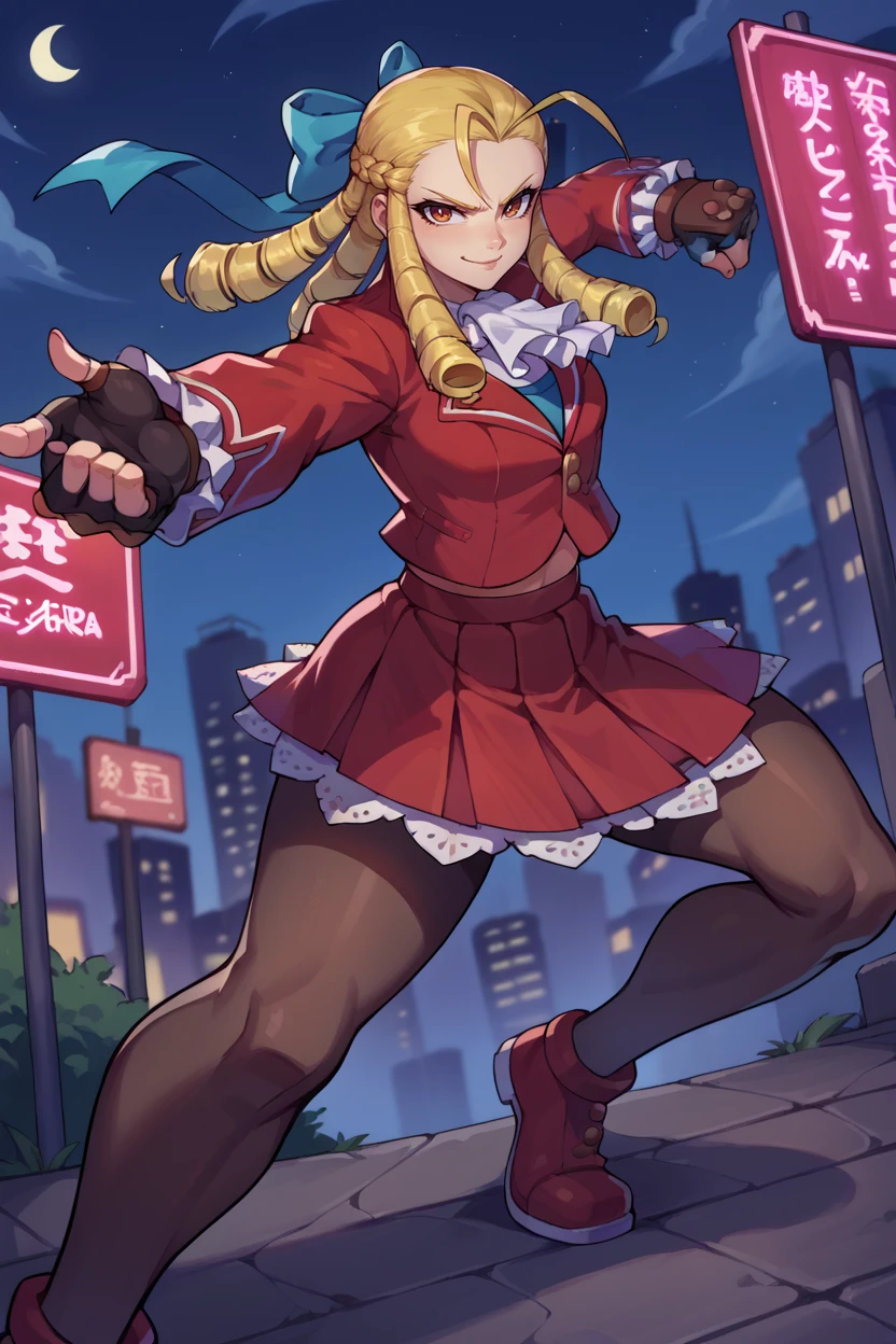 • Add "hair bow, white ascot, red jacket, long sleeves, red skirt, frilled skirt, pantyhose, fingerless gloves" for her SFV default look.