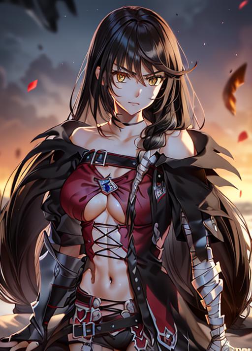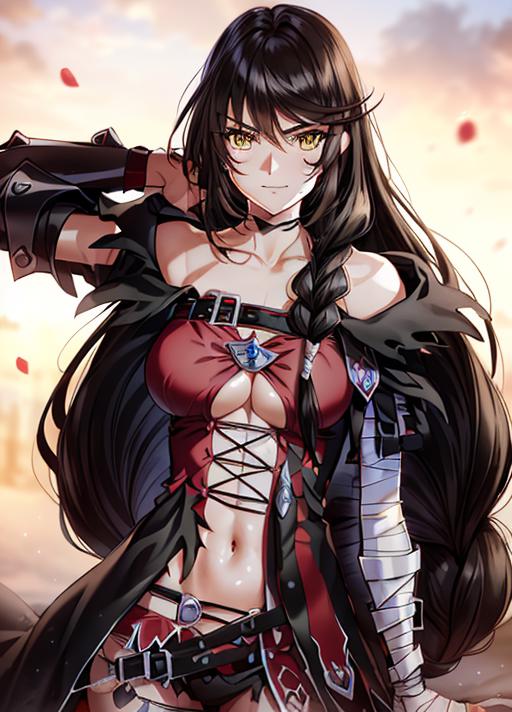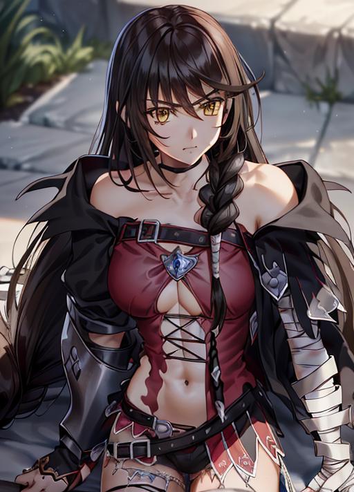 This lora was the first version I got to recognize her hair including the tiny braid that goes over her left shoulder. It was my first attempt at applying different weights to the training data. Not as compatible with other lora as I would like but can be done when playing with percentages. and it does accidently make her top black you may want to add the prompt 'red shirt' if this is a continuous problem. Her bandaged arm is not perfect but at least in this version it is doable. Recommendations to improve are appreciated.