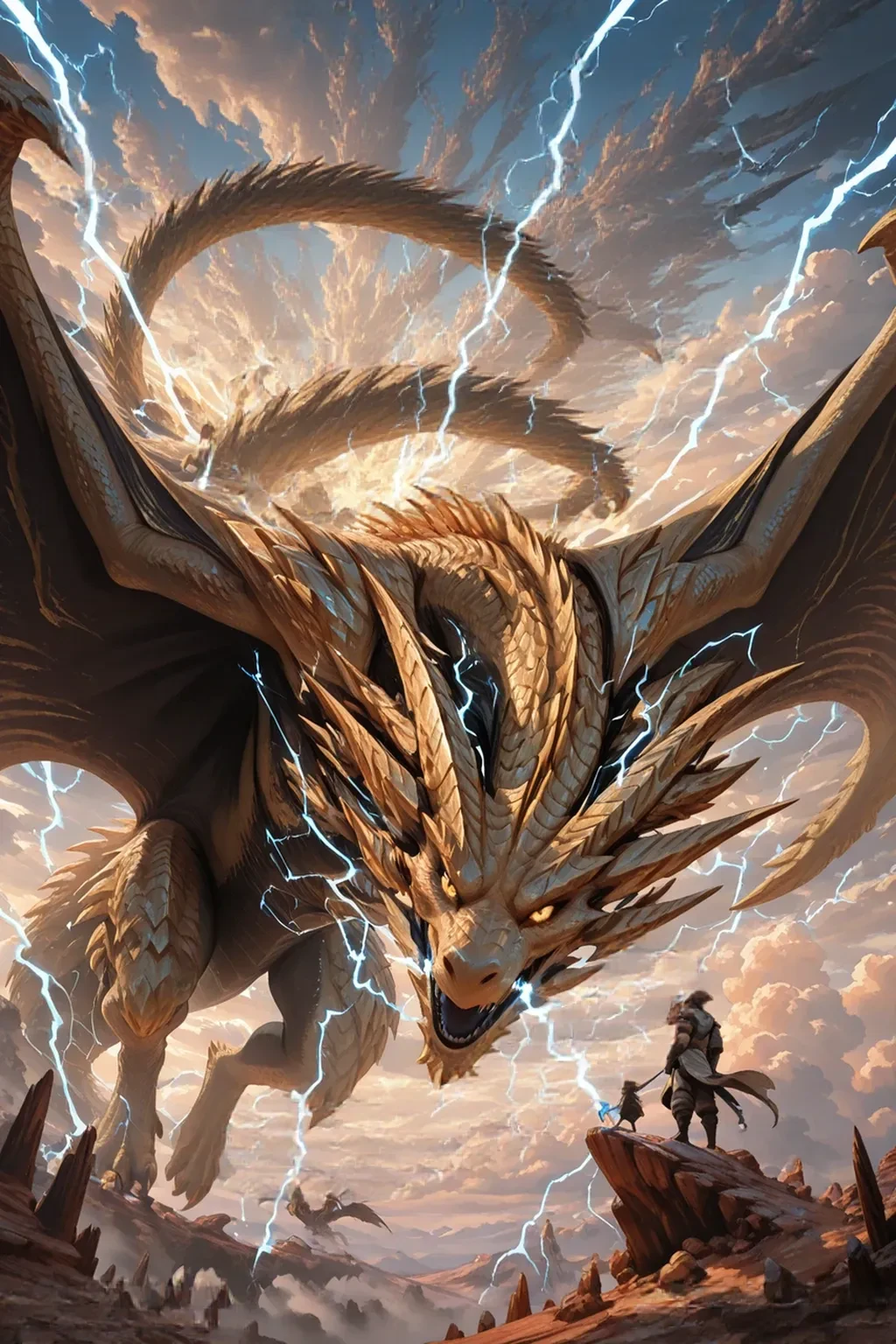 • quadruped dragon body, scaled hide, massive wings, spiked tail, sharp claws, winged arms