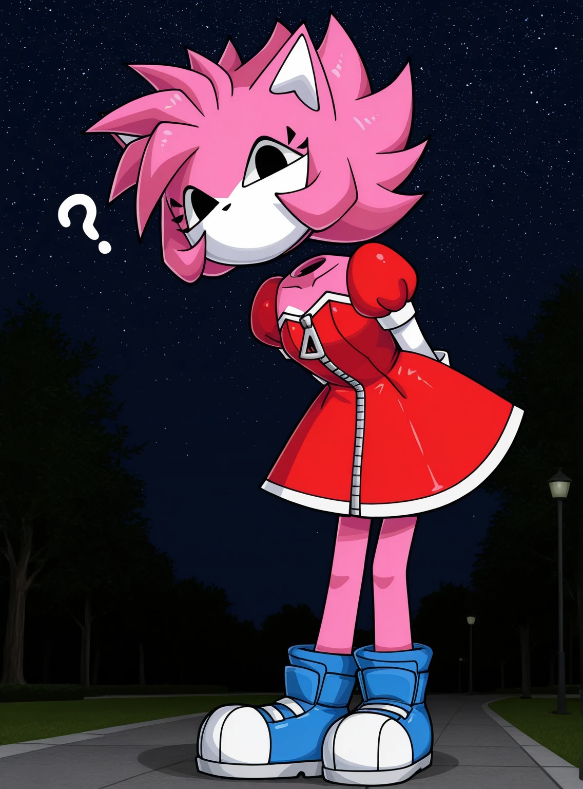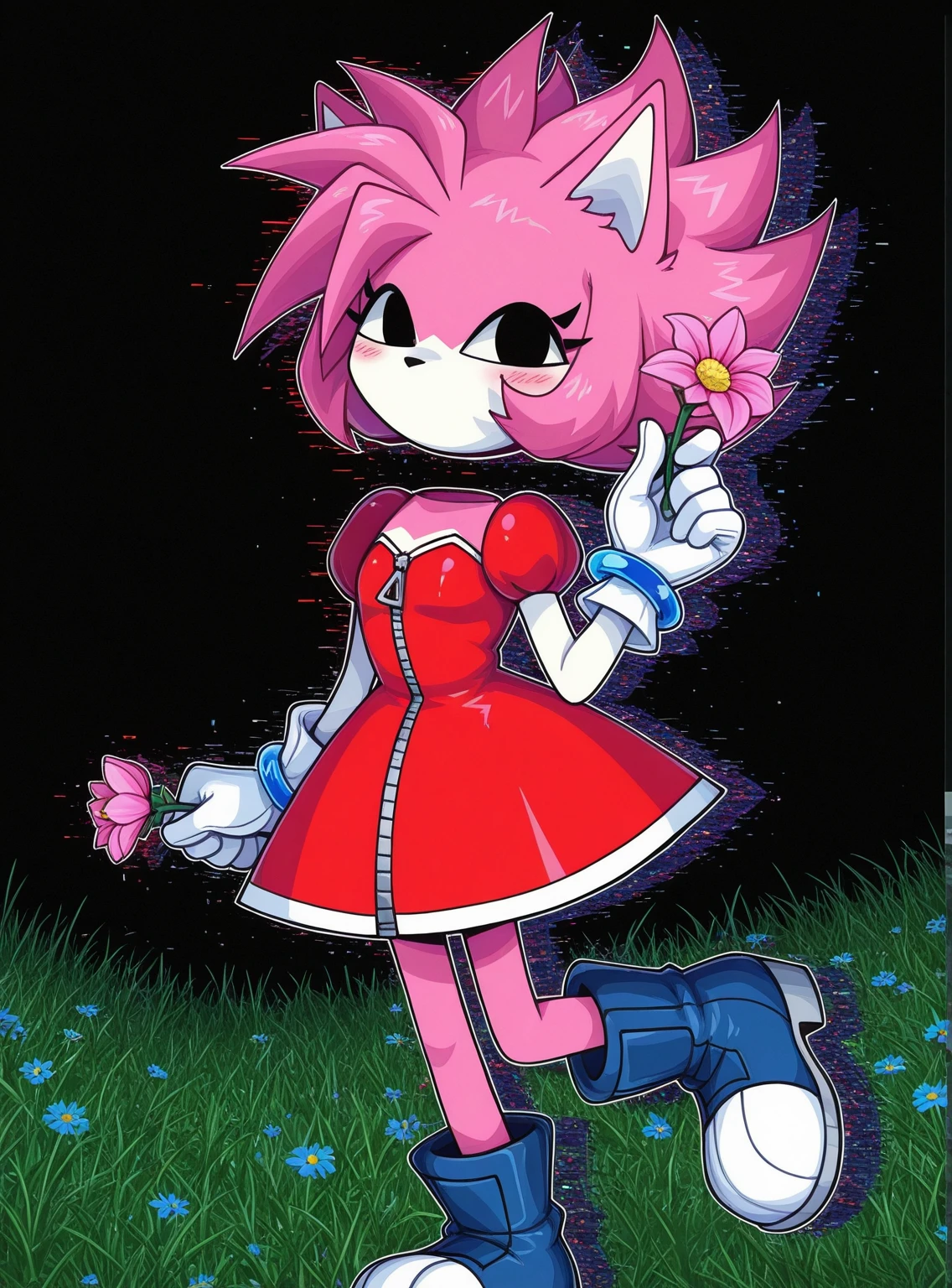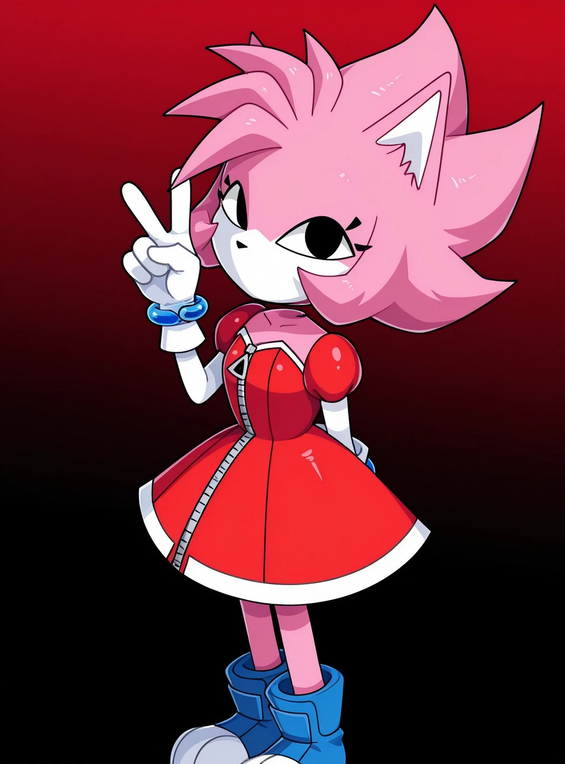 Tags: solo, 1girl, Malware_amy, (floating head, detached head:1.1), furry female, black eyes, pink fur, two-tone fur, pink hair, spiky hair, animal ears, black nose, mouthless, white-trimmed red dress, zipper, zipper pull tab, puffy short sleeves, white arms, white gloves, blue wrist rings, blue boots,