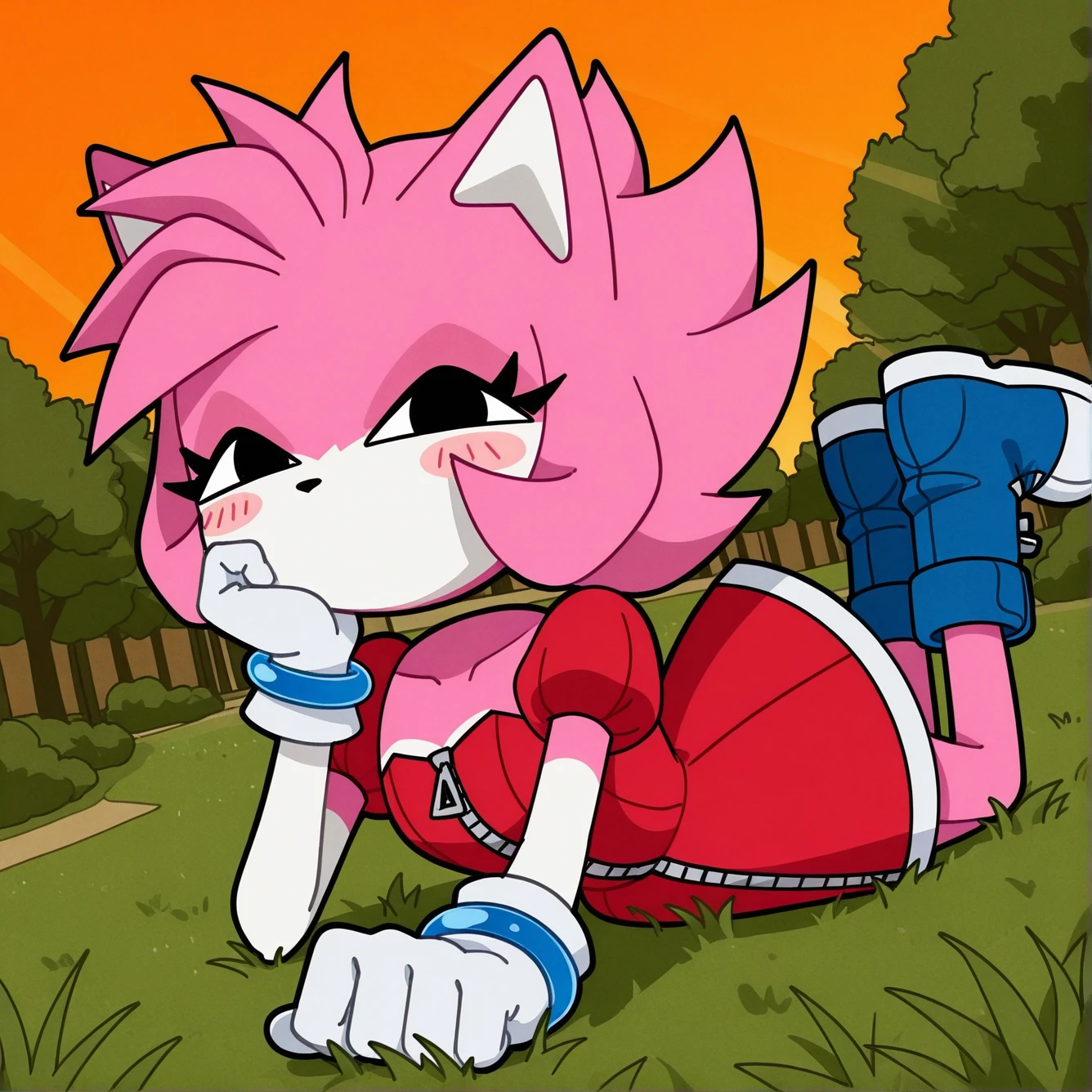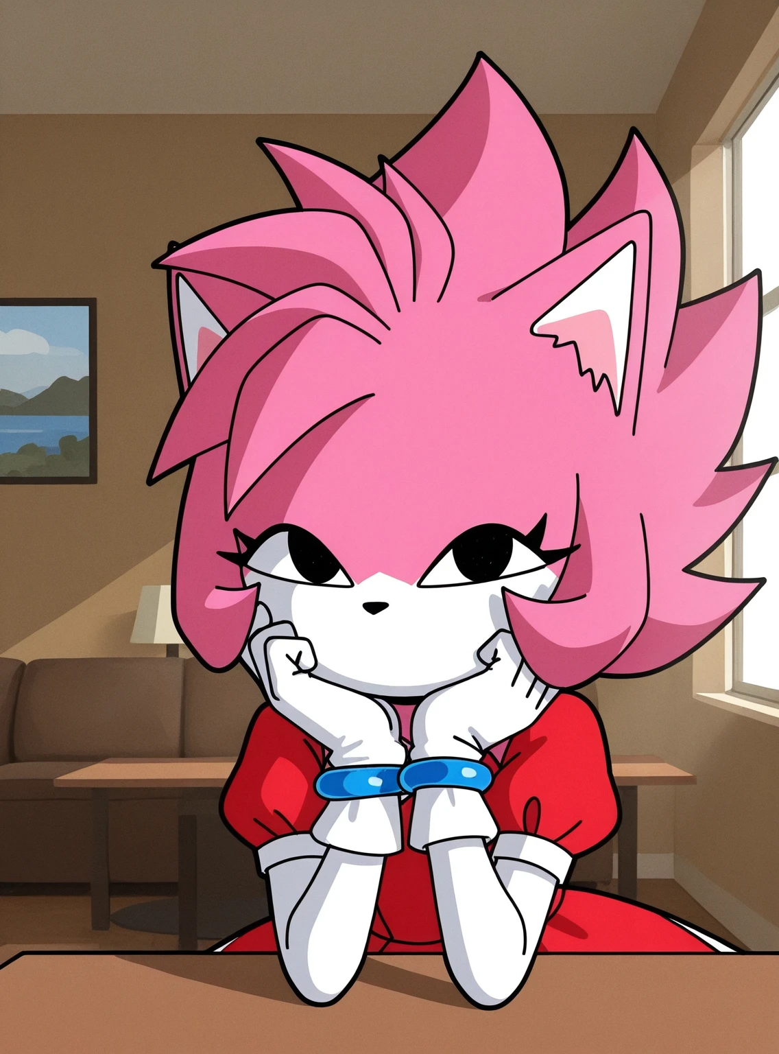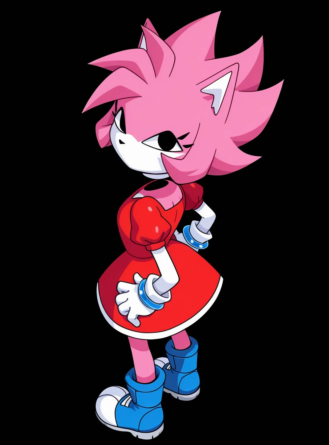 Tags: solo, 1girl, Malware_amy, (floating head, detached head:1.1), furry female, black eyes, pink fur, two-tone fur, pink hair, spiky hair, animal ears, black nose, mouthless, white-trimmed red dress, zipper, zipper pull tab, puffy short sleeves, white arms, white gloves, blue wrist rings, blue boots,