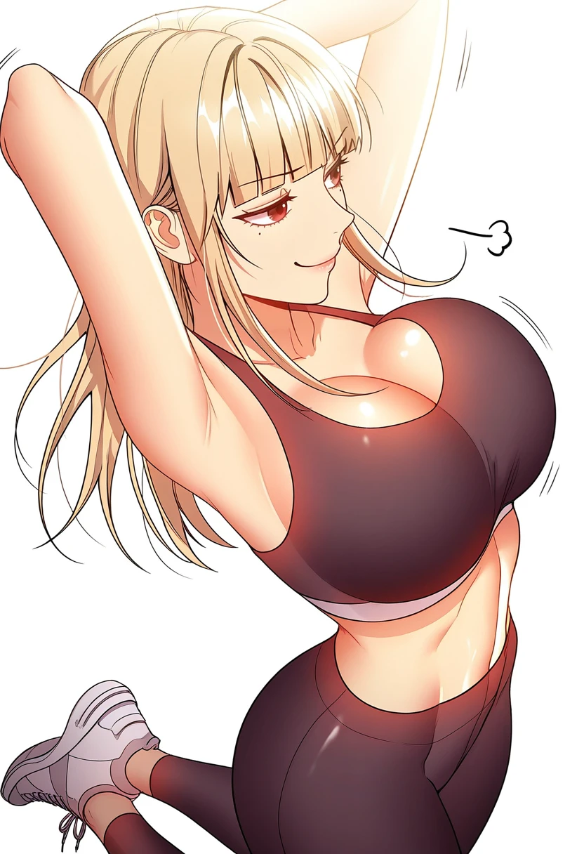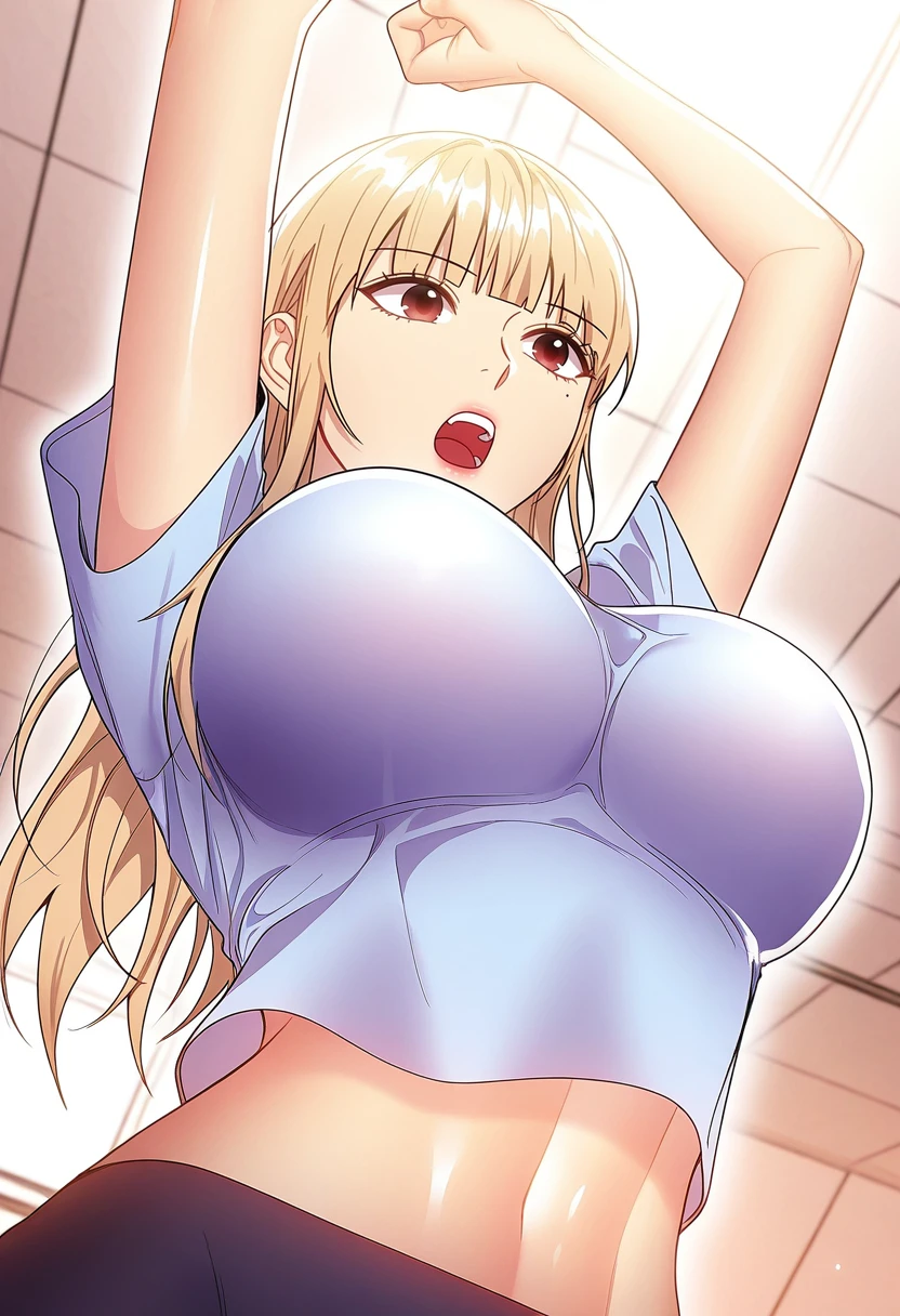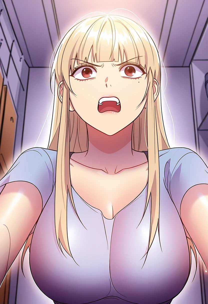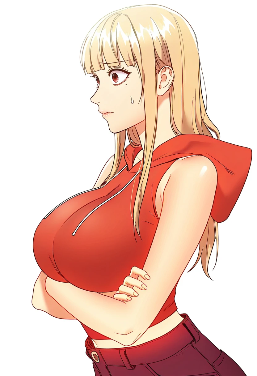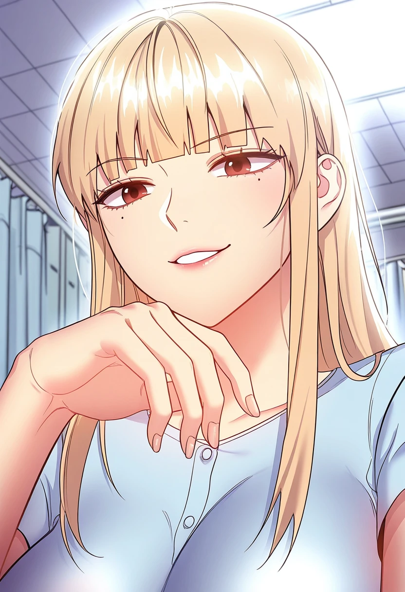 nayeon_cnr, 1girl,blonde hair, long hair, , mole under eye, brown eyes, blunt bangs, red eyes,
