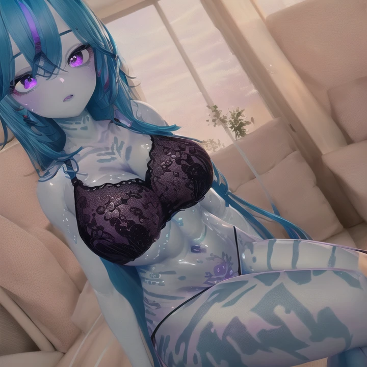 1girl, blue skin, purple skin marks, alien, 2 tails, artsy alien, purple eyes, blue hair,