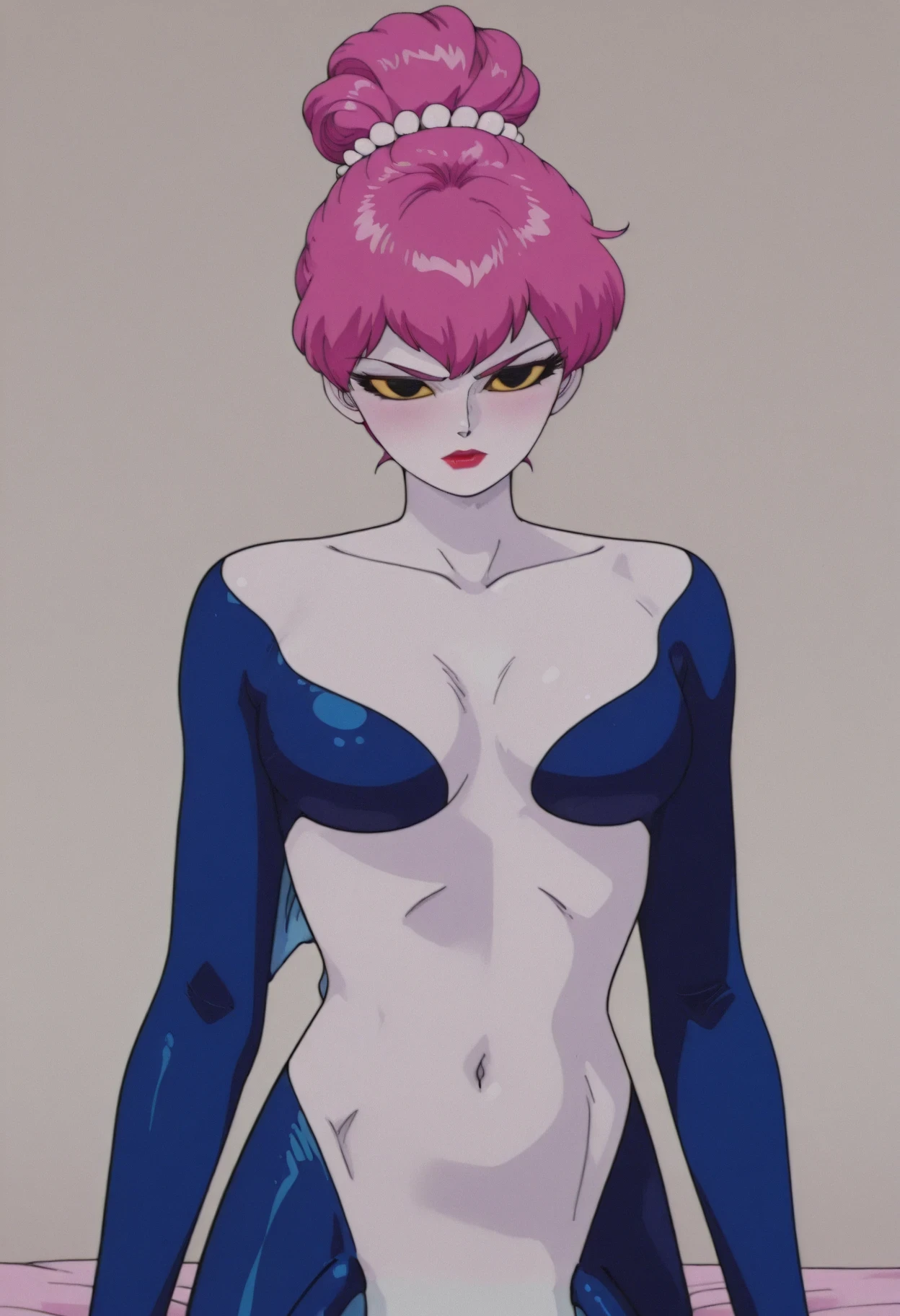 Kiss, blush, on a bed, , with a man, anime retro 90 style, red lipstick, blue skin mermaid tail, best quality, Blue skin , 1girl, masterpiece, straight pink bun hair, , navel, pale white skin, thick long black eyelashes makeup, black eyes, white skin, blue skin arms, blue skin , makeup, yellow sclera, mermaid, hair pearl accessories,