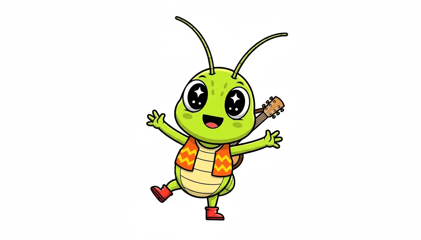 A LoRA of the character João Grilo, a friendly green cricket for children's content. Features: vibrant green skin, large expressive eyes, a red and yellow patterned vest, and iconic bright red boots. Style: Clean 2D vector animation, high contrast, preschool cartoon aesthetic. Works best with flat colors and simple backgrounds