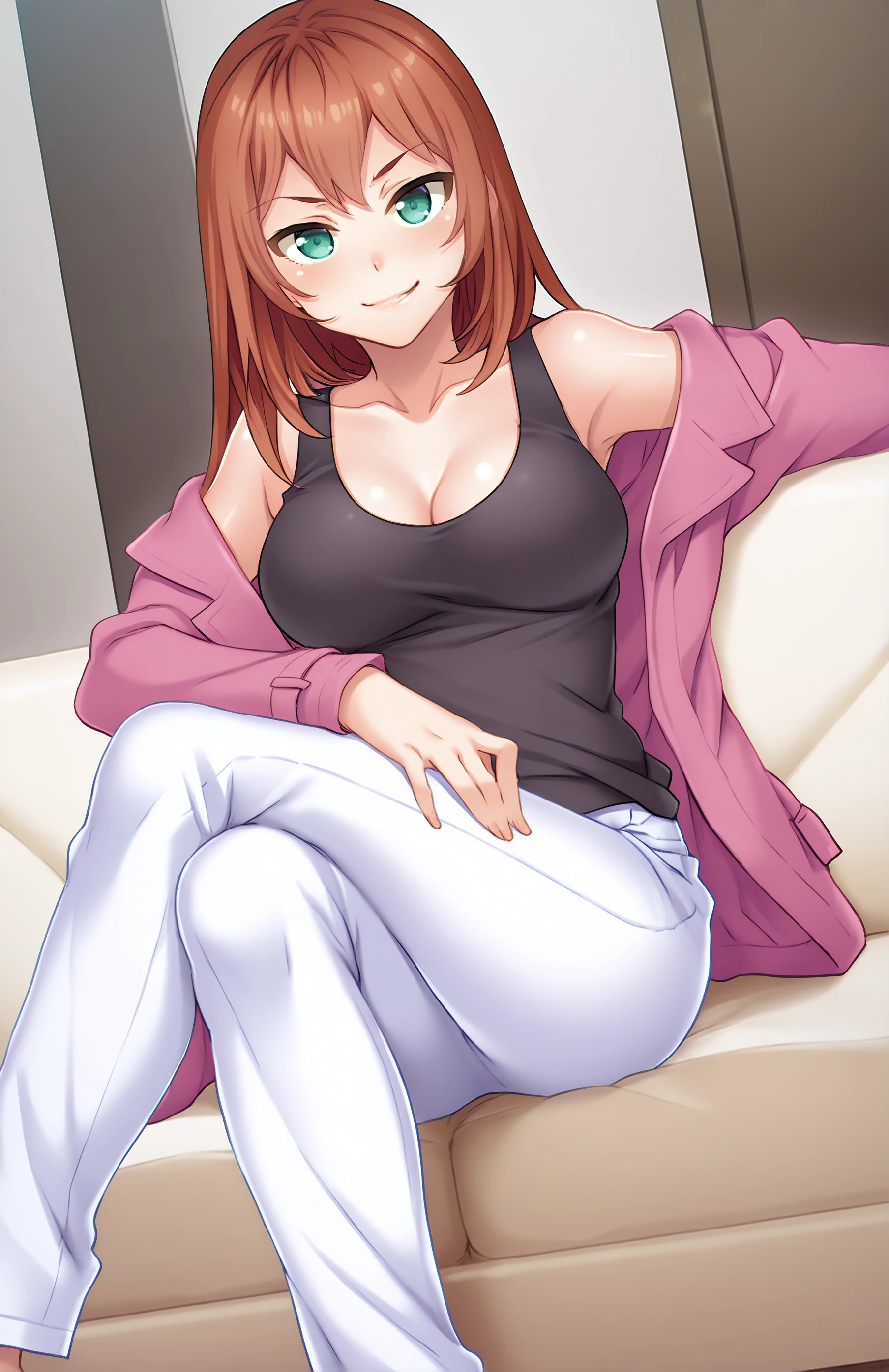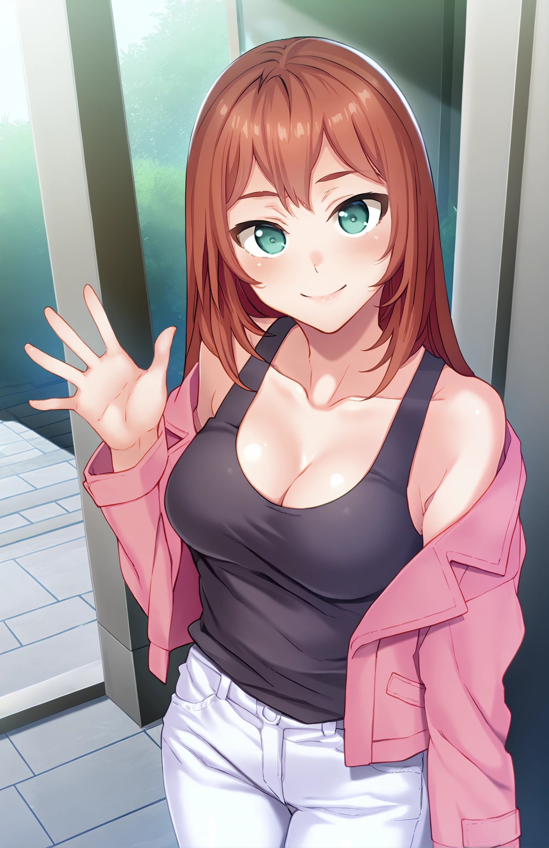 EndouYurika, long hair, breasts, bangs, brown hair, shirt, long sleeves, cleavage, medium breasts, green eyes, collarbone, jacket, , pants, , tank top, black top, white pants, denim, pink jacket