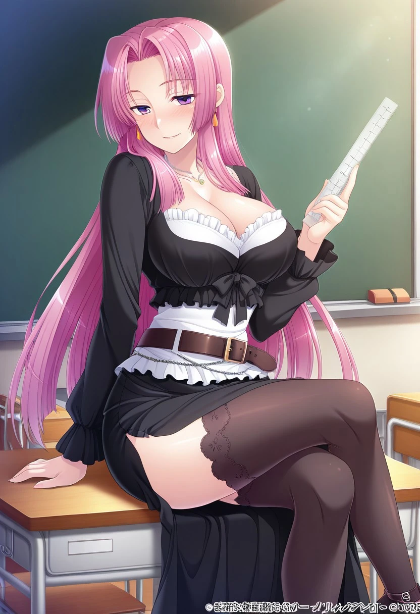 pink hair, parted hair, hair intakes, purple eyes, large breasts, long hair,