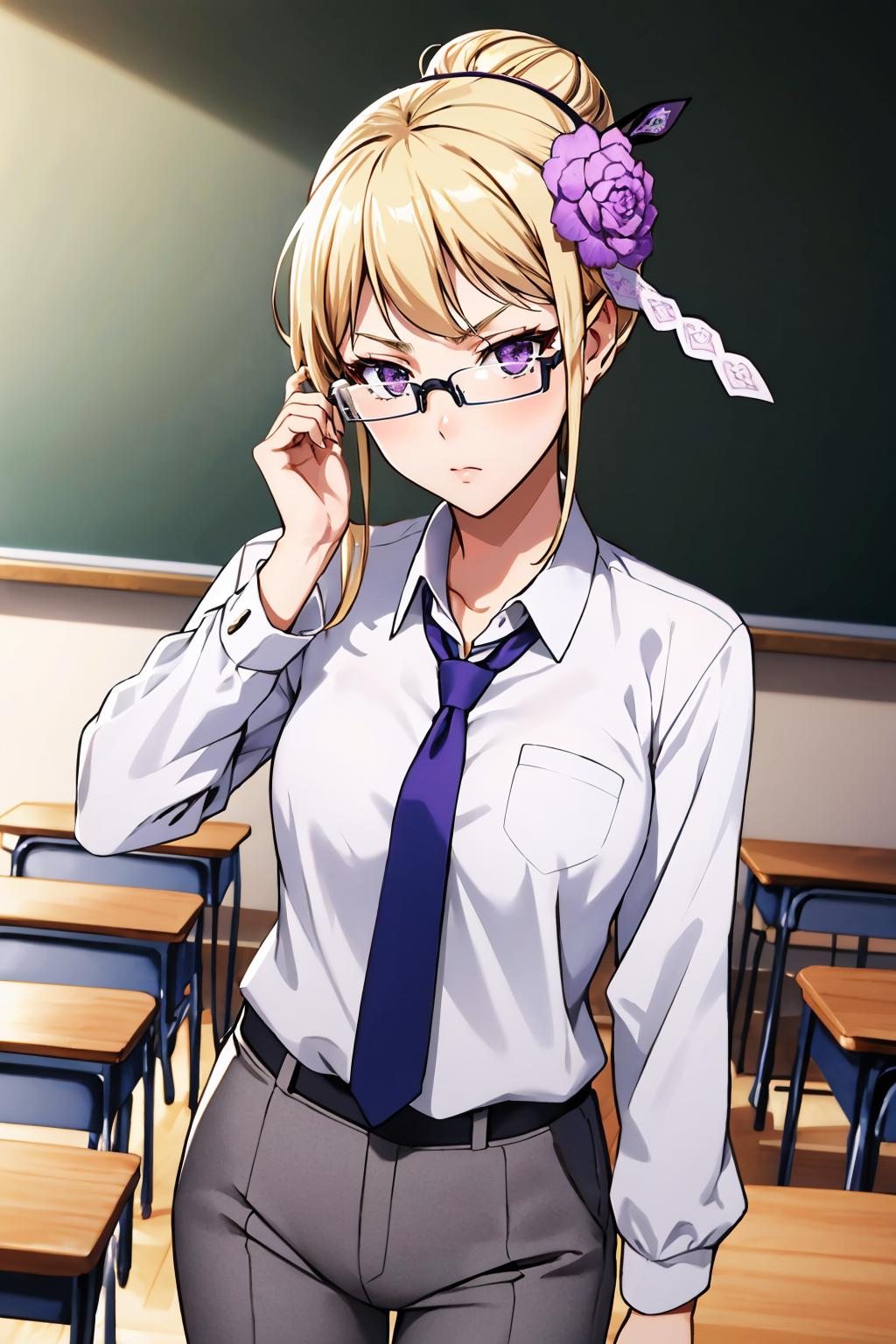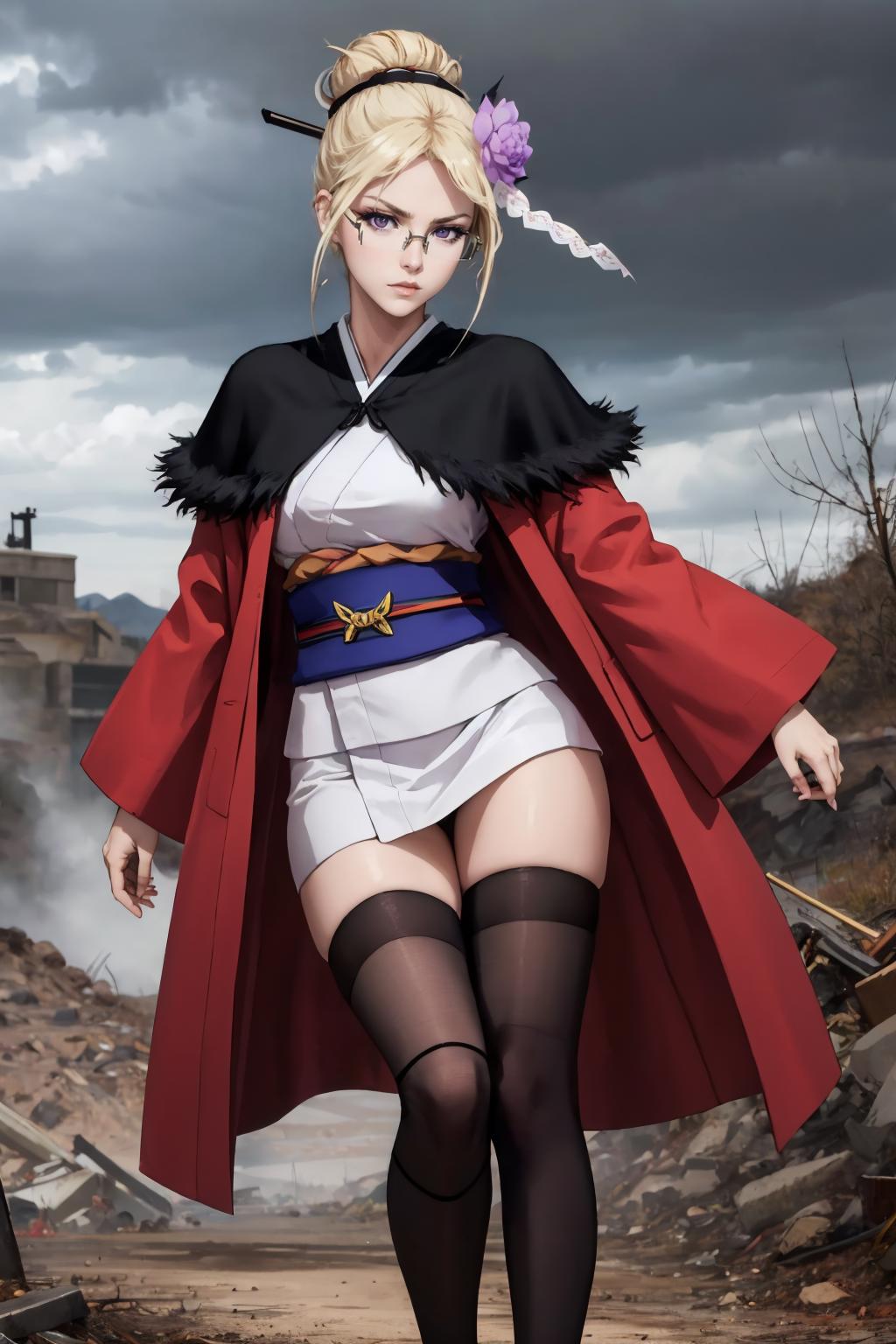 Add "glasses, single hair bun, hair ornament, hair flower, black capelet, red coat, white kimono, sash, thighhighs" for her typical look.