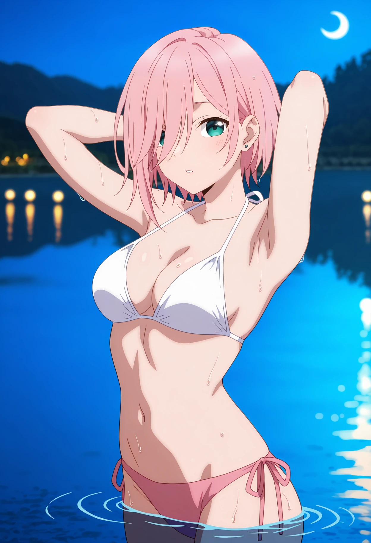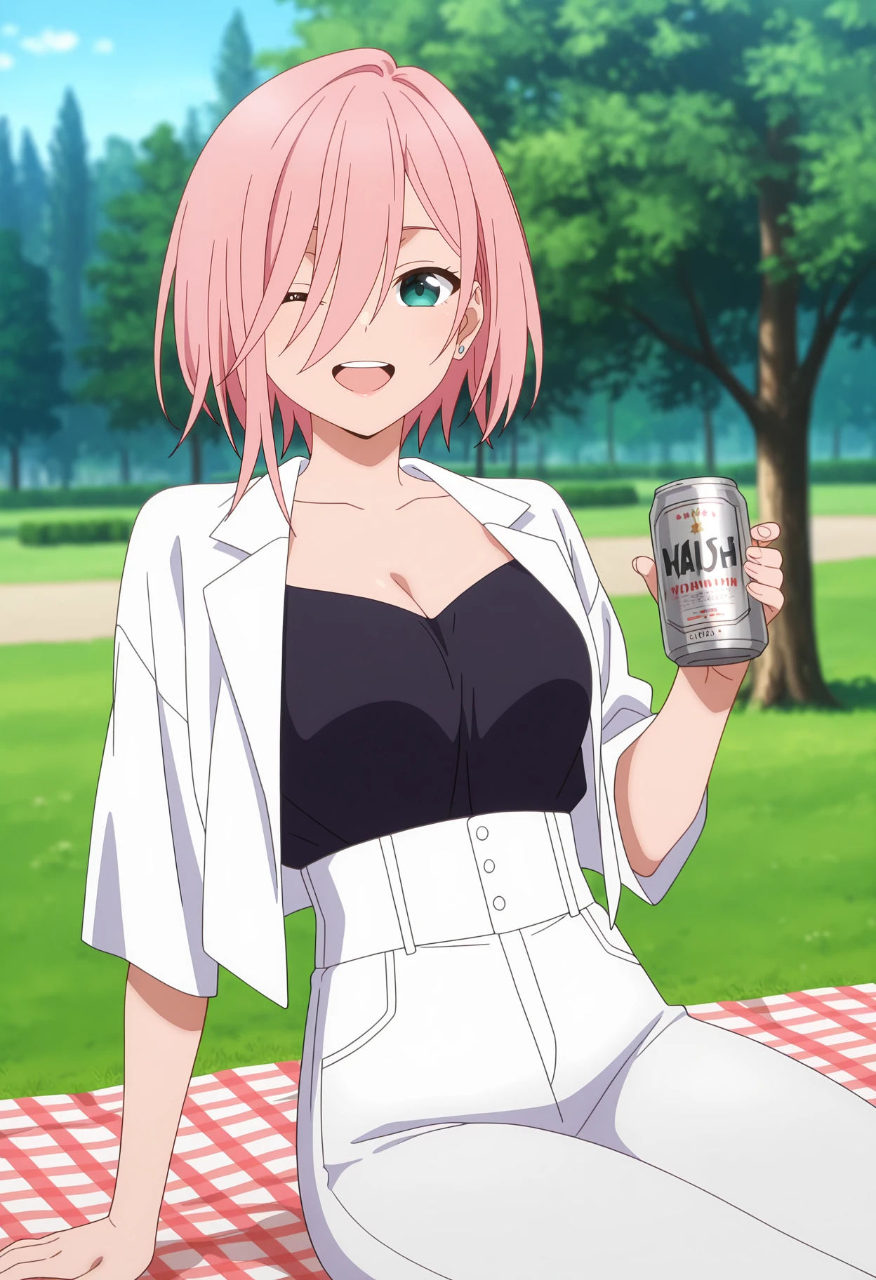 hair over one eye, short hair, pink hair, green eyes, stud earrings