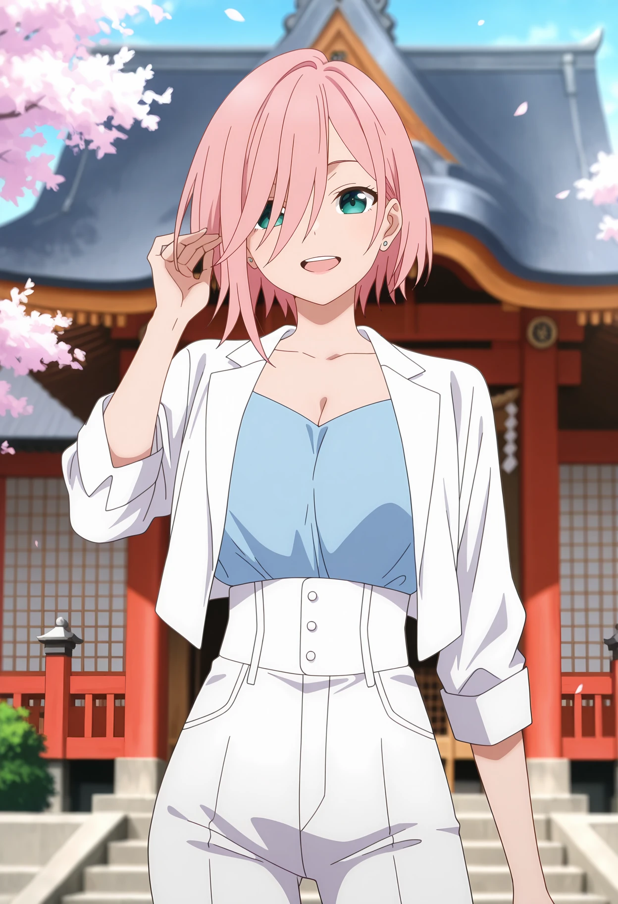 white jacket, blue shirt, cleavage, medium breasts, high-waist pants, white pants