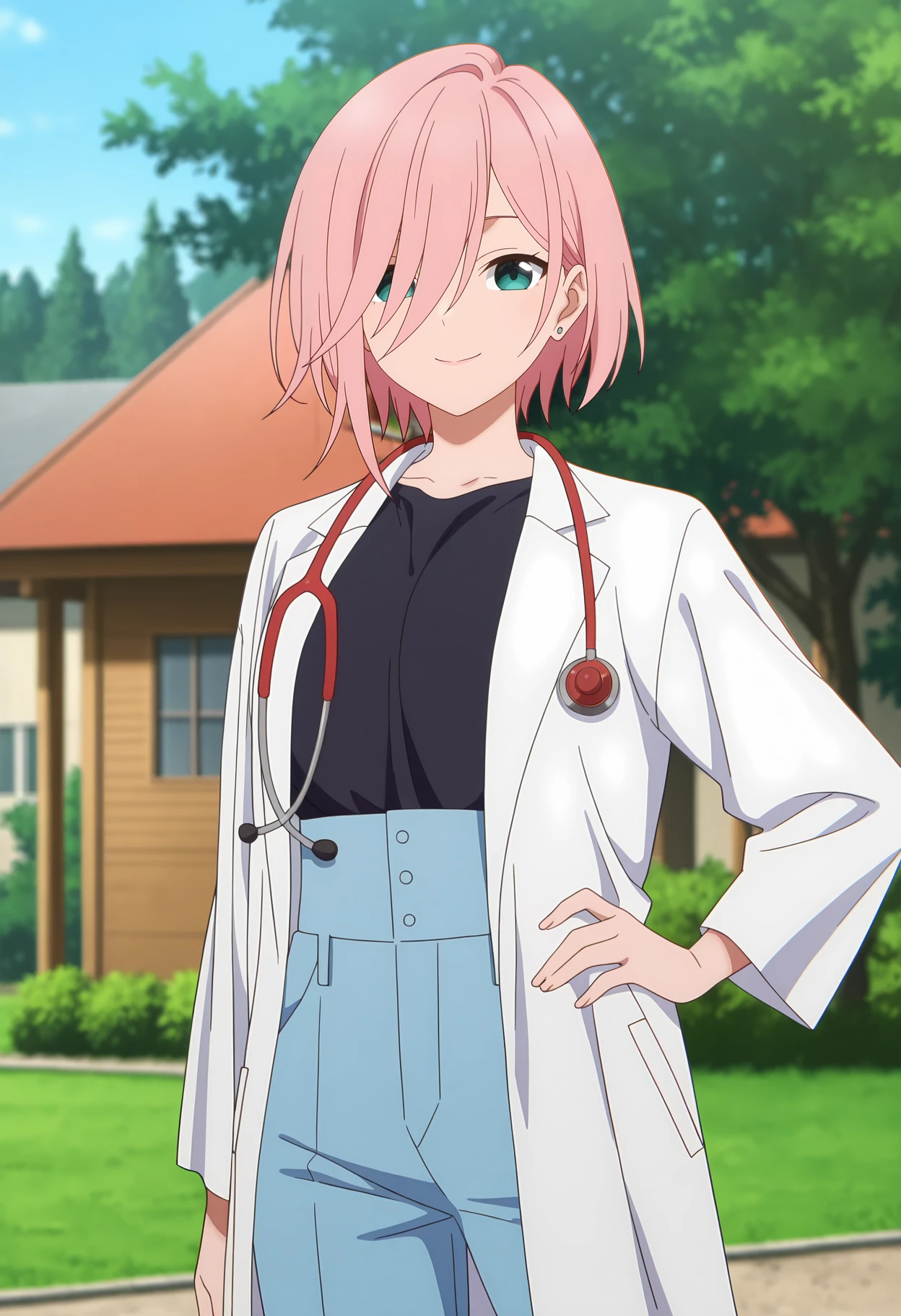 lab coat, white coat, black shirt, stethoscope, high-waist pants, blue pants