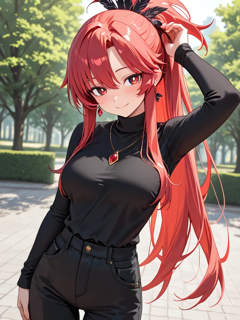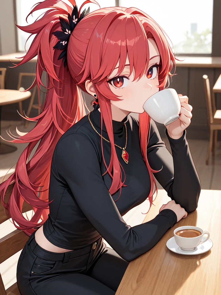 casual clothes,hair tie ponytail,black tie ponytail,red earring,black shirt,long sleeves,necklace with red gemstone,black pants,