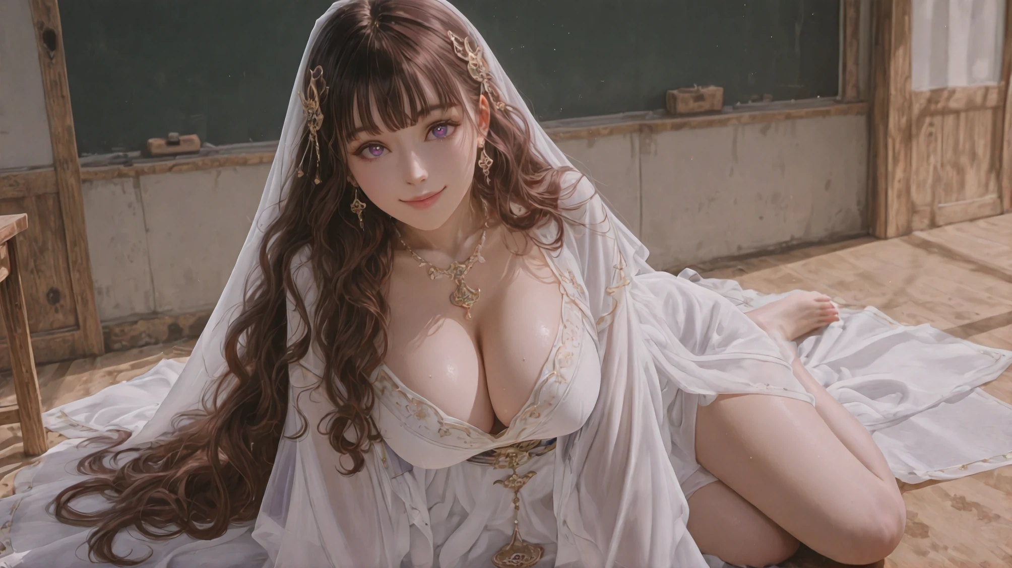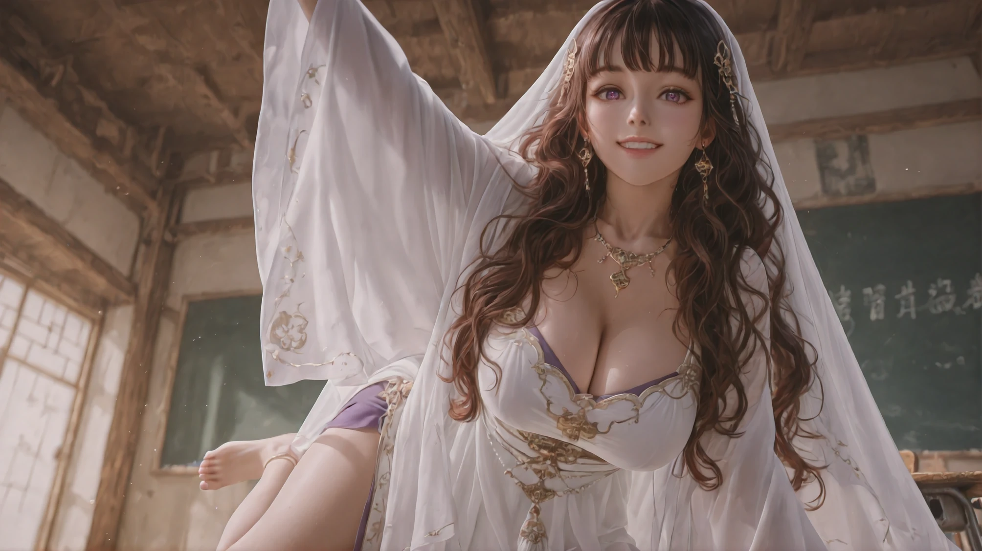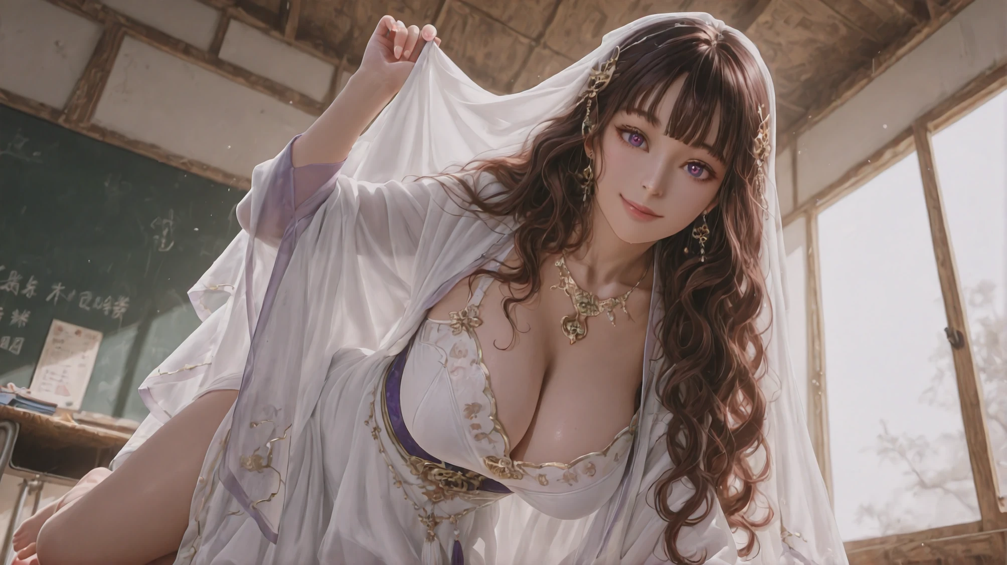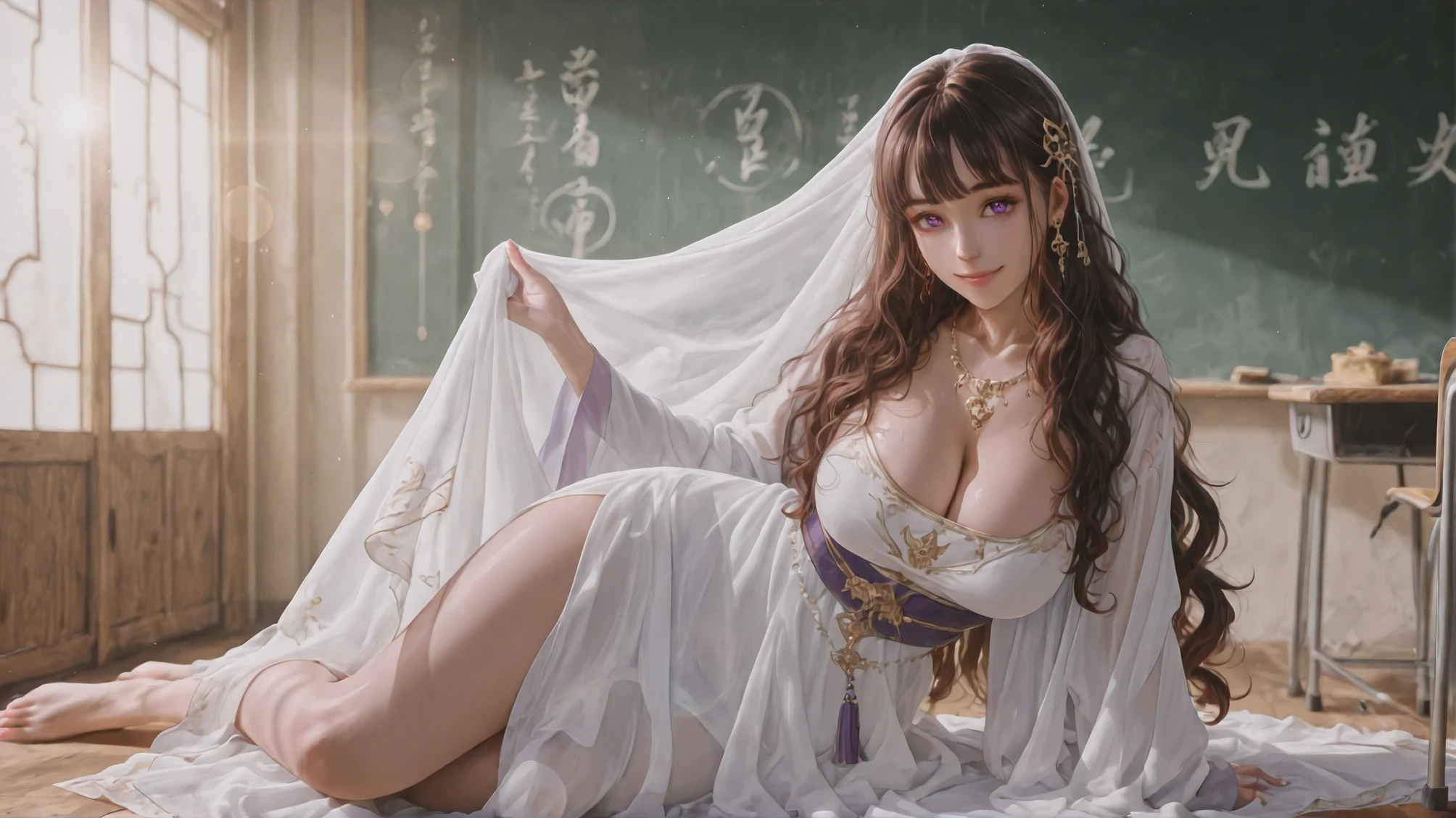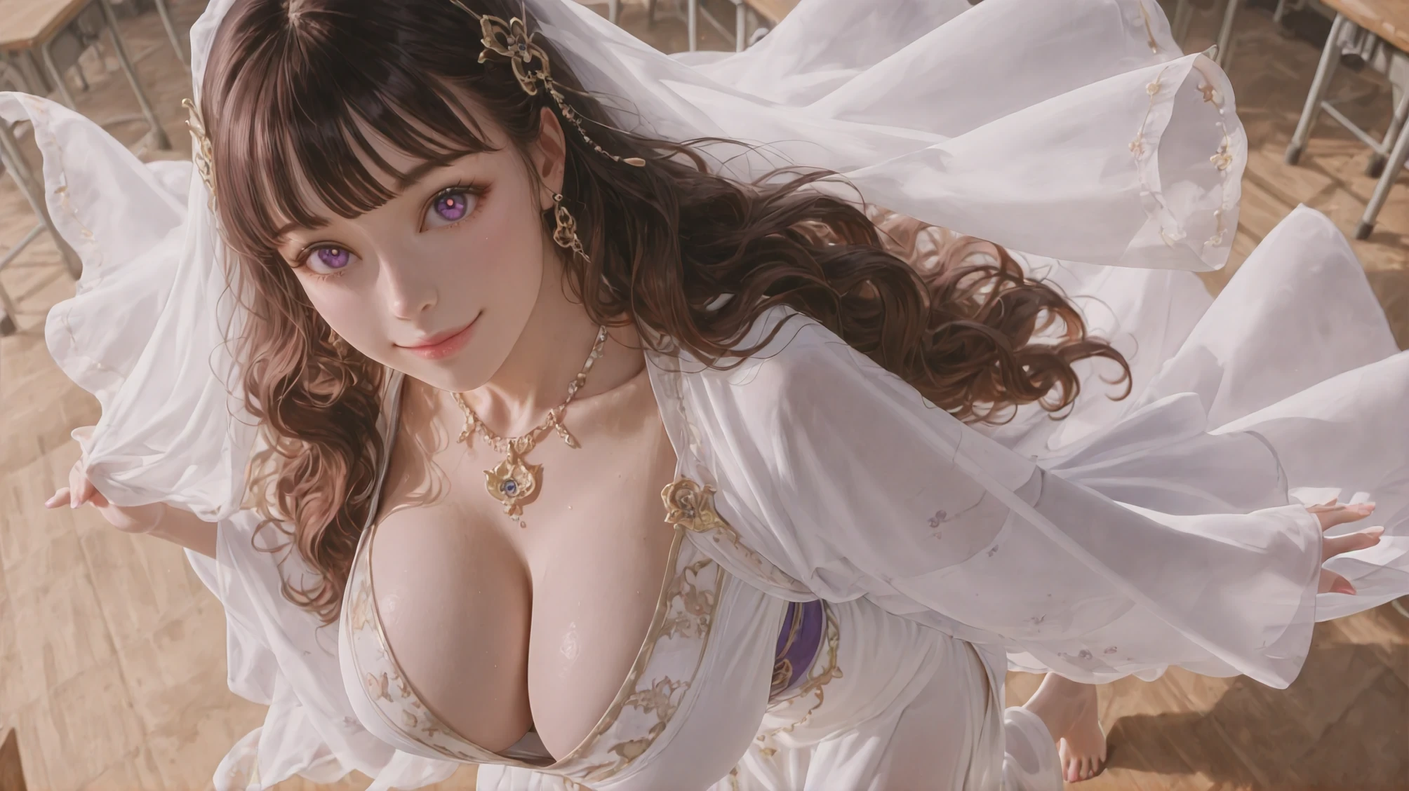 Terpsichore Lune: Where Moonlight Weaves With Saffron Dust,dress,white dress,jewelry,chinese clothes,necklace,white veil,shaw,hair ornament,barefoot,haori,earrings,embroidery