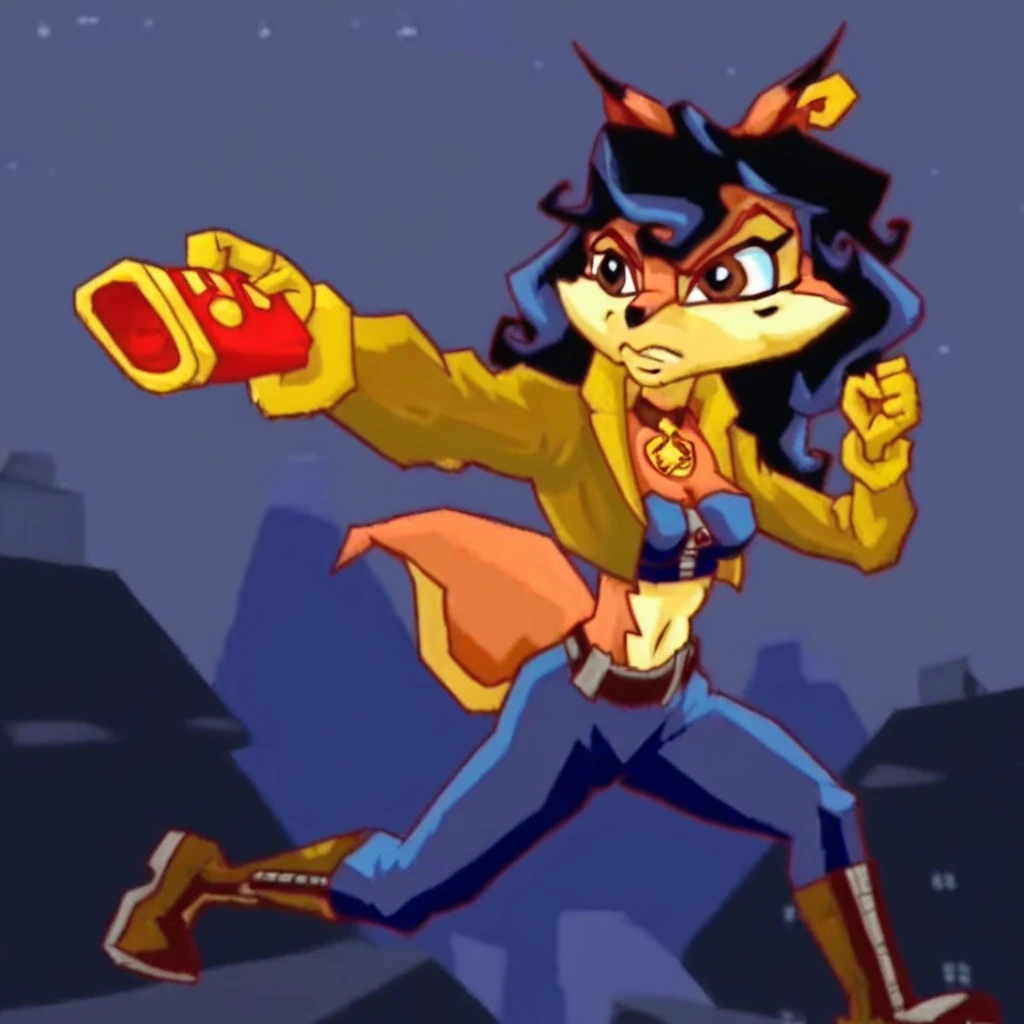 foxy features, two-tone skin, dark orange fur,fox ears, bushy fox tail, hazel eyes, dark blue hair, long hair,