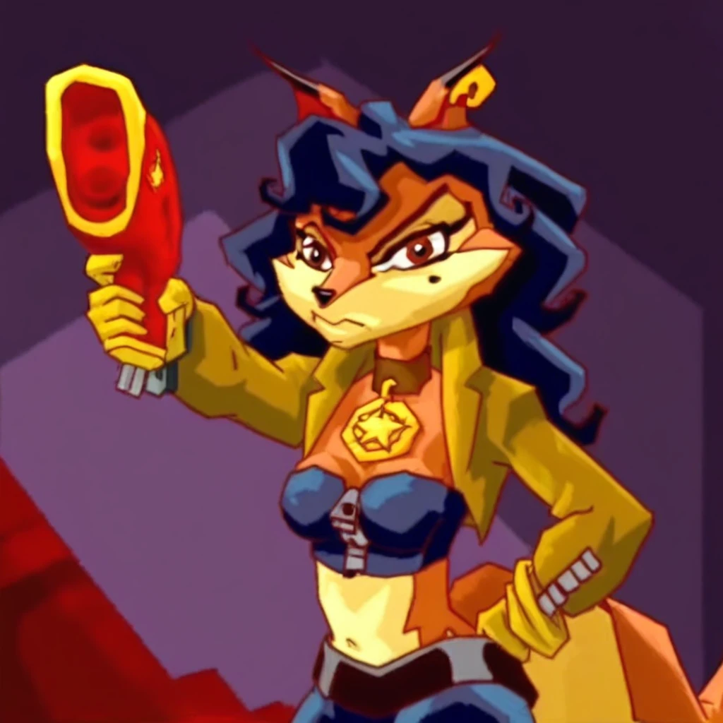 muddy-brown jacket, Cop badge, gold hoop earring, dark blue tube top, midriff, dark blue leggings,