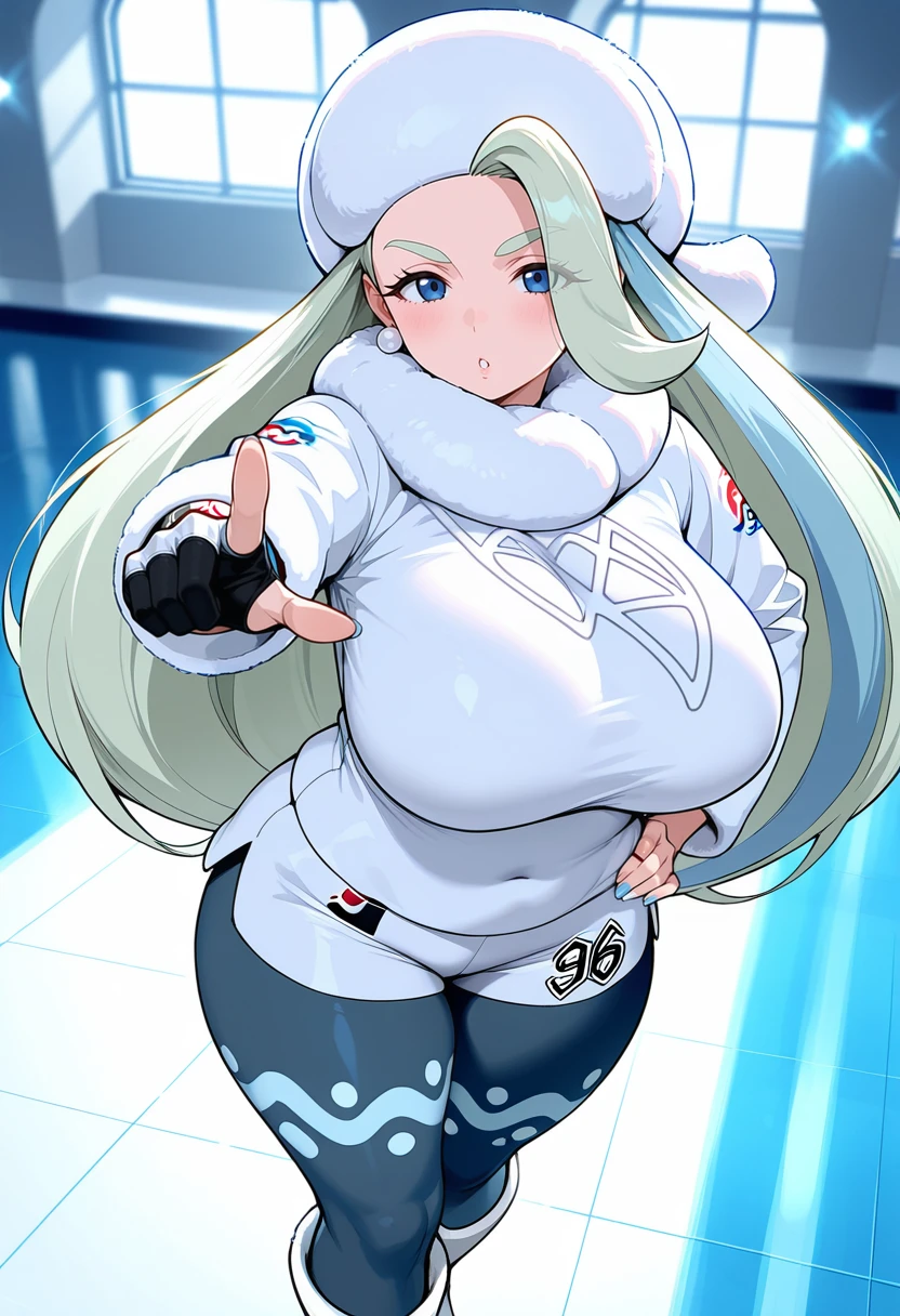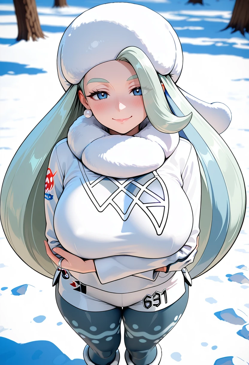 melony (pokemon), mature female, 1girl, long hair, streaked hair, light blue hair, blue eyes, huge breasts, pearl earrings, lips,Styles Prompt (Please choose and use whichever style you prefer among the three):