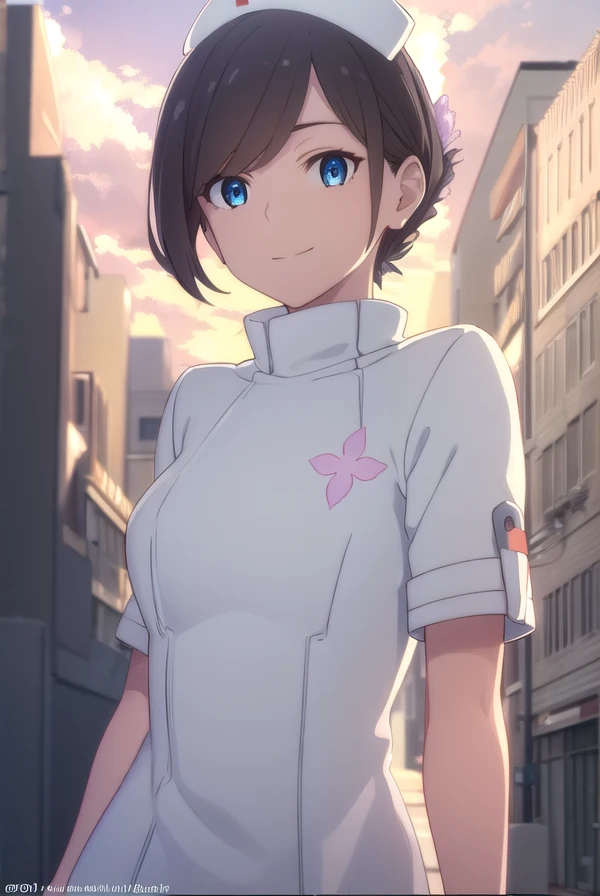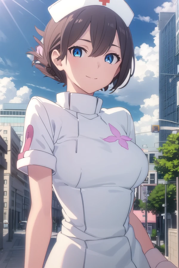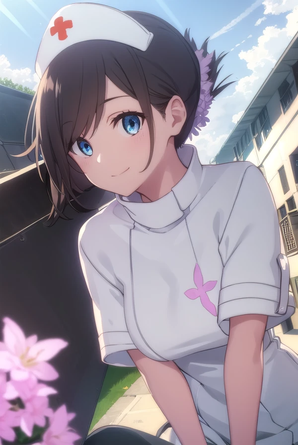v juli f, short hair, blue eyes, brown hair, flower, hair flower,