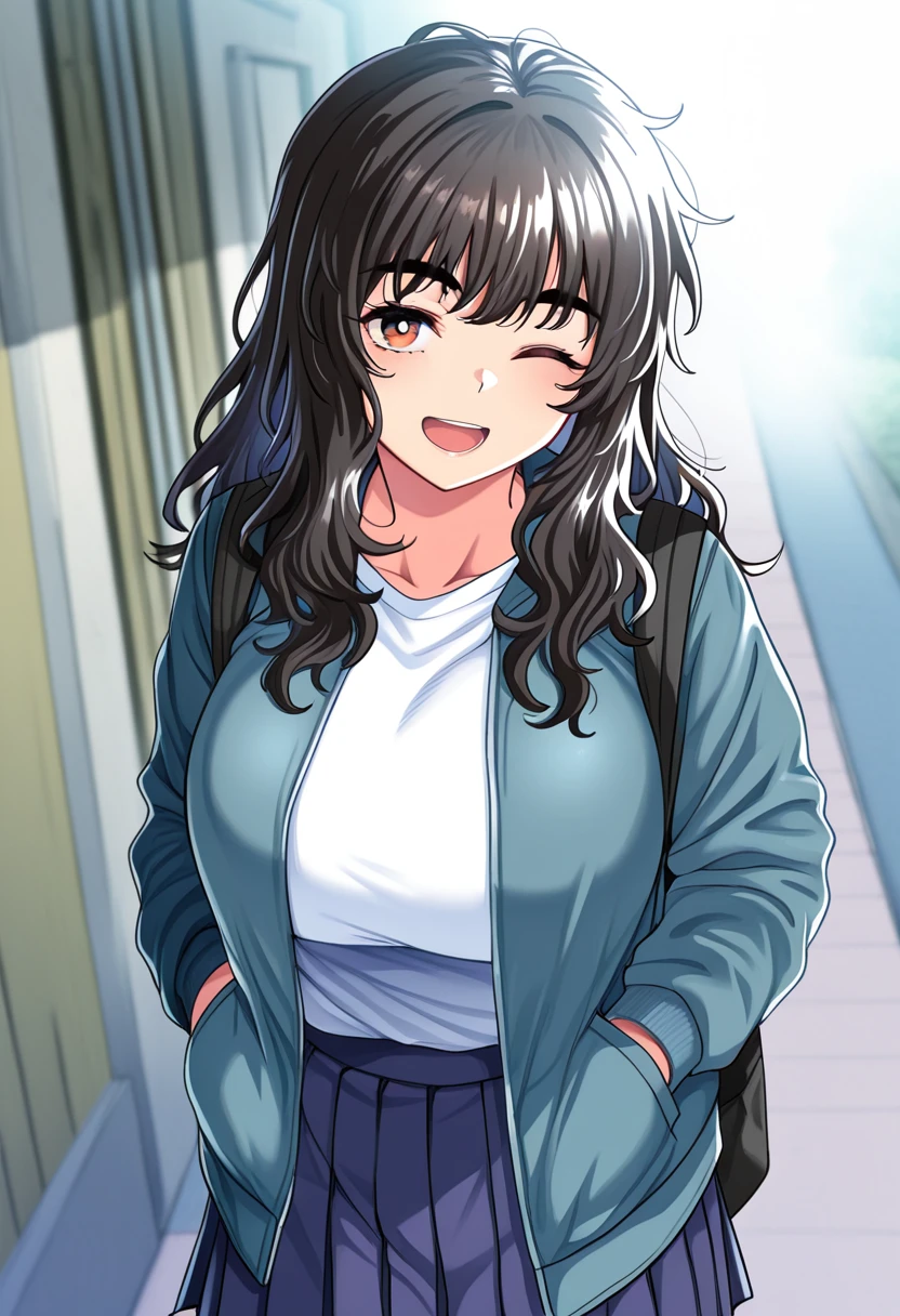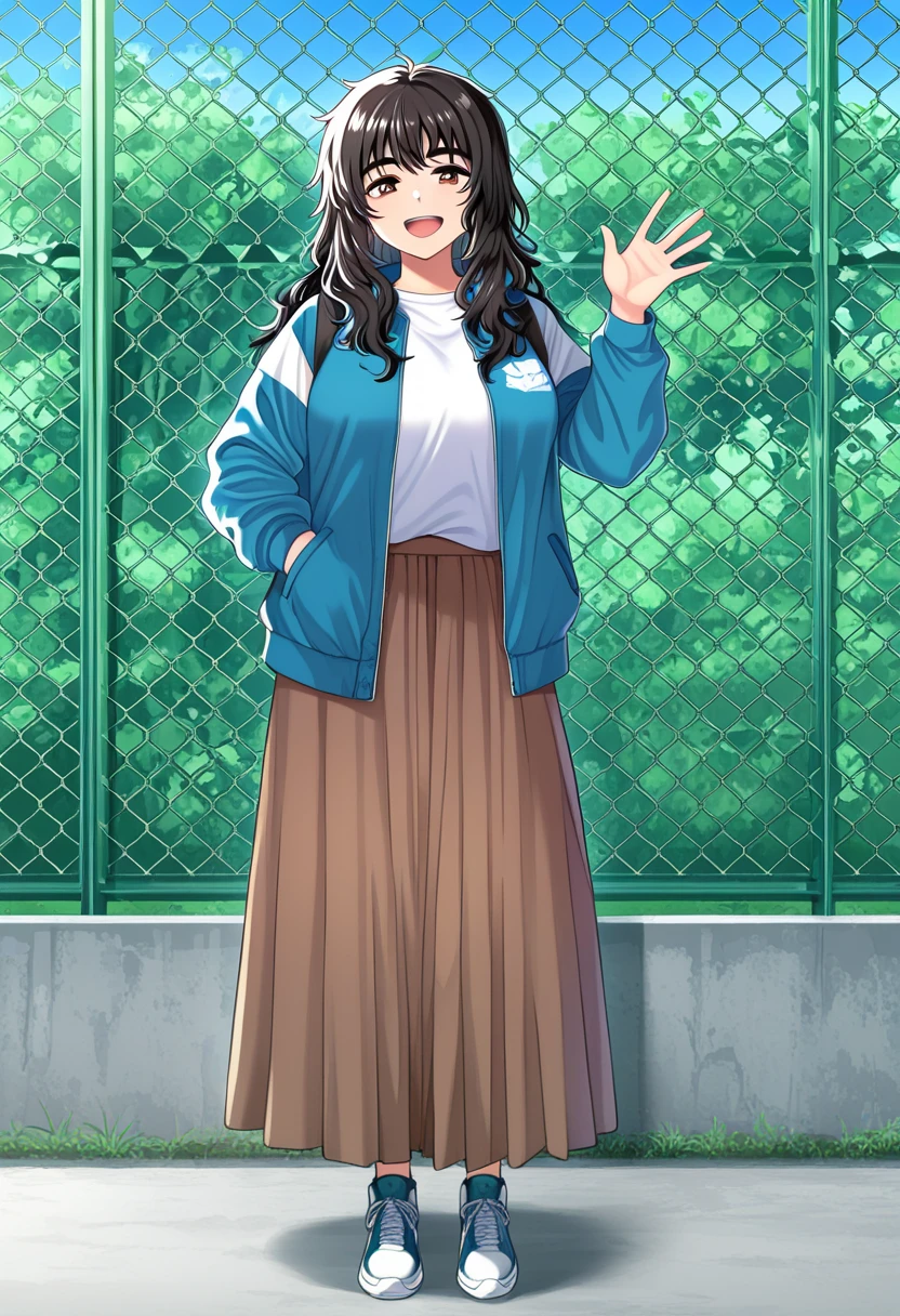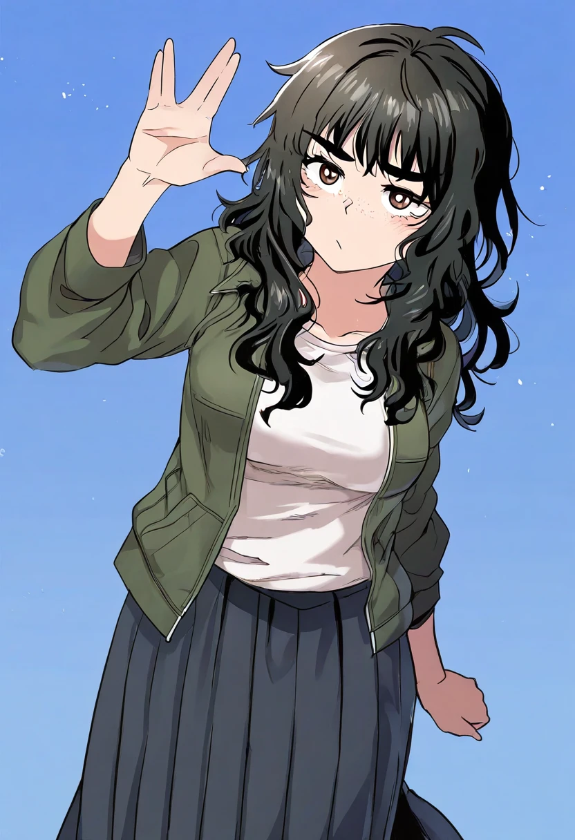 1girl, sayanee, black hair, long hair, brown eyes, freckles, long skirt, jacket, shirt