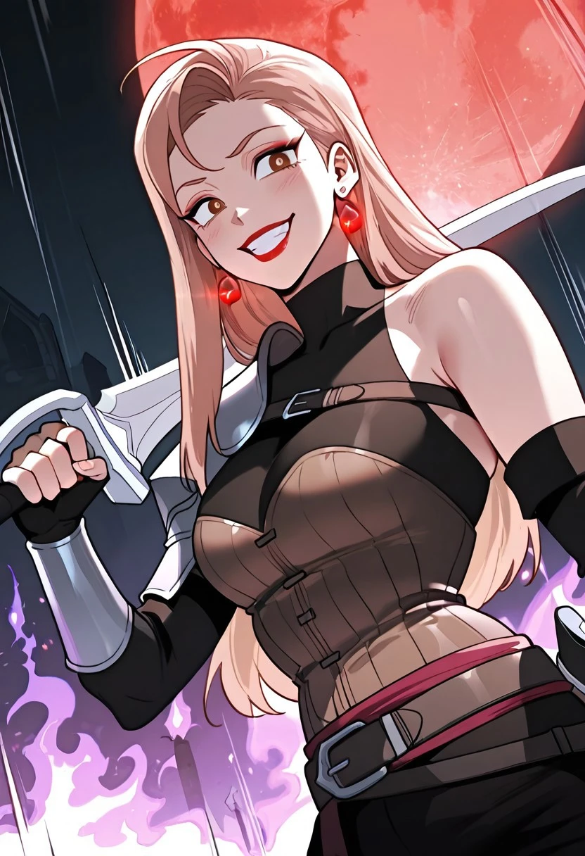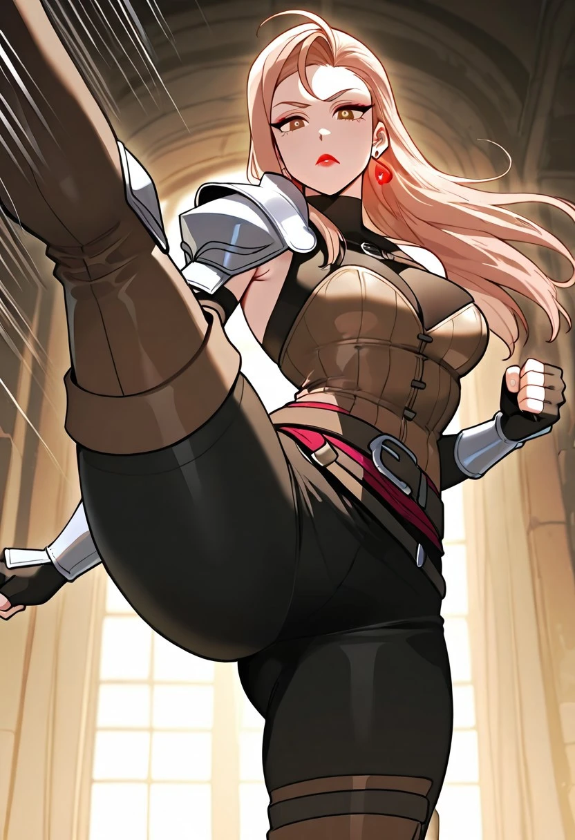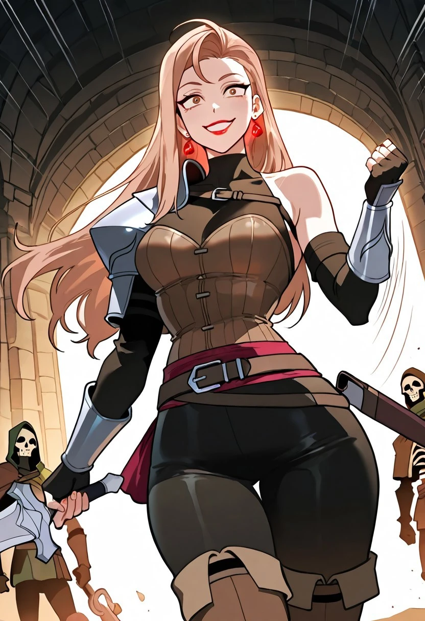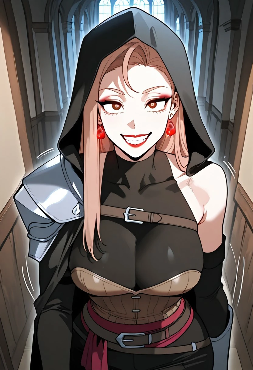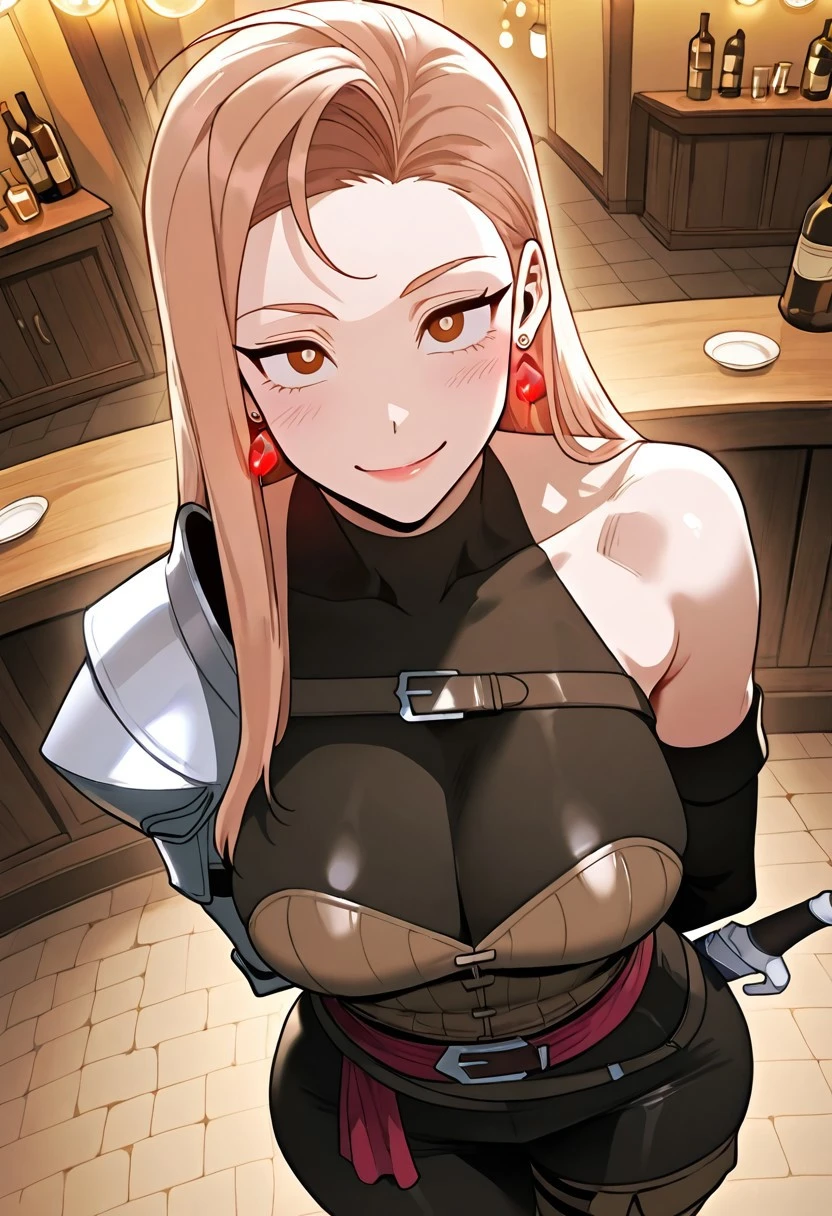 sleeveless high-neck black top, single medieval iron shoulder armor with brown strap, brown corset, iron forearm armors, medieval sword brown scabbard with brown strap hangers,