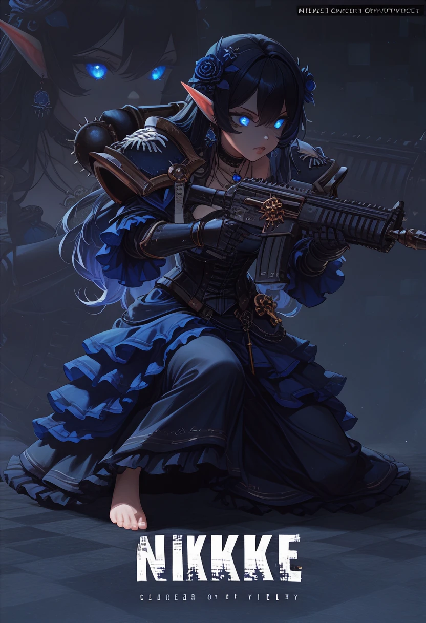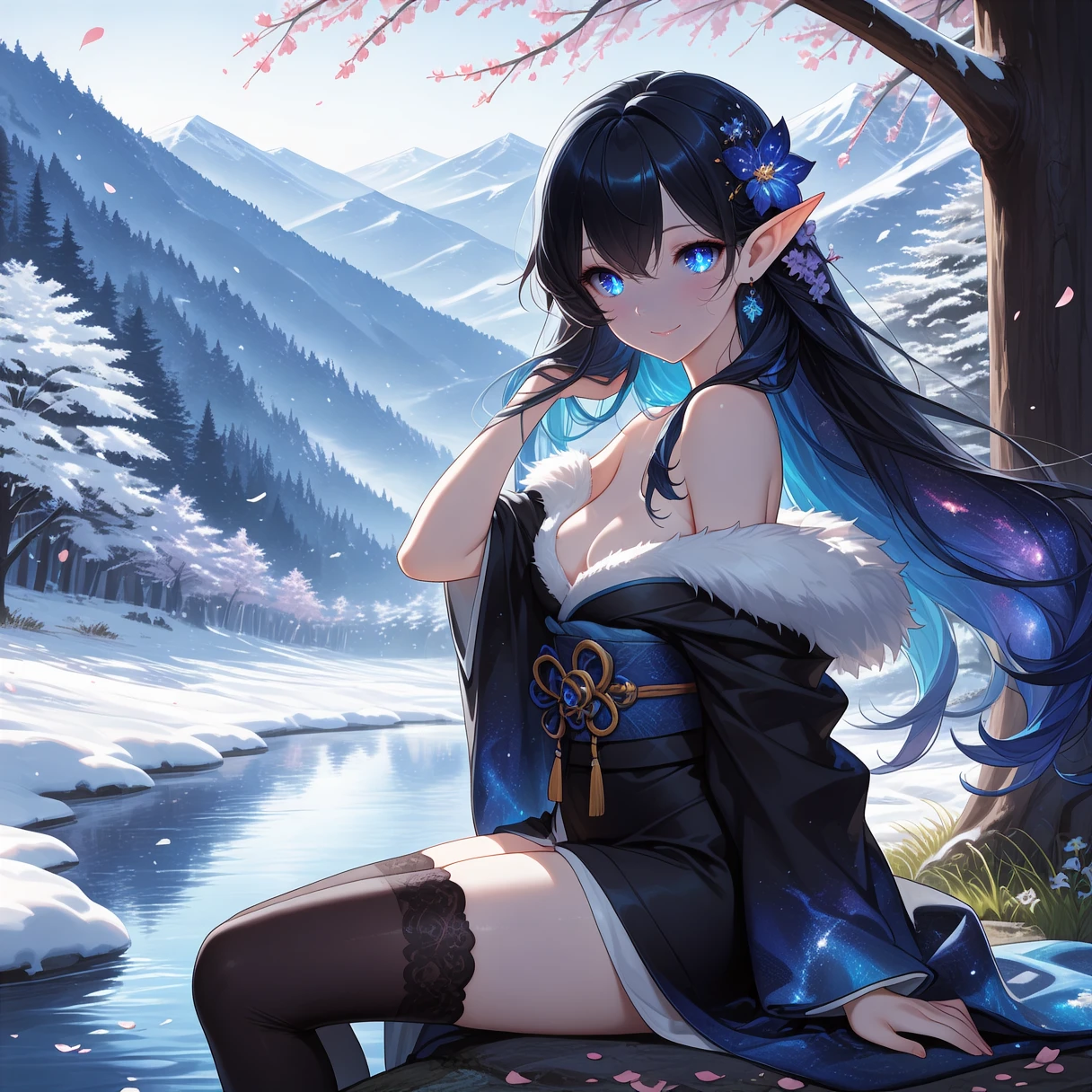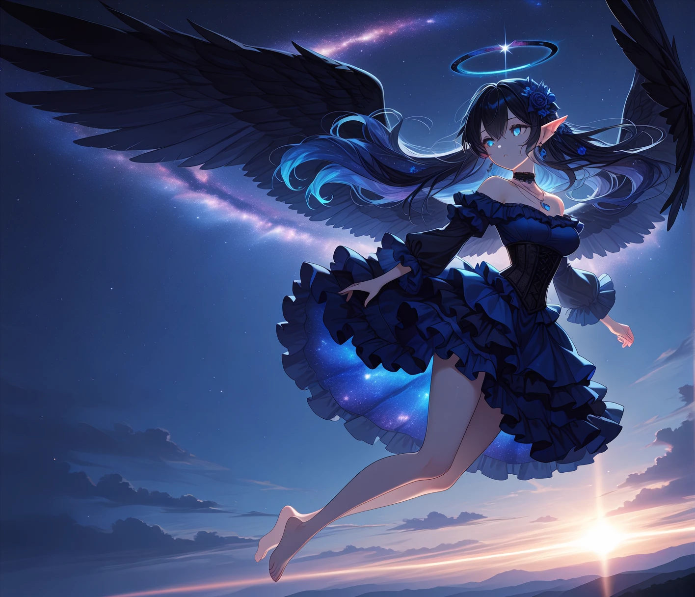 3lf, blue eyes, glowing eyes, long hair, black hair, gradient hair, galaxy hair, hair between eyes, flower hair ornament, elf ears, pointy ears, pale skin, small breasts, choker, gemstone necklace , earrings, two tone dress, blue dress, black dress, off shoulder dress, frilled dress, ruffled sleeves, corset, layered skirt, frilled skirt, barefoot, umbrella, starry sky print, holding umbrella,