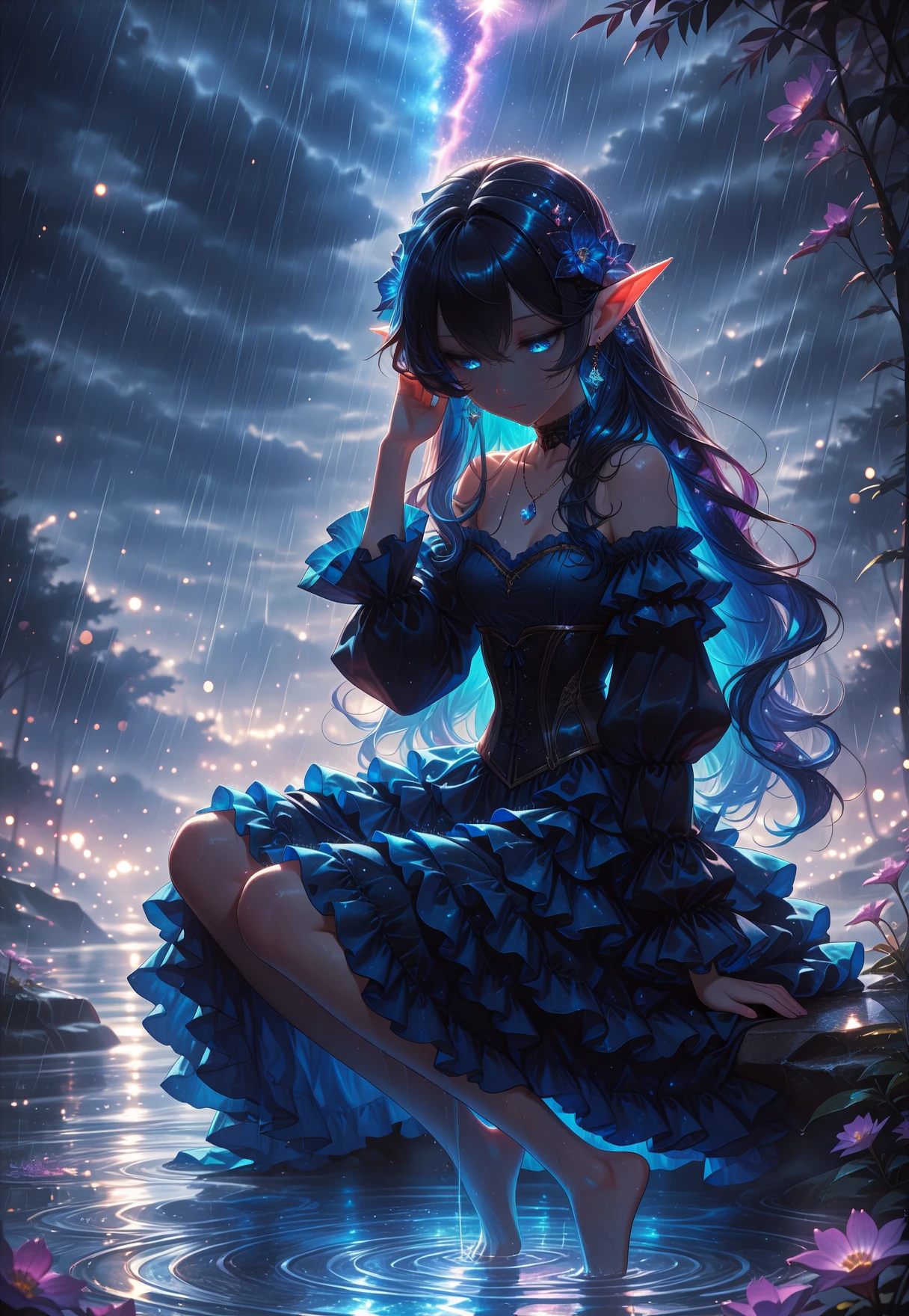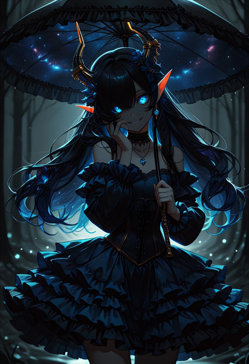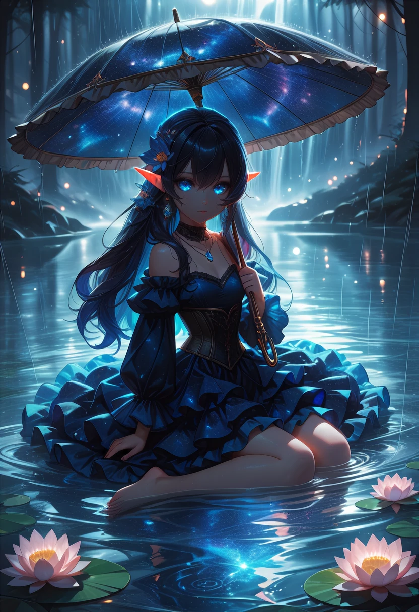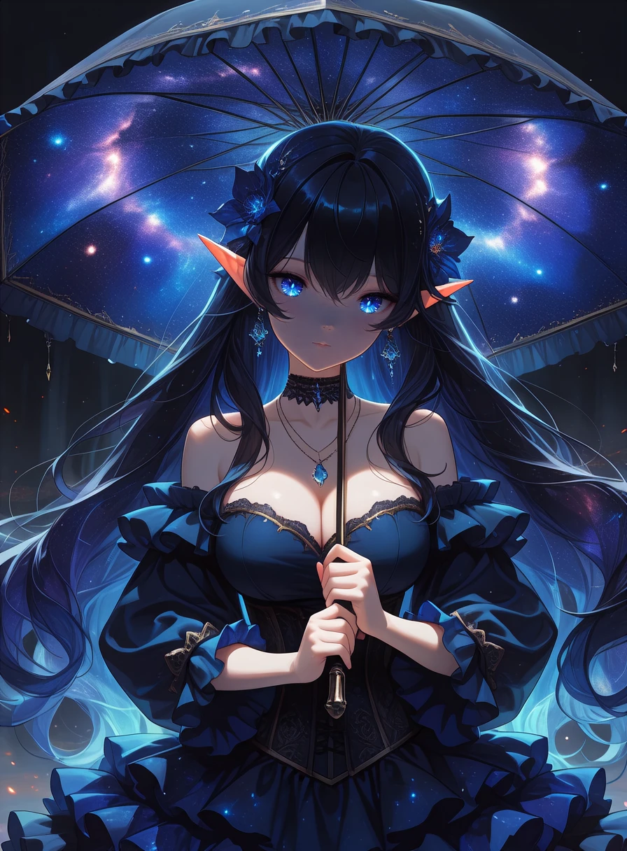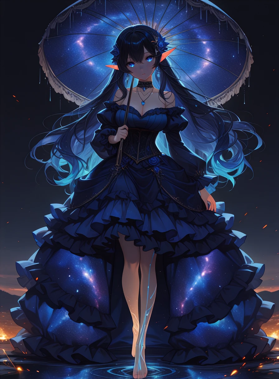 3lf, blue eyes, glowing eyes, long hair, black hair, gradient hair, galaxy hair, hair between eyes, flower hair ornament, elf ears, pointy ears, pale skin, small breasts, choker, gemstone necklace , earrings, two tone dress, blue dress, black shoulder dress, frilled dress, ruffled sleeves, corset, layered skirt, frilled skirt, barefoot, umbrella, starry sky print, holding umbrella,