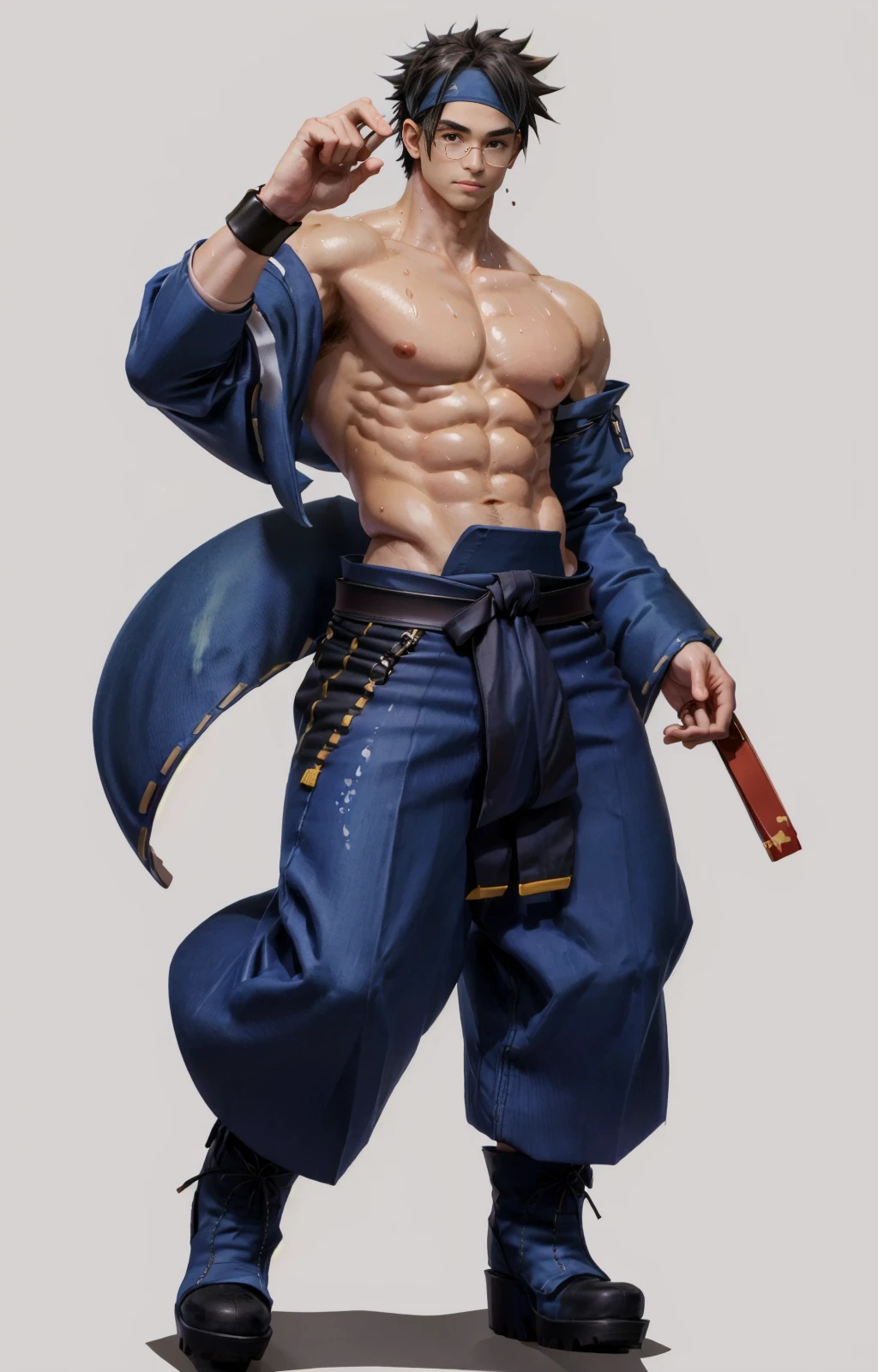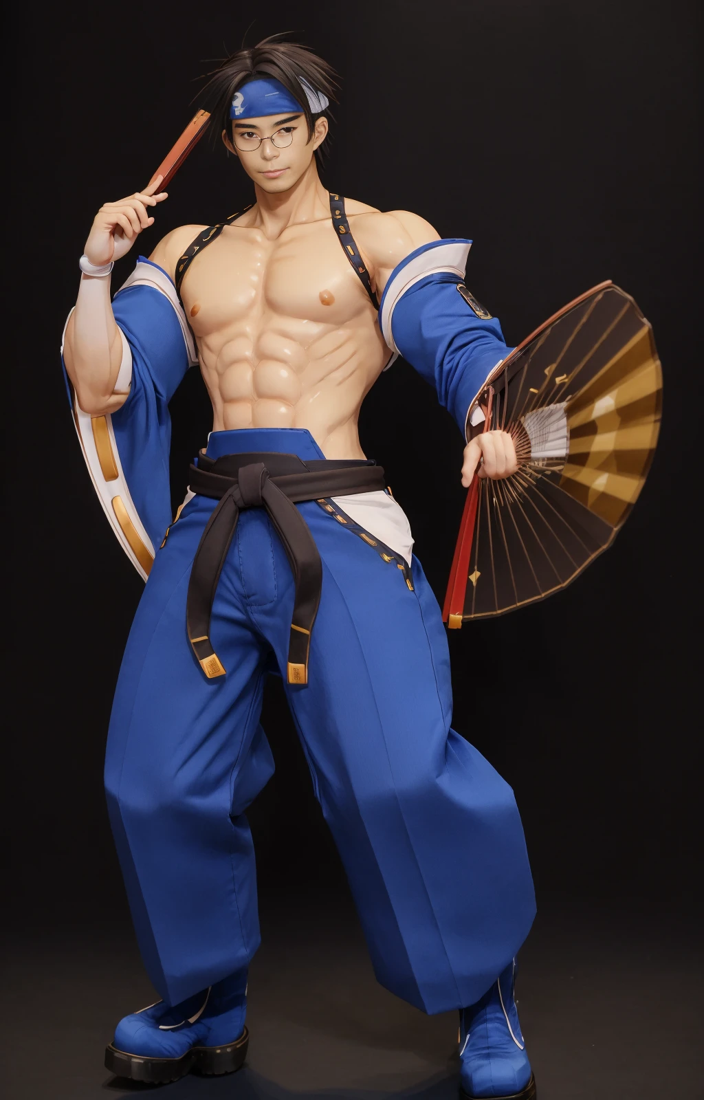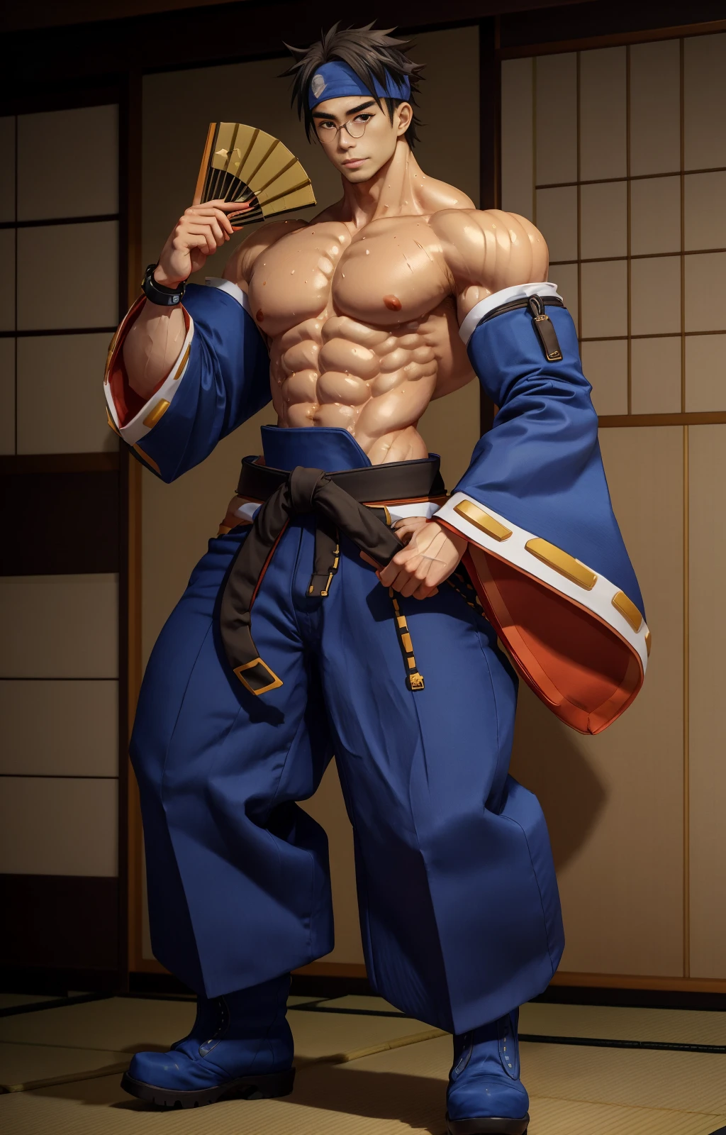 anjimito, japanese pants, long sleeves, belt, abs, big male breats, headband, eyeglasses, nipples, wristbands, spiked hair, japanese boots, fans,